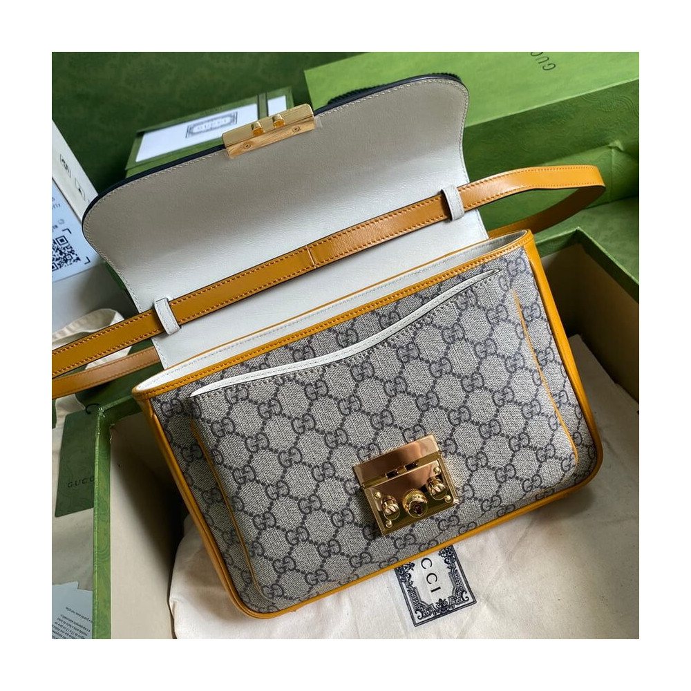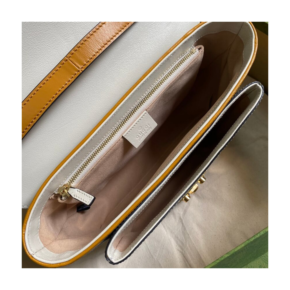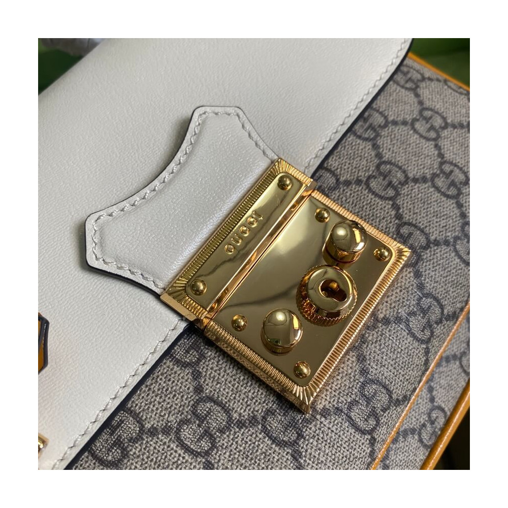 A small structured chain shoulder bag with a key lock closure pulled straight from the archives, the key is placed in a leather key case. A heritage material, the GG Supreme canvas deepens the accessory’s connection to the House’s history. Smooth leather details complete the style.