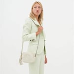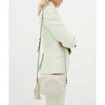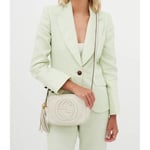 A compact shoulder bag with a leather tassel zipper pull. Sized to fit the necessities. Made in our light, natural grain leather.