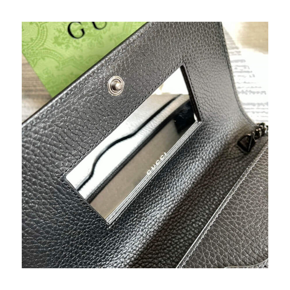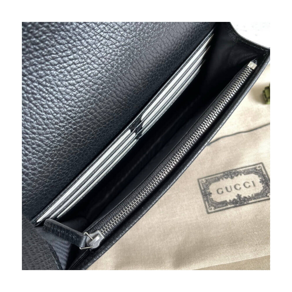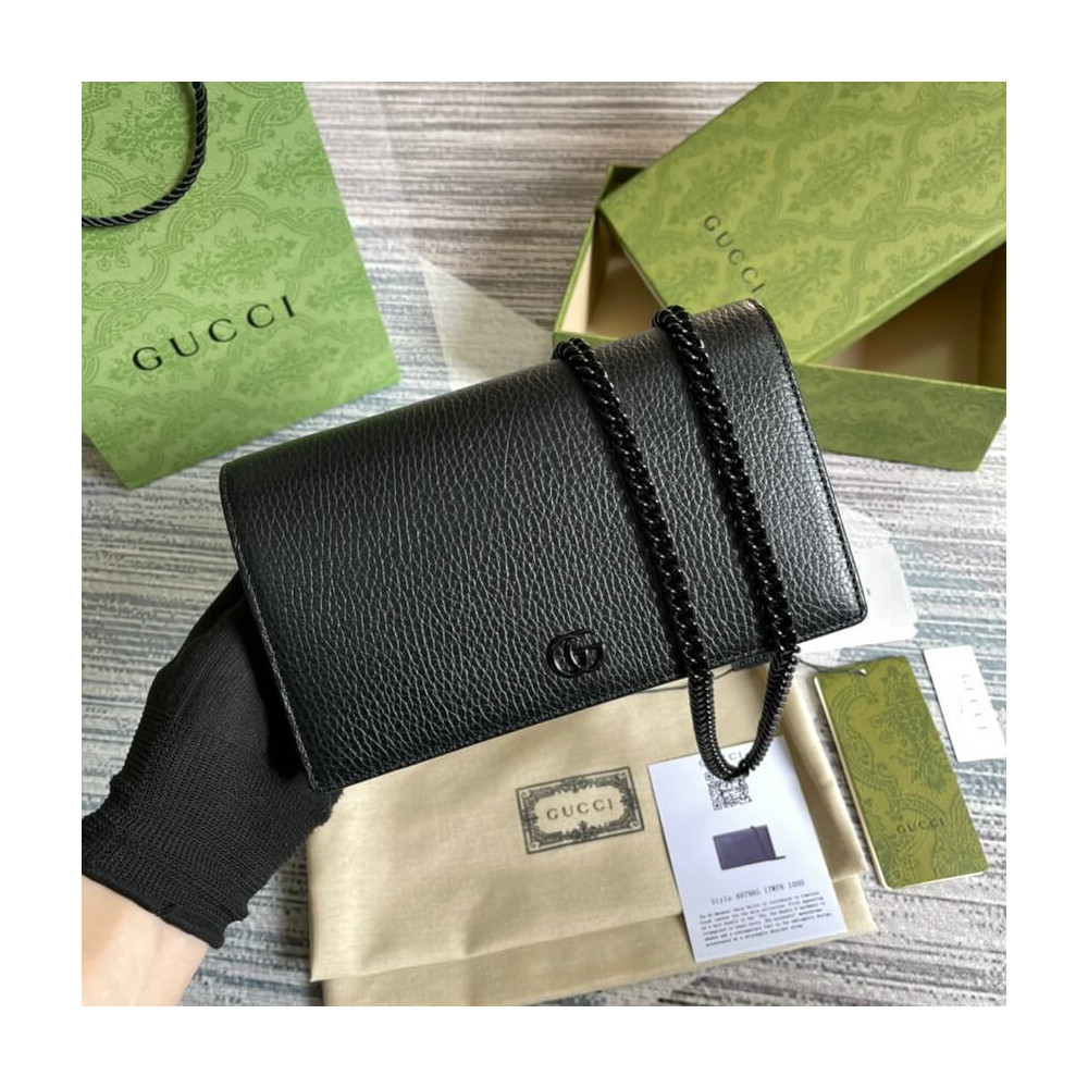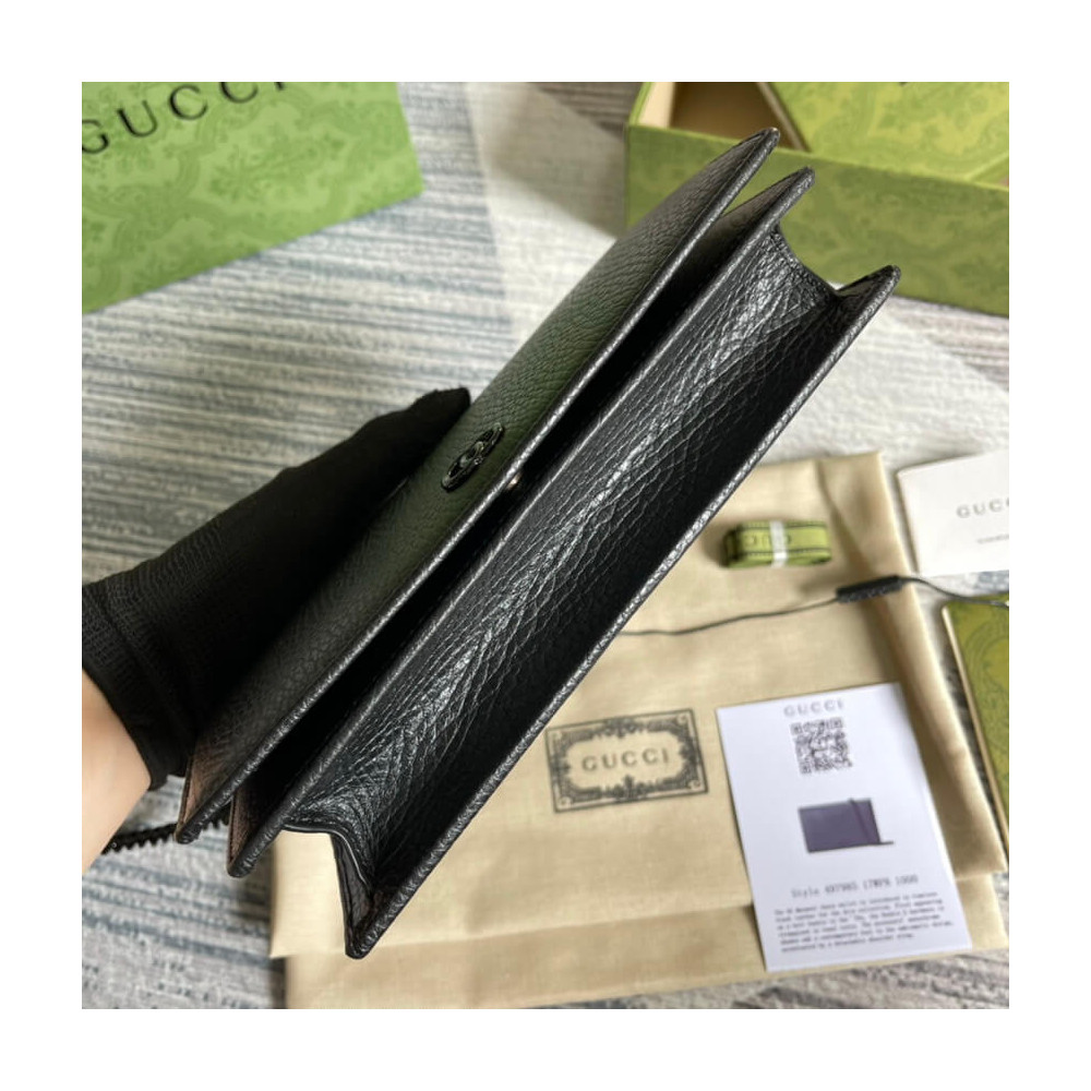 The GG Marmont chain wallet is introduced in timeless black leather for the Aria collection. First appearing as a belt buckle in the ’70s, the Double G hardware is reimagined in tonal resin. The accessory’ monochrome shades add a contemporary feel to the emblematic design, accentuated by a detachable shoulder strap.