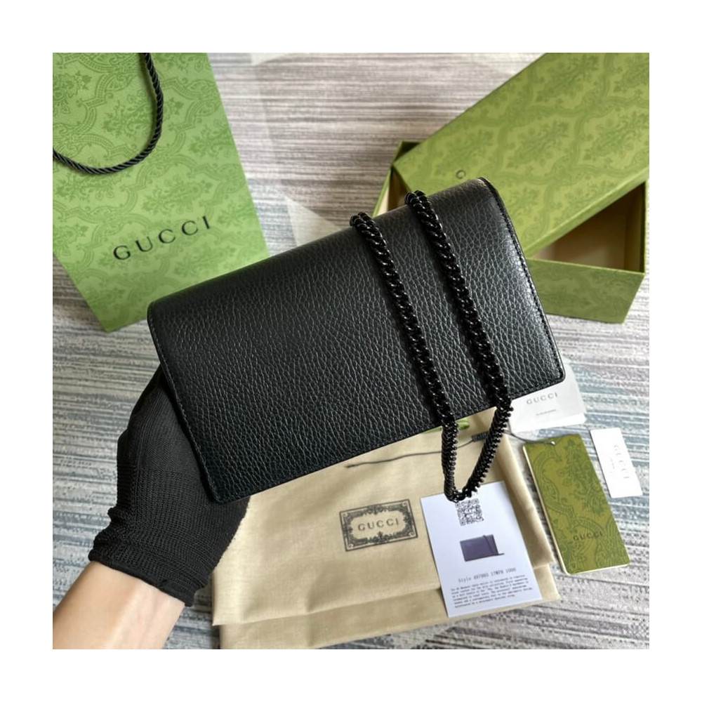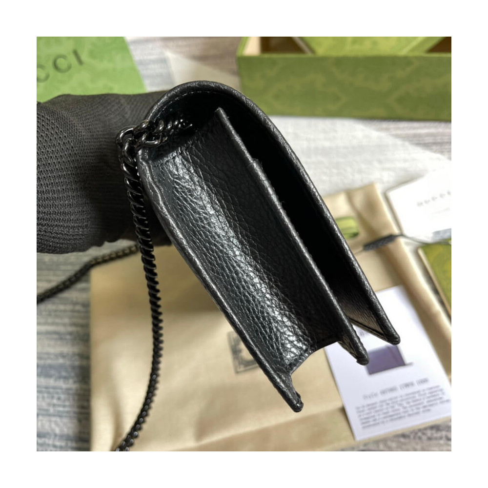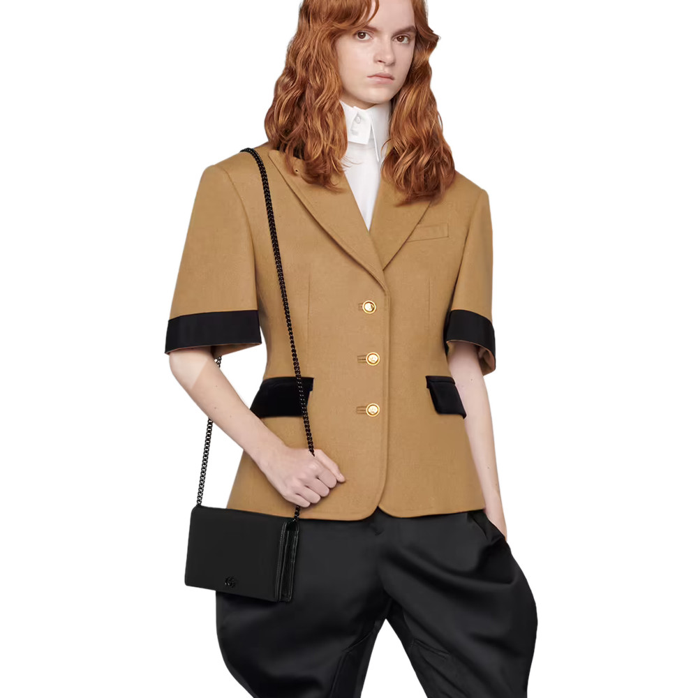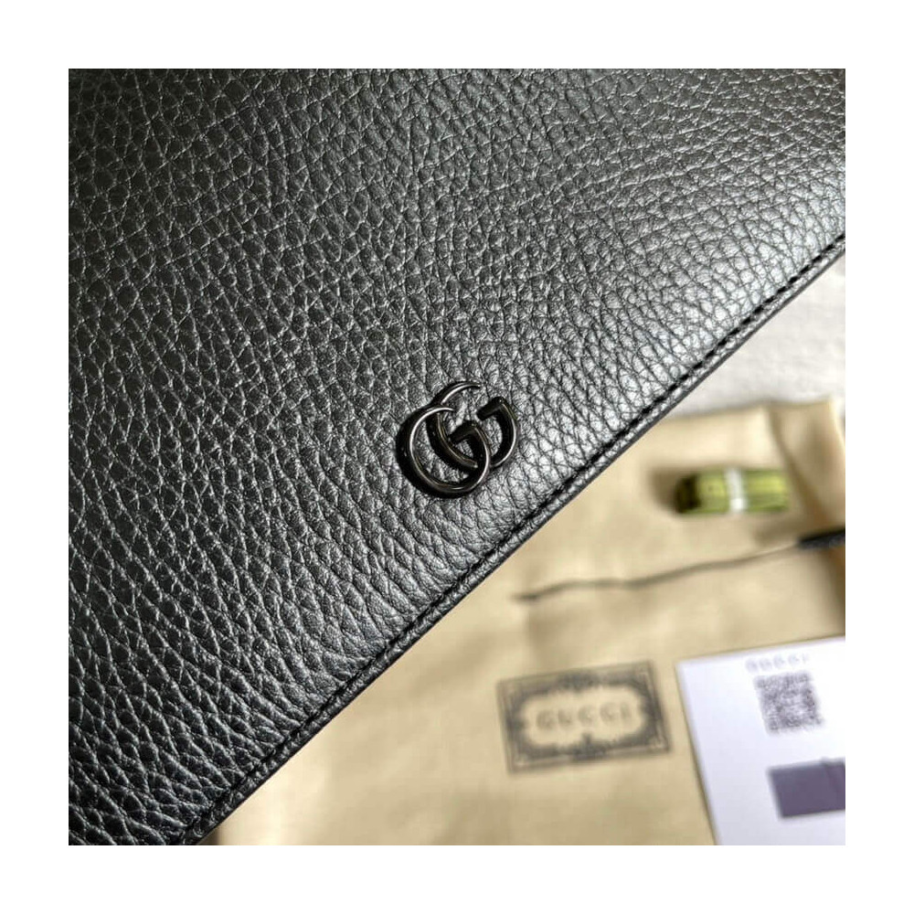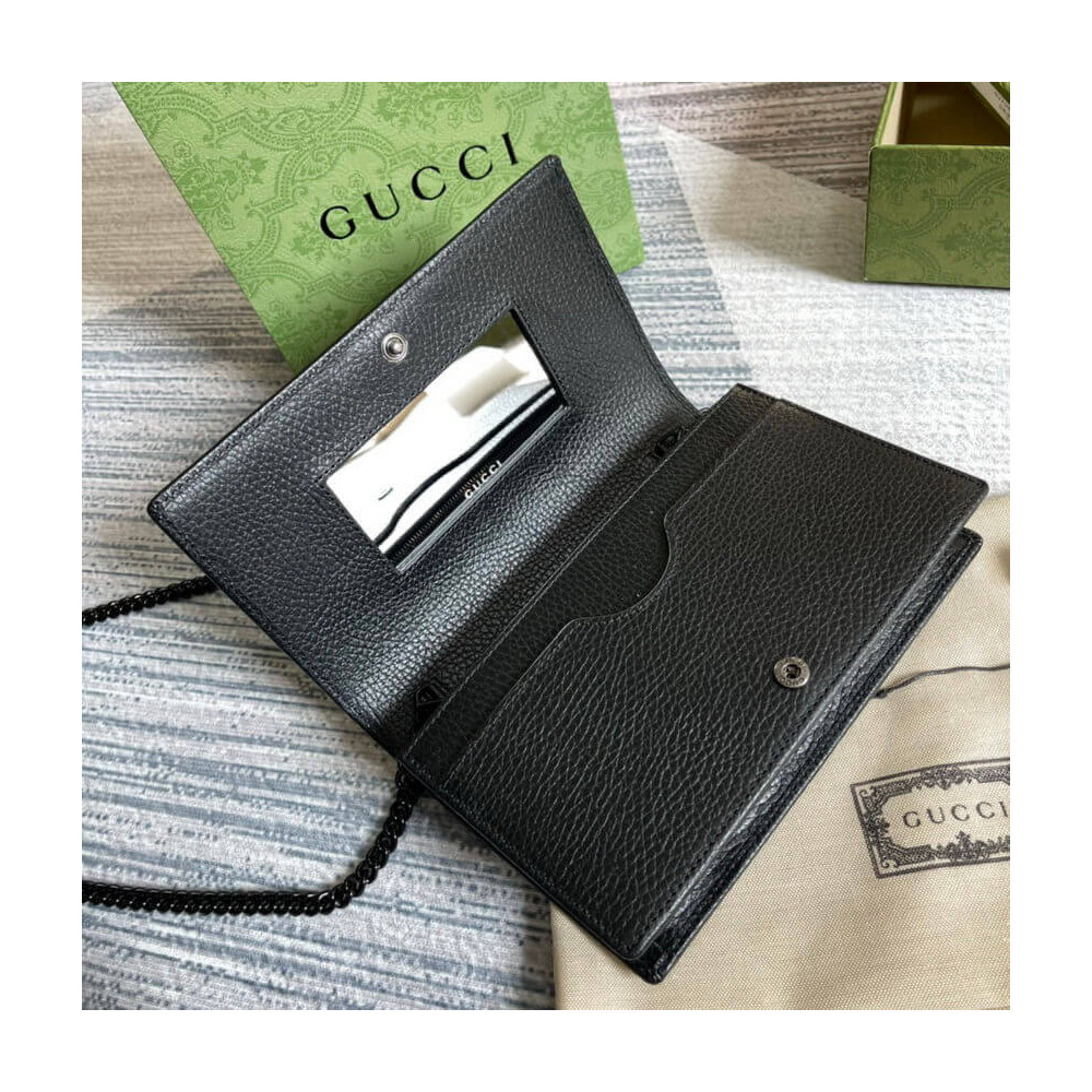 The GG Marmont chain wallet is introduced in timeless black leather for the Aria collection. First appearing as a belt buckle in the ’70s, the Double G hardware is reimagined in tonal resin. The accessory’ monochrome shades add a contemporary feel to the emblematic design, accentuated by a detachable shoulder strap.