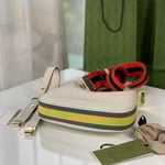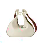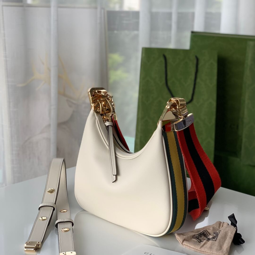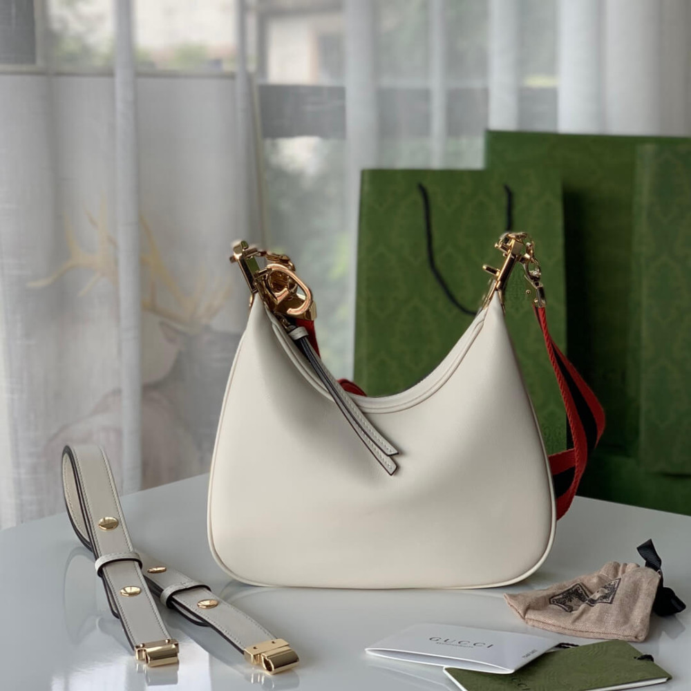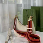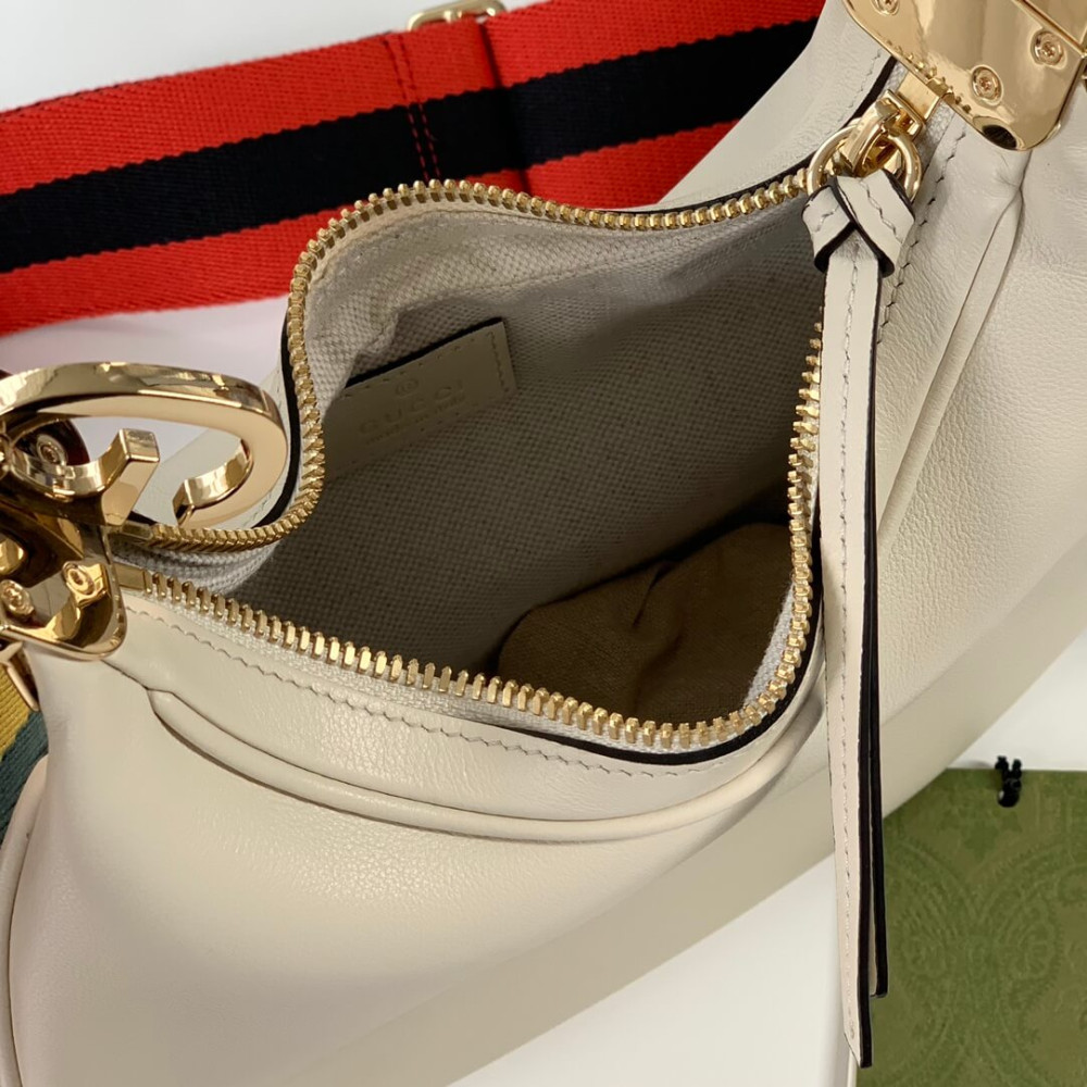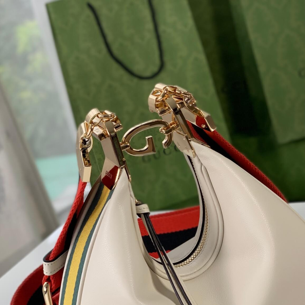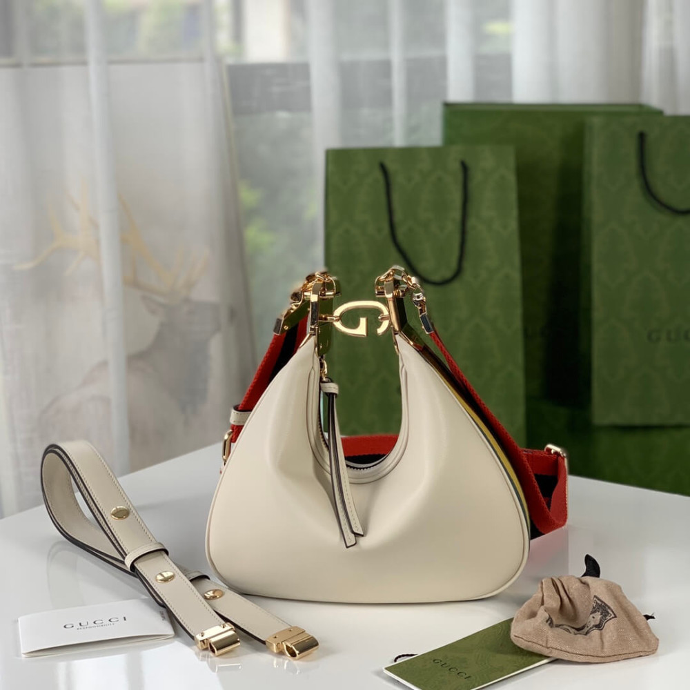 An ode to the timeless Hollywood glamour that shaped Gucci Love Parade, classic elements from the House’s archives are reintroduced. Distinguished by its crescent moon shape, the accessory is further defined by a G shaped hook closure. Paired with soft materials, the heritage hardware creates a refined design with vintage appeal. This small version is crafted in black leather with orange and black Web trim.