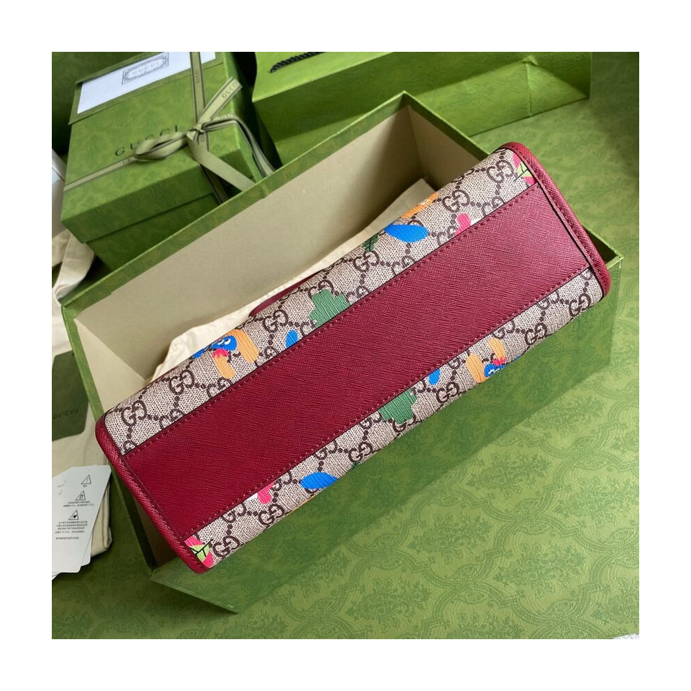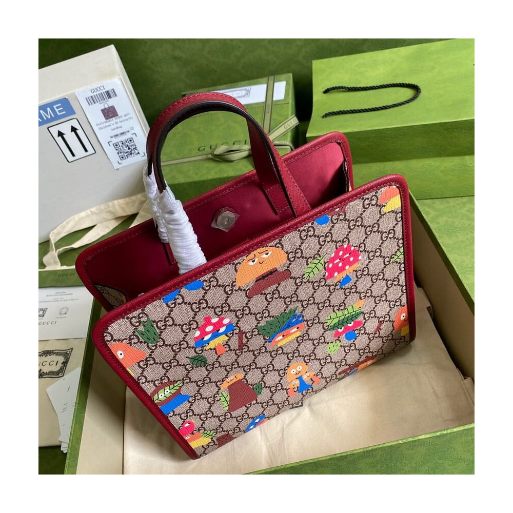 Children’s storybooks continue to inspire the House. Here. this children’s tote bag pairs the GG monogram motif with a cartoon-inspired woodland print. The joyful pattern features plants from the forest as dancing characters.