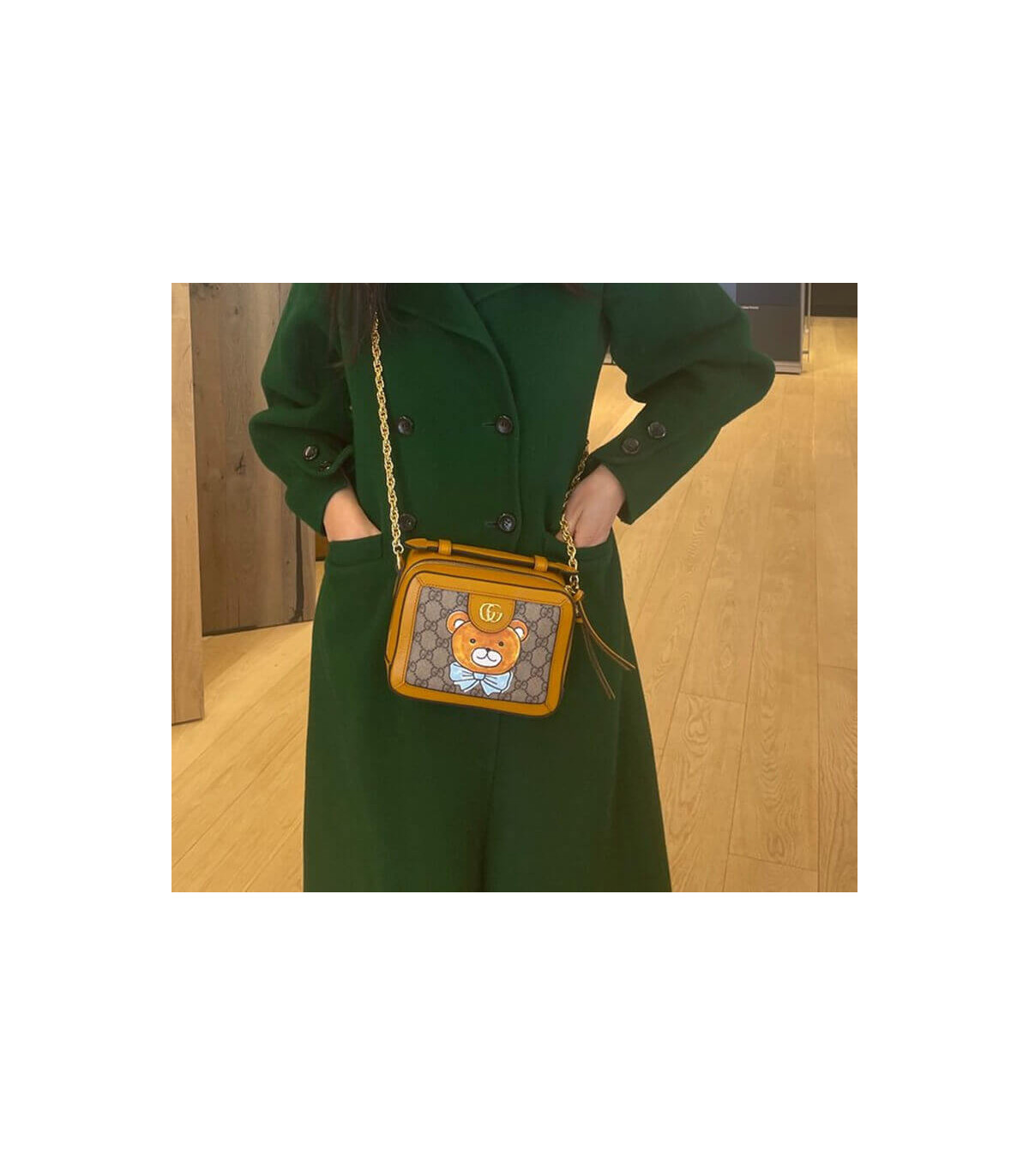 K-pop singer, performer and actor Kai inspires a line-up of ready-to-wear and accessories. His favorite animal, the teddy bear, mixes a strong association with pop culture and vintage influences for a whimsical design. Here, the teddy bear defines the Ophidia shoulder bag.
