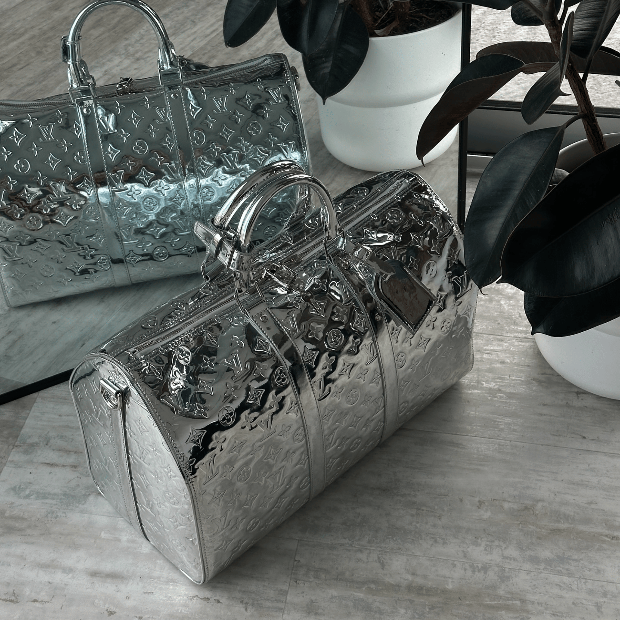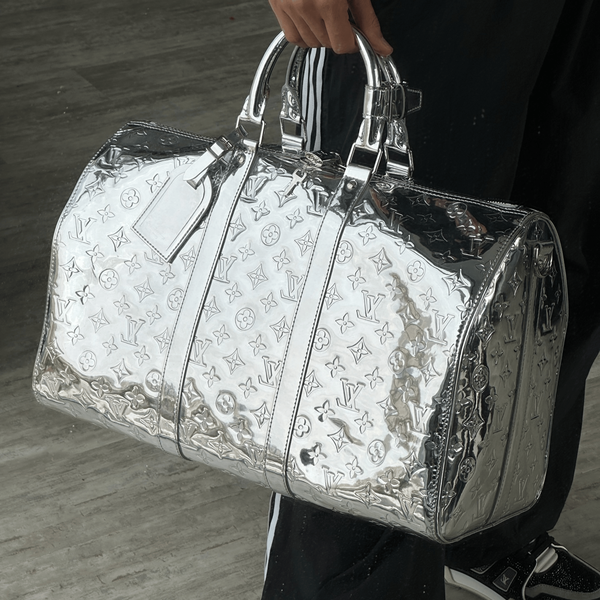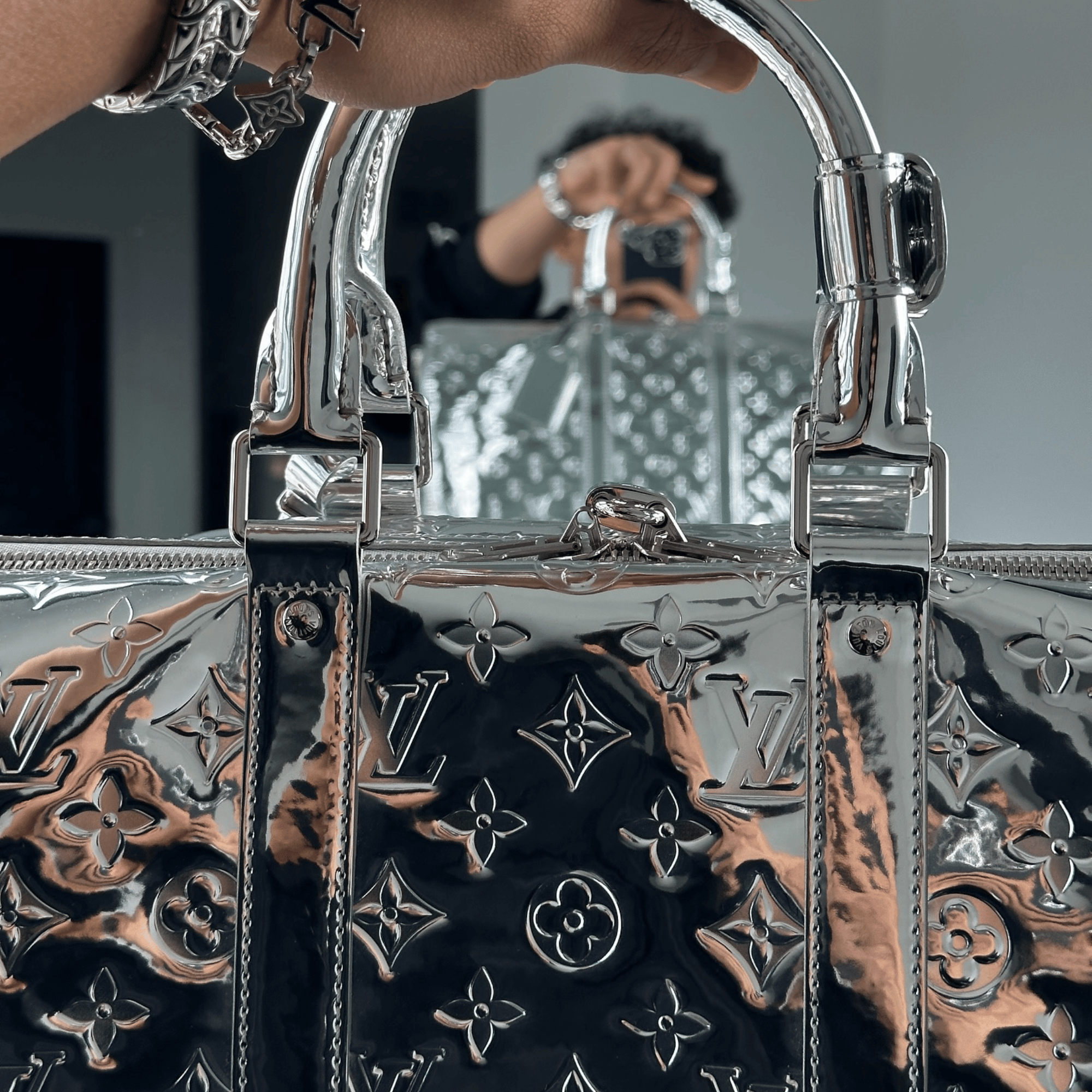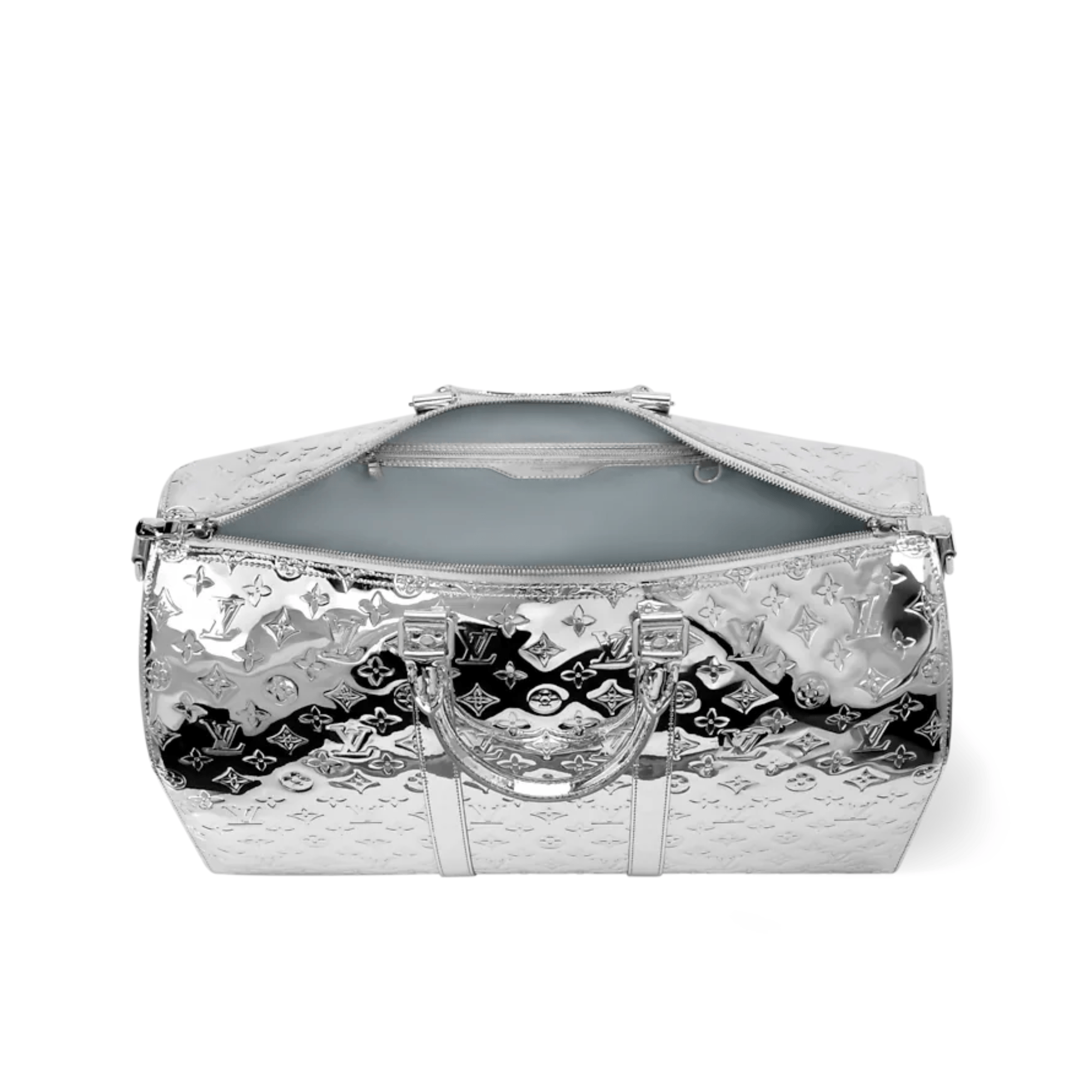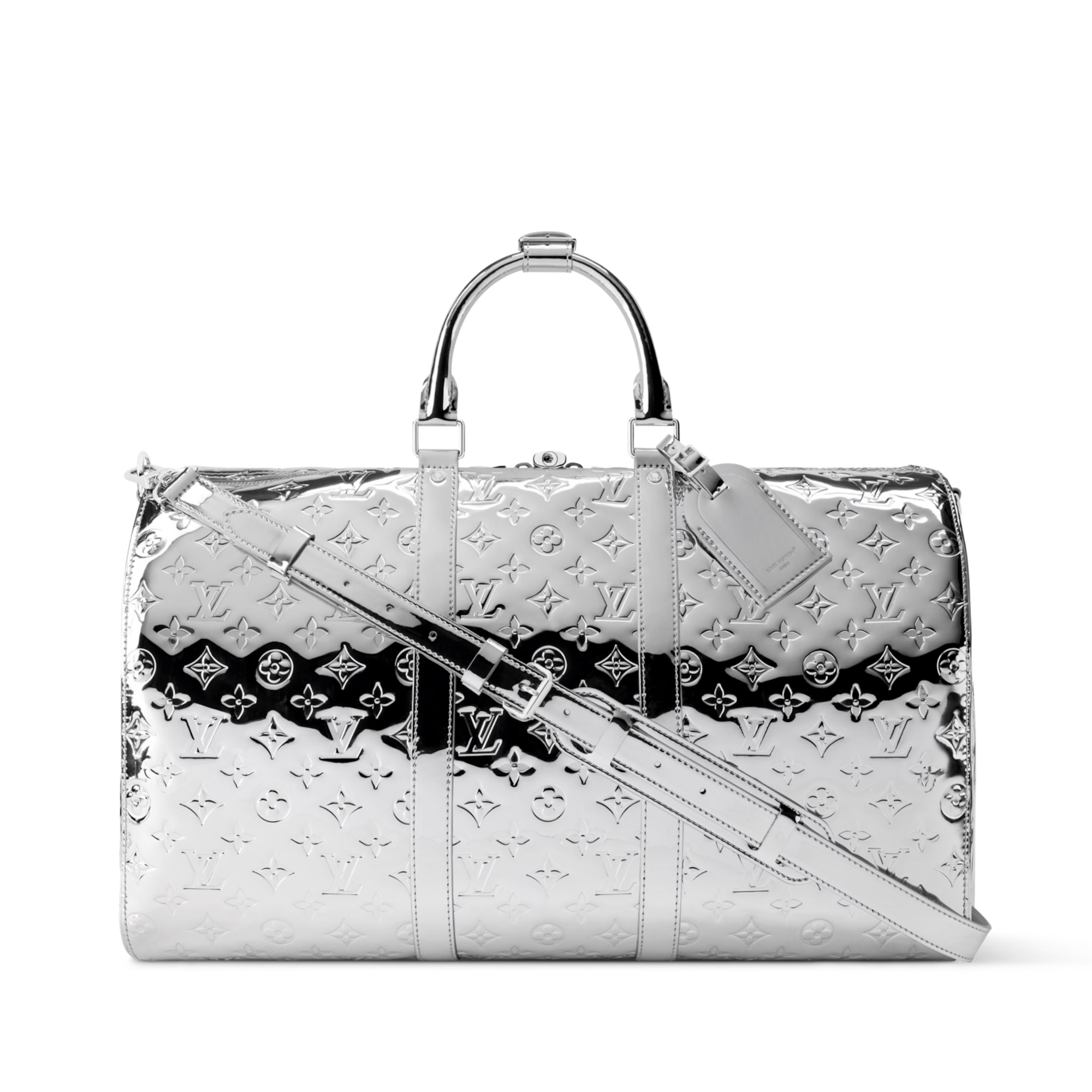 The classic Keepall Bandoulière 50 takes on a space-age feel in Monogram Miroir canvas, a particularly sturdy material thanks to an added layer of mirror-effect laminate. Lined in gray mesh, the interior includes a zipped pocket to keep valuables secure. In addition to top handles, it features a detachable, adjustable shoulder strap for versatile carry options.