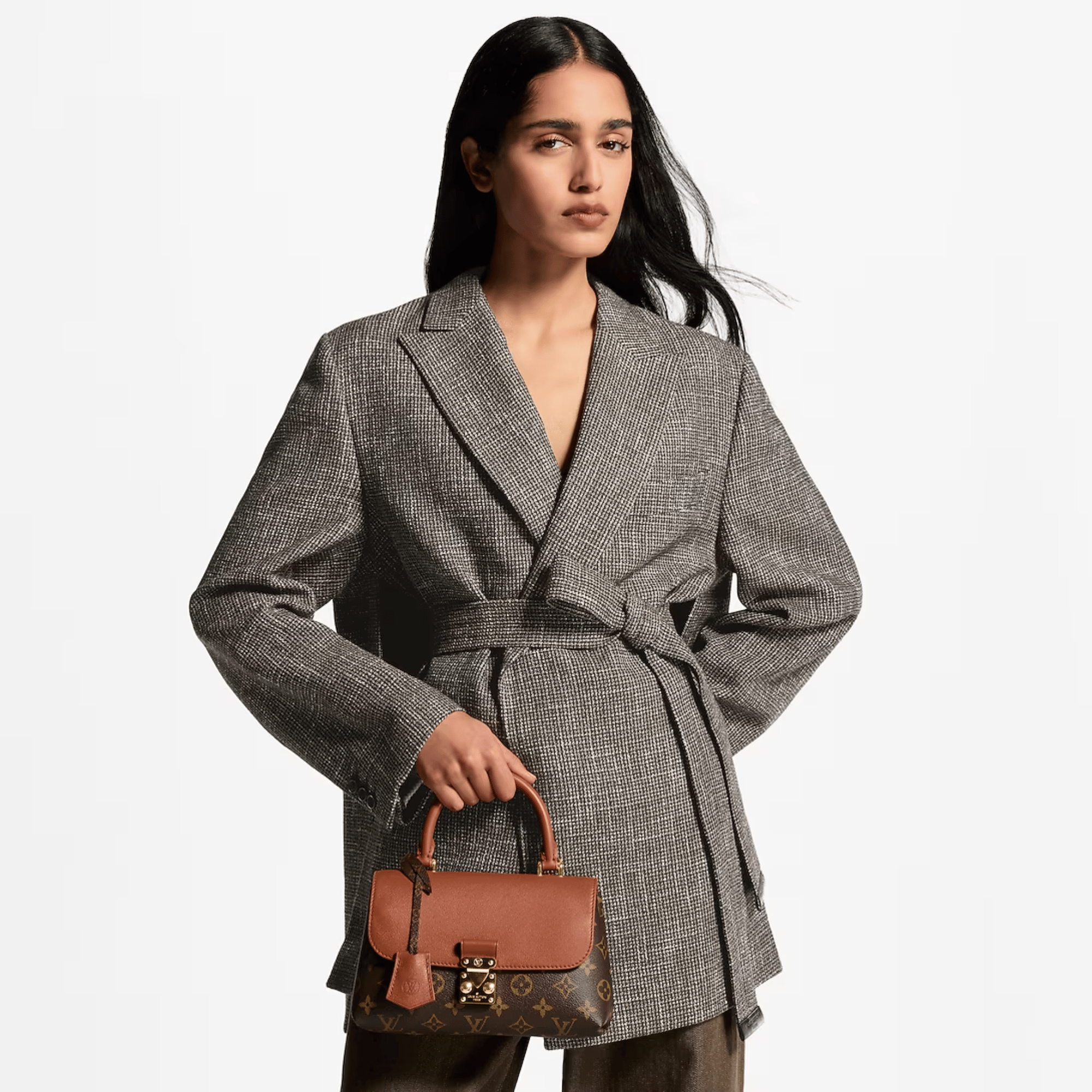 It is crafted from canvas elevated with the iconic emblematic pattern and features smooth leather trims along the flap, handle and signature name tag. The sleek gold-toned S-lock pays tribute to the Louis Vuitton archives, lending a polished finish.