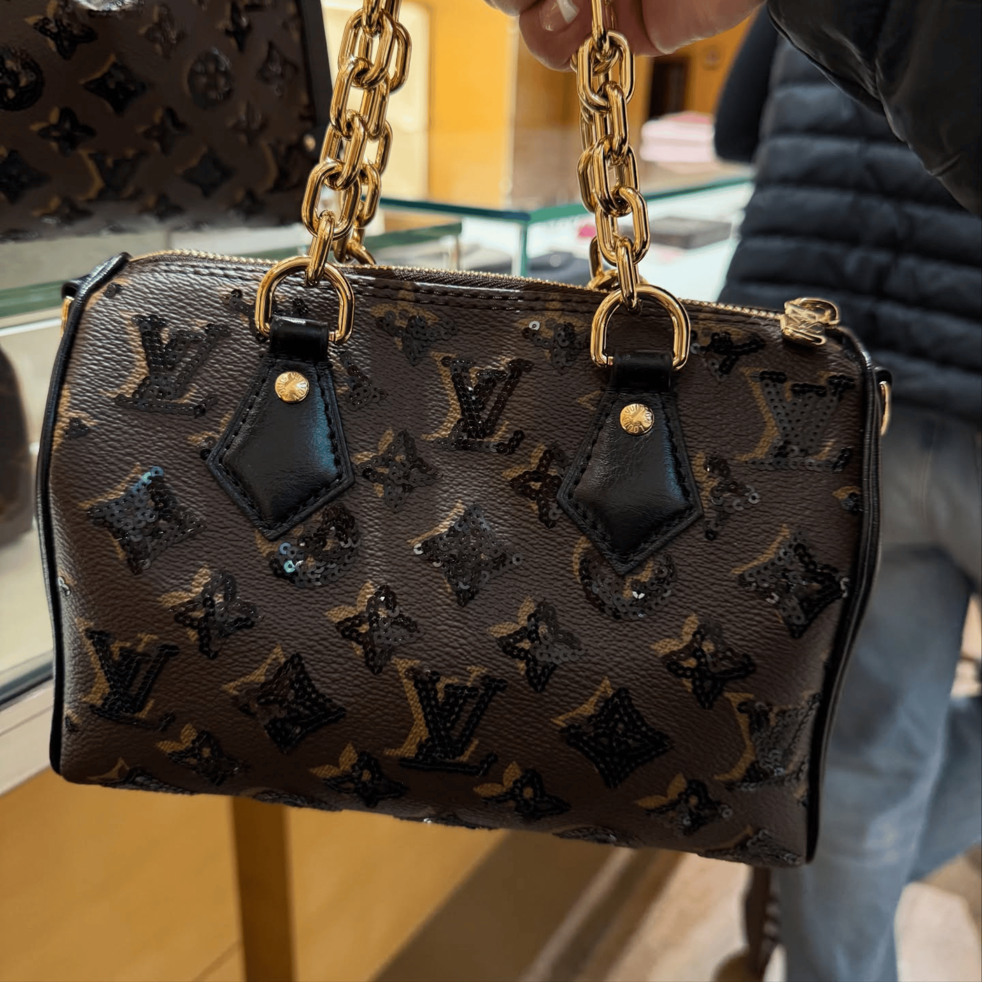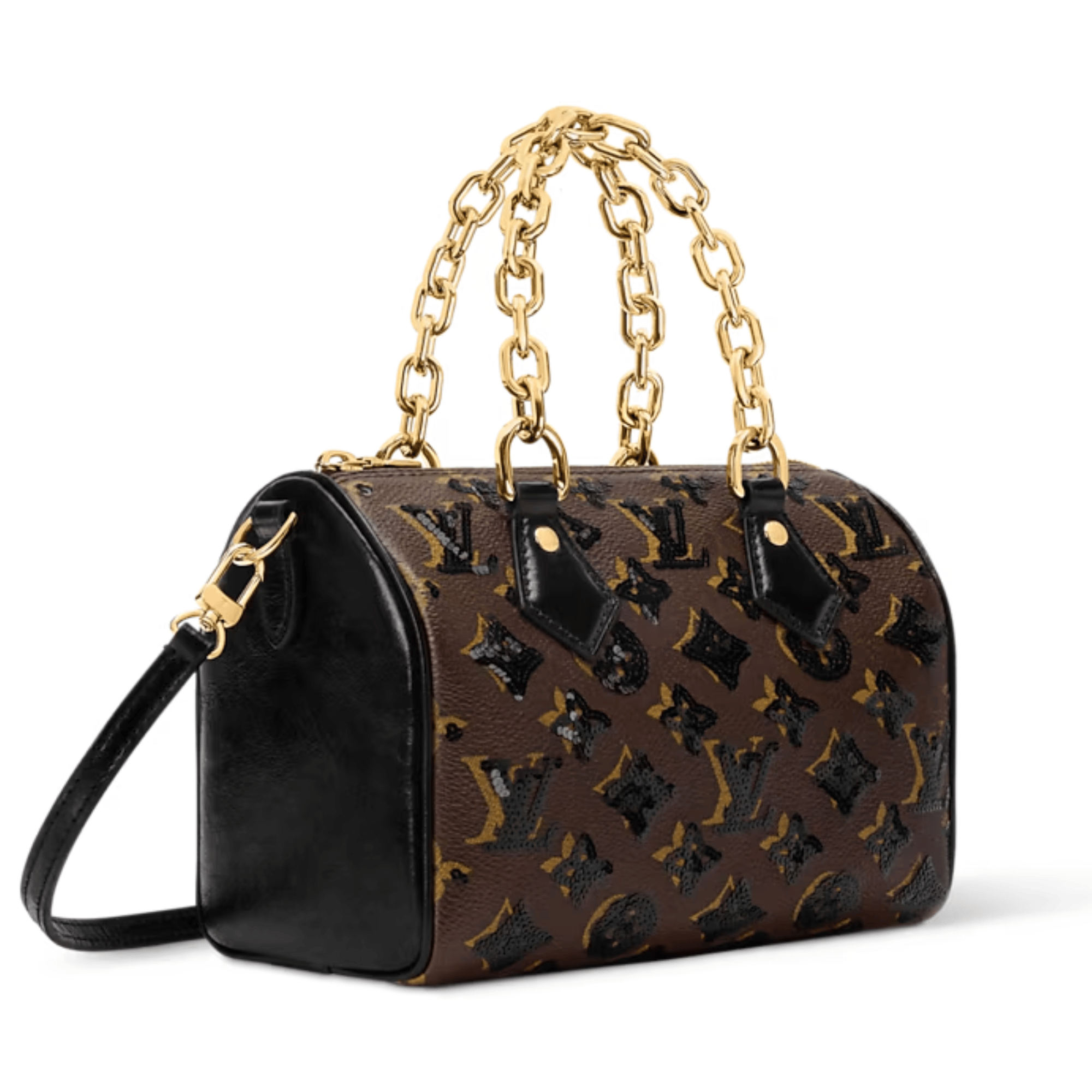 Crafted from canvas and accented with shimmering black sequins for an eclipse effect, this delicate piece features a wide gold chain and leather shoulder strap for a sophisticated crossbody style.