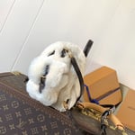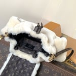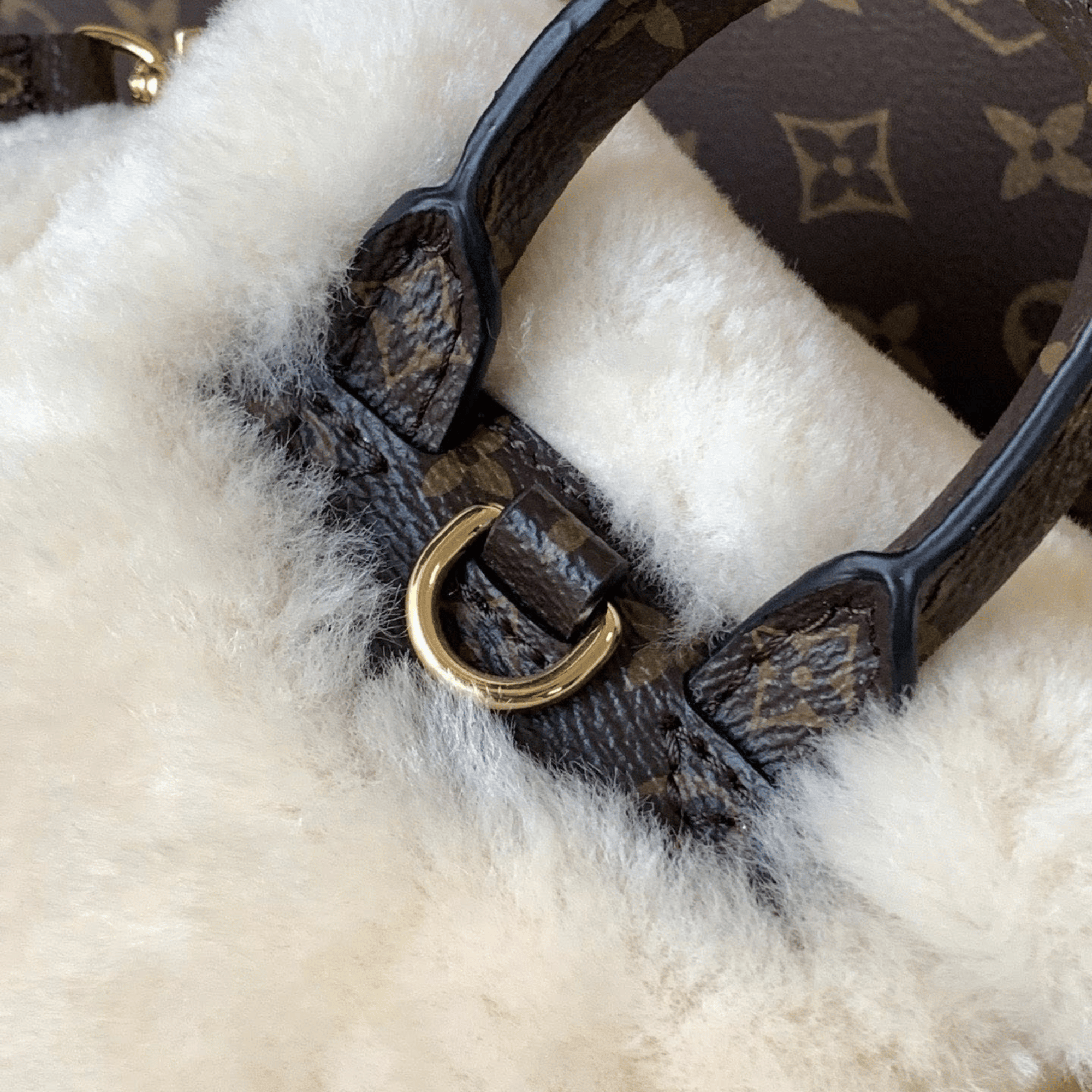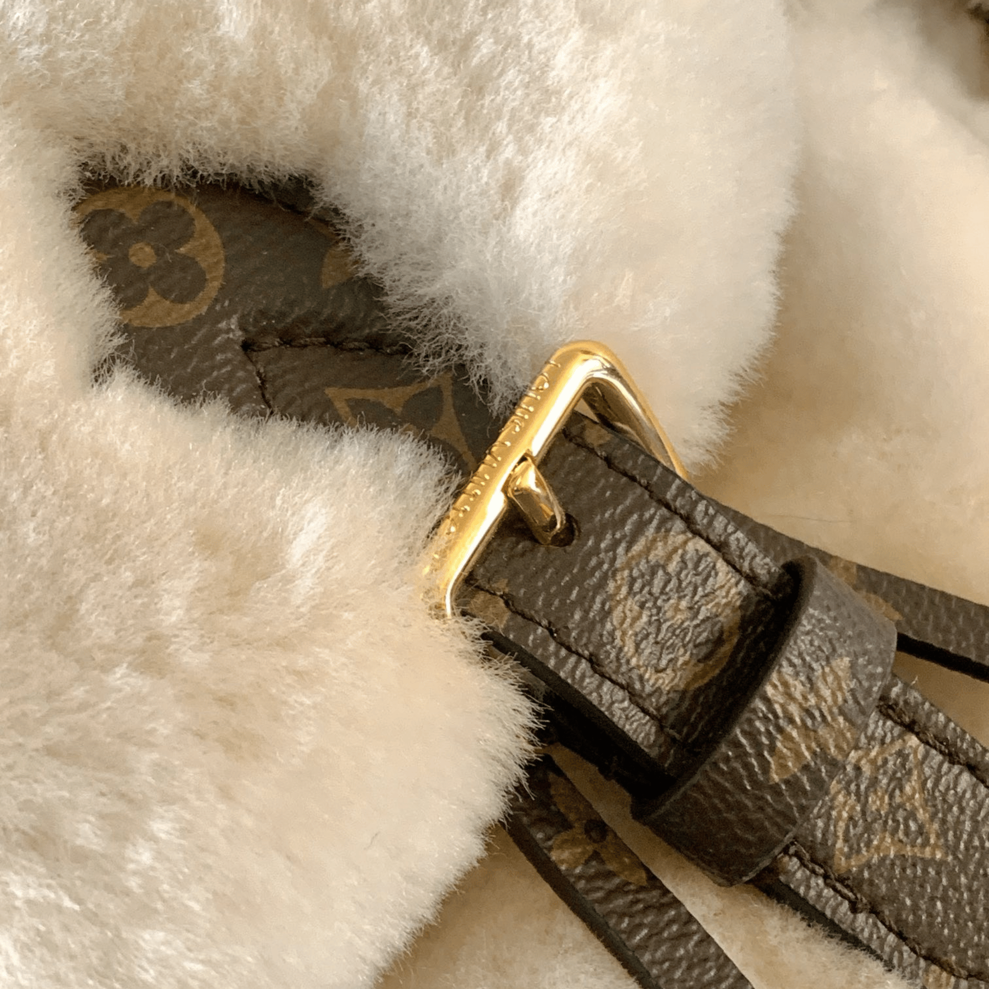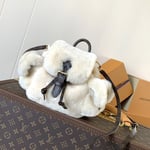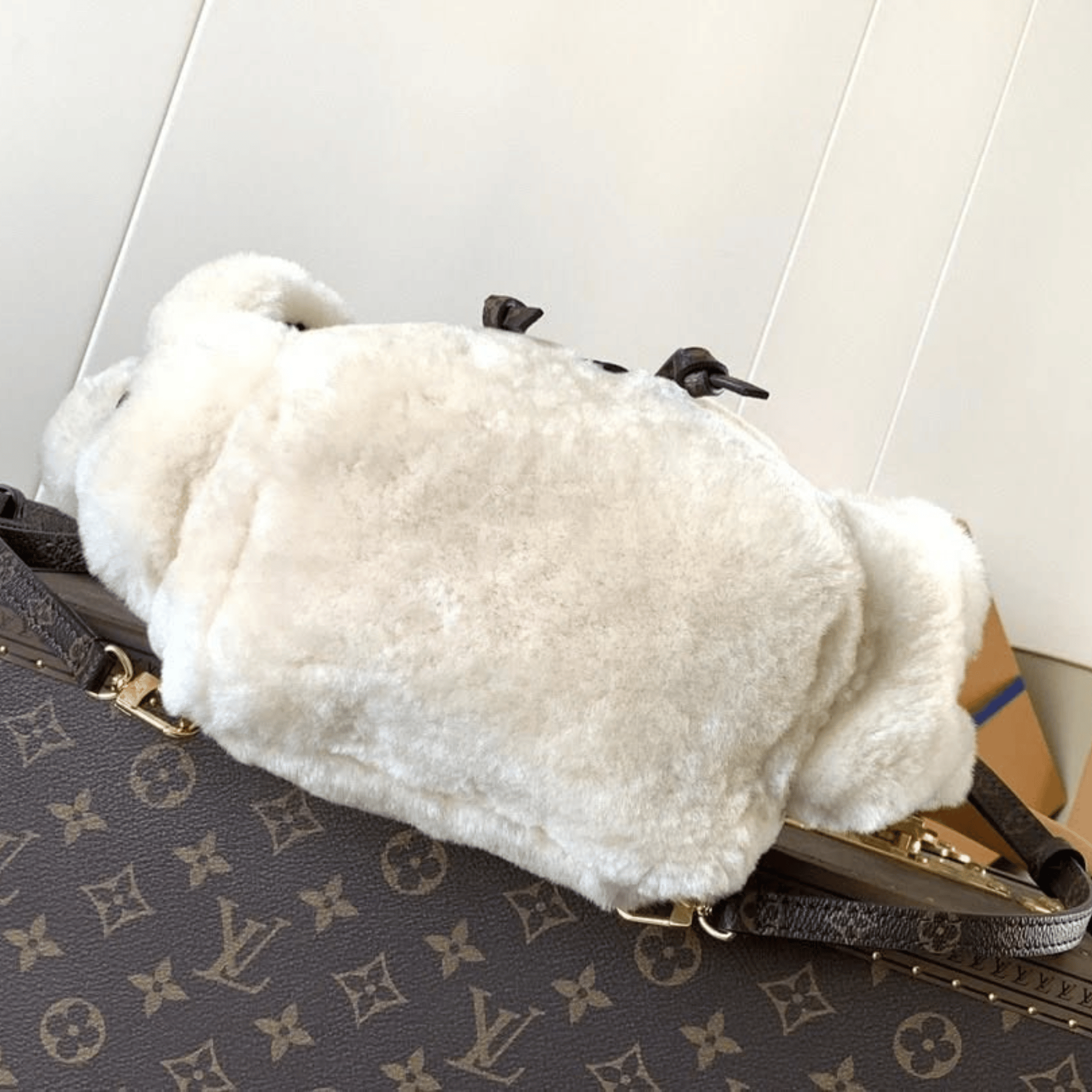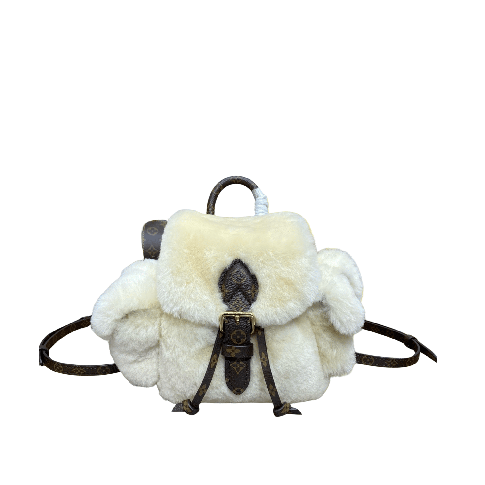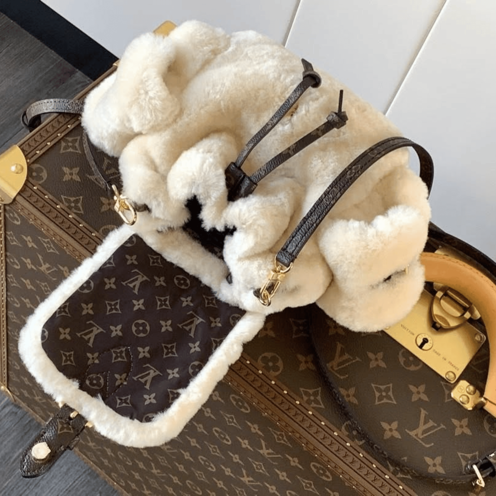 A cozy and stylish backpack featuring soft fur and classic monogram leather accents, perfect for a chic winter look.