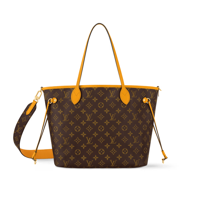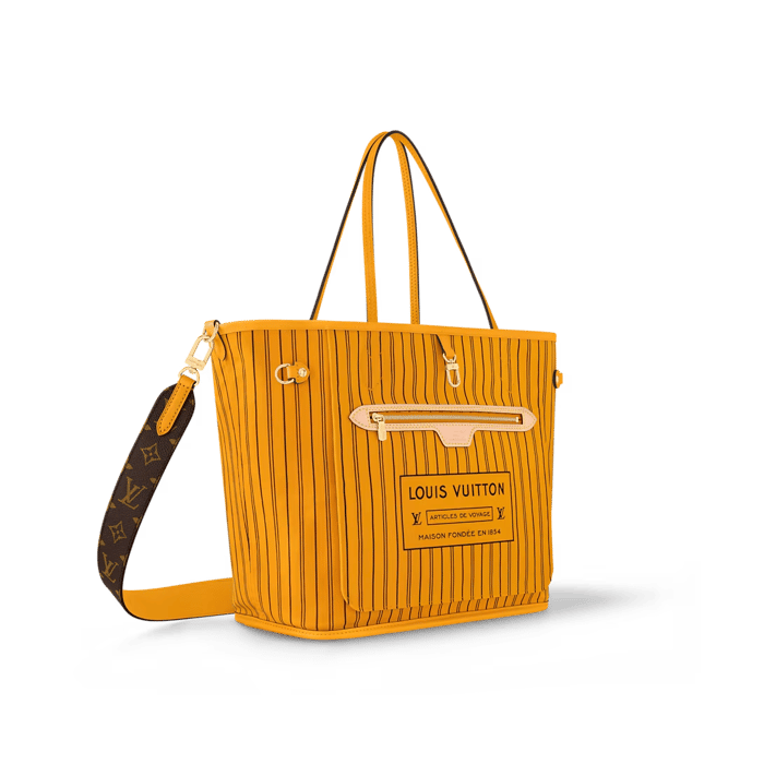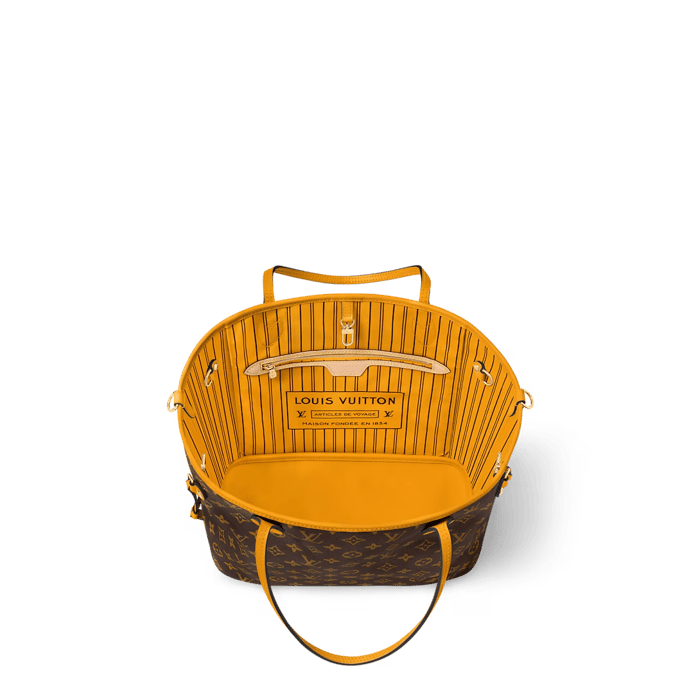 This new edition of the Neverfull Bandoulière Inside Out MM tote with matching color trims strikes the balance of timeless and contemporary. This edition is made from Monogram canvas and has a brightly colored textile and leather trimmings for a bold finish. The versatile design features a new strap and is fitted with side hooks that transform the shape into a hobo style.