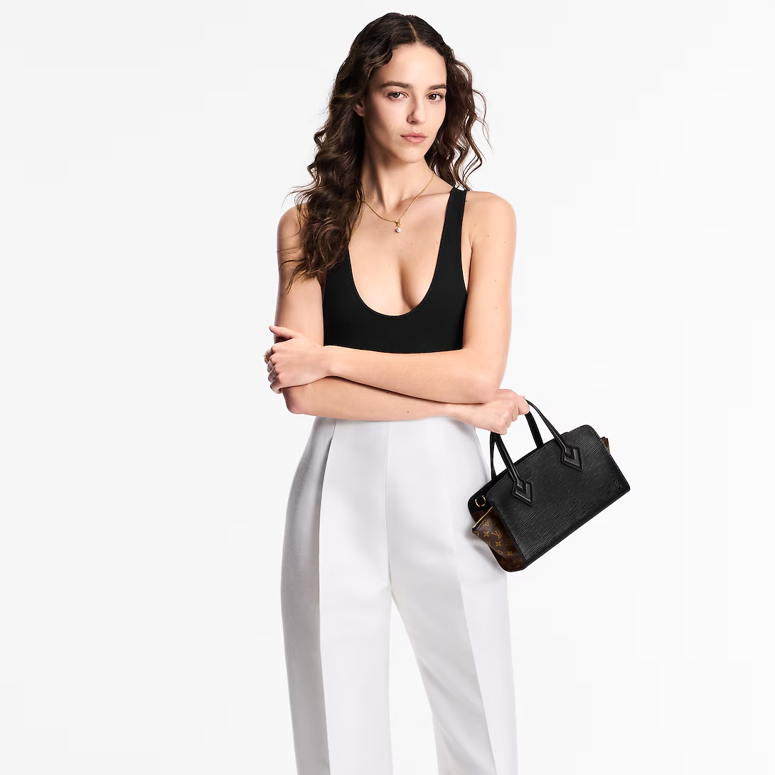 Its horizontal structure and iconic combination of black Epi leather with expandable Monogram canvas gussets create a versatile silhouette perfect for both daywear and evening chic.