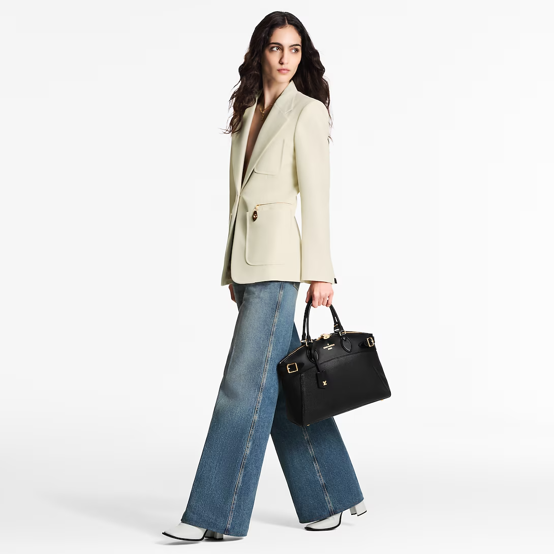 symbol of refined craftsmanship and versatility, the Lock It MM (also known as Vendôme MM) is crafted from luxurious grained Taurillon leather paired with smooth calfskin. Accented with signature gold-tone hardware, this elegant tote is finished with iconic House details including a padlock, key bell, and hot-stamped LV logo.
