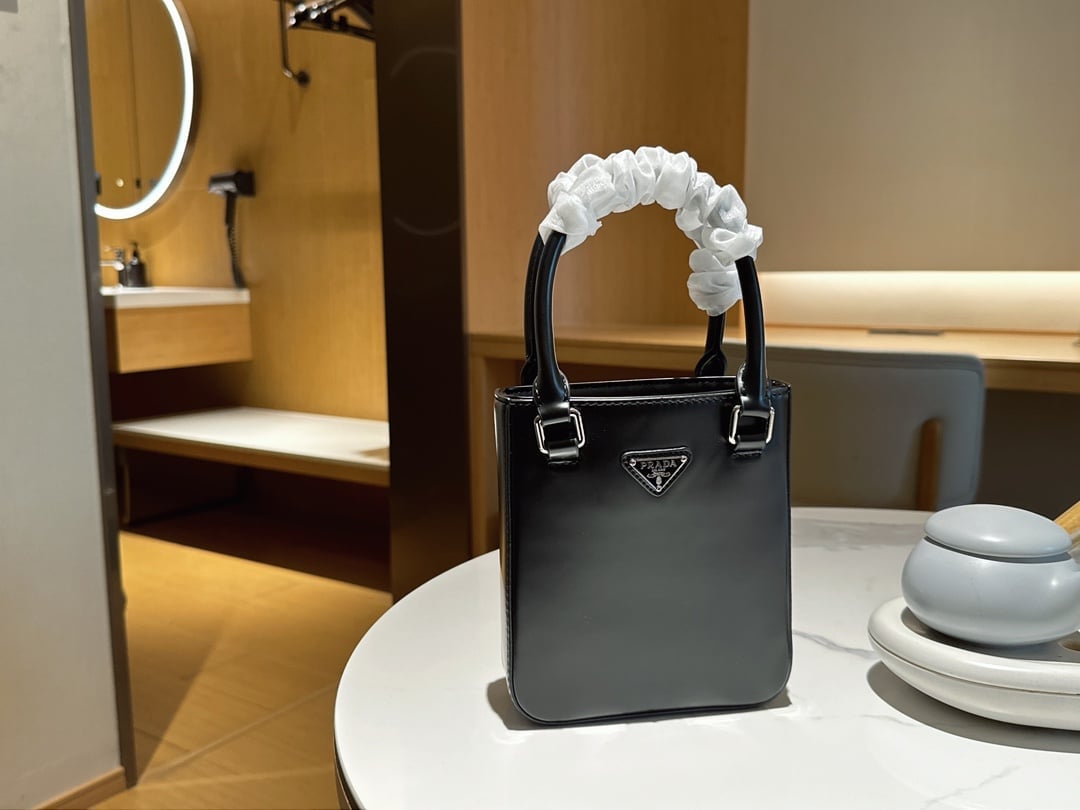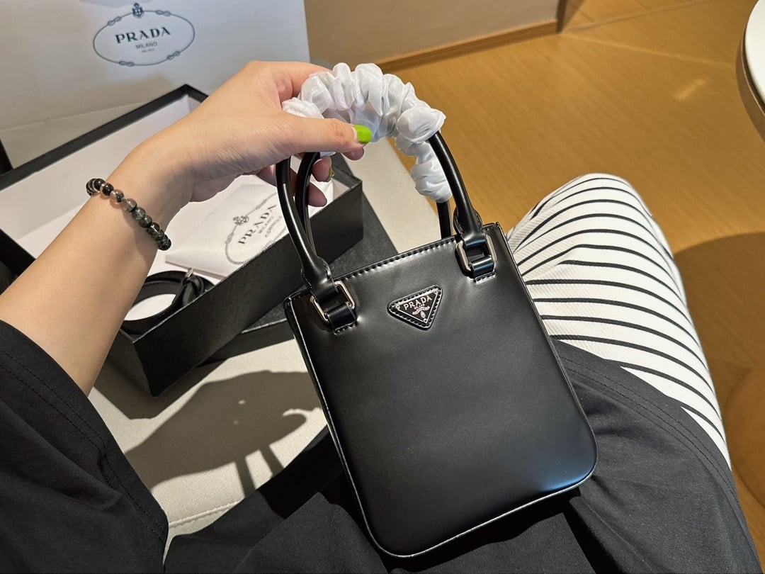 Prada Logo Embellished Leather Cross Body Bag Black 15Cm