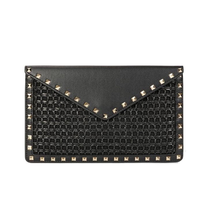 Valentino Garavani Rockstud Raffia Clutch Bag In Black 28Cm