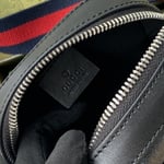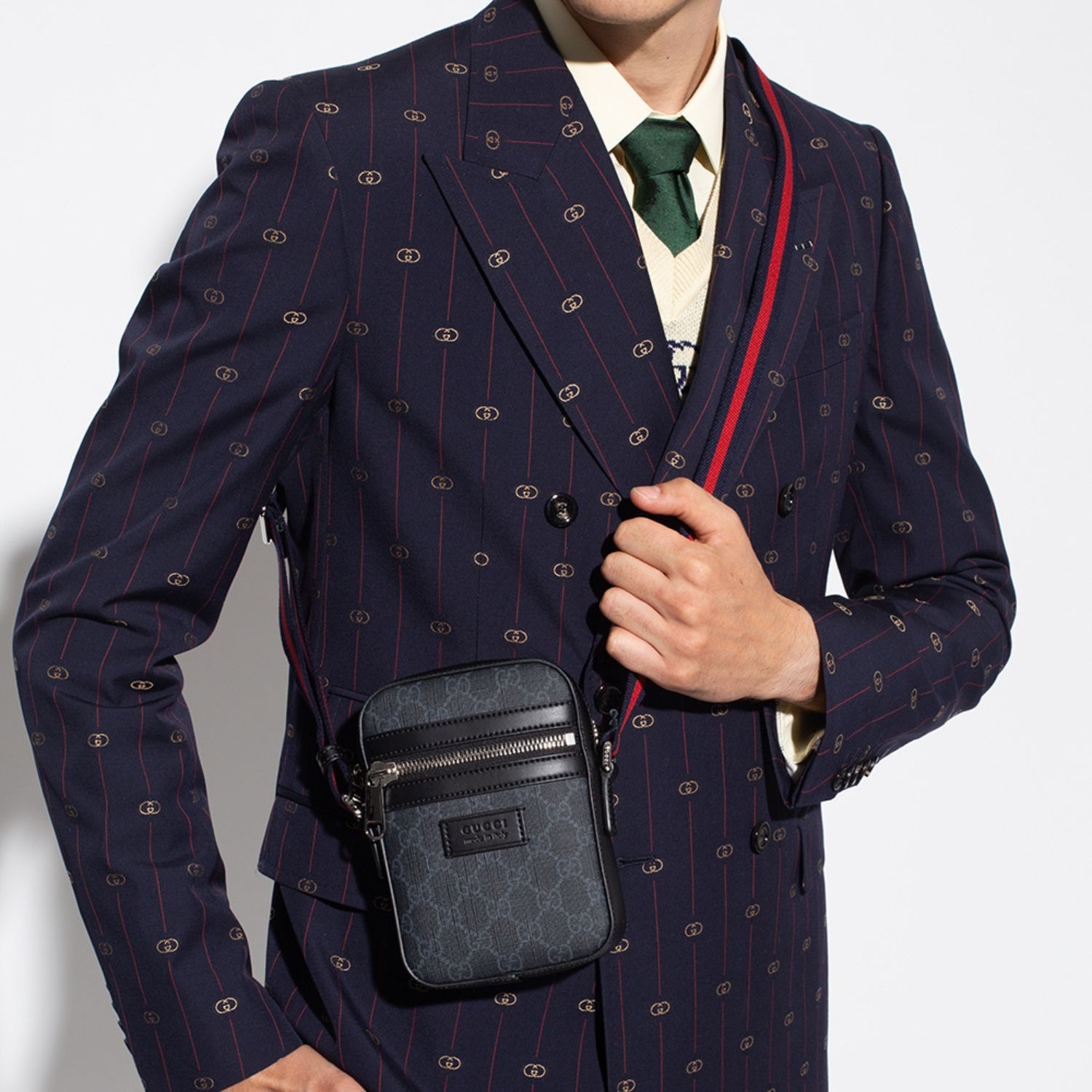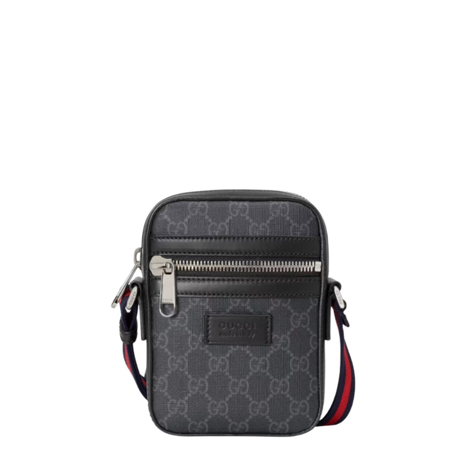 Presented in a black and grey combination, the GG motif takes on a contemporary look in a small messenger with front zip pocket. The design is further enriched with an adjustable nylon strap featuring the Web in blue and red.