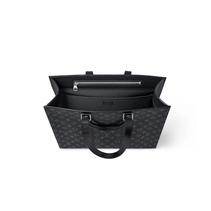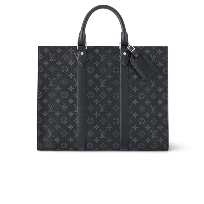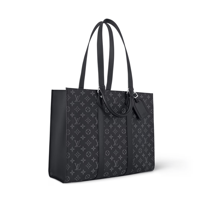 Monogram Eclipse canvas brings masculine elegance to the Sac Plat 24H. Recognizable by its lateral bands, handle mounts, and removable name tag, this tote boasts a large capacity and a mix of zipped and flat pockets, including one large enough for a laptop. It has short handles for hand carry, and long handles for shoulder carry.