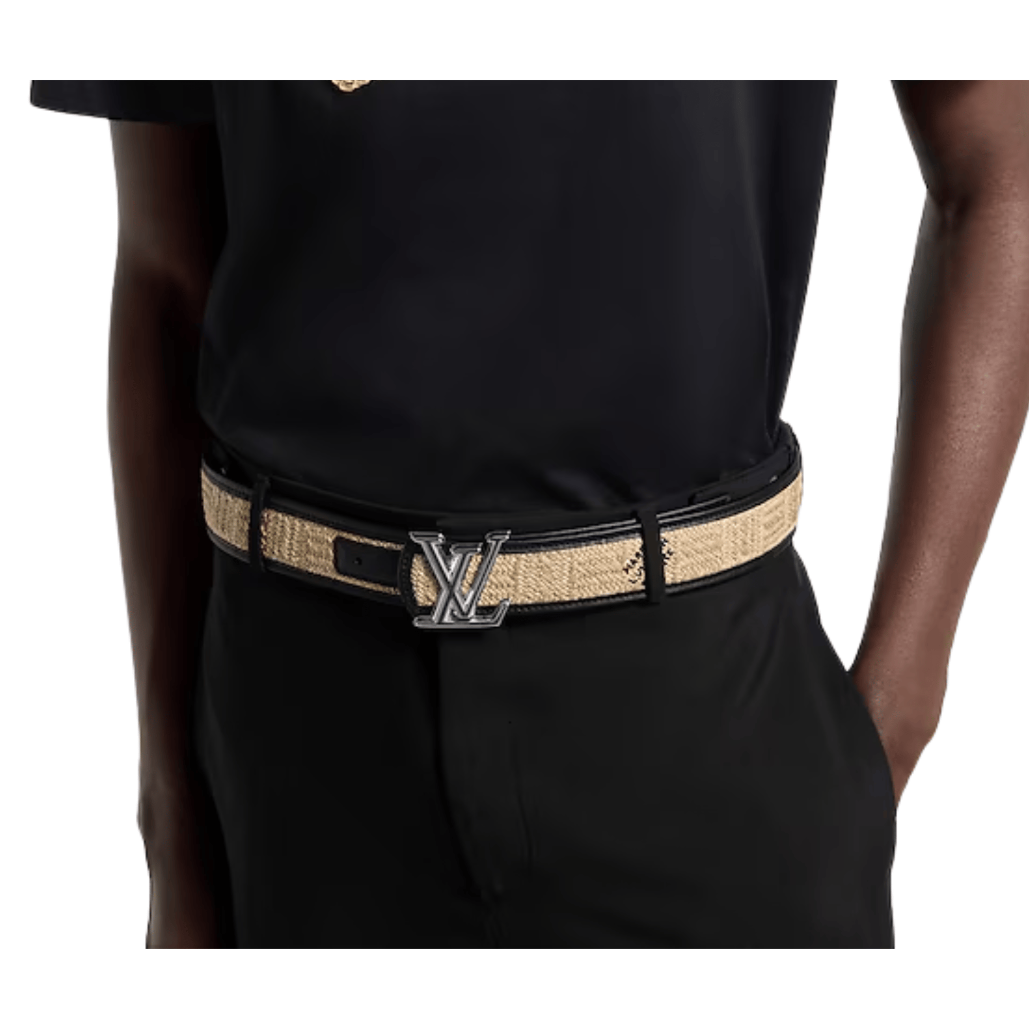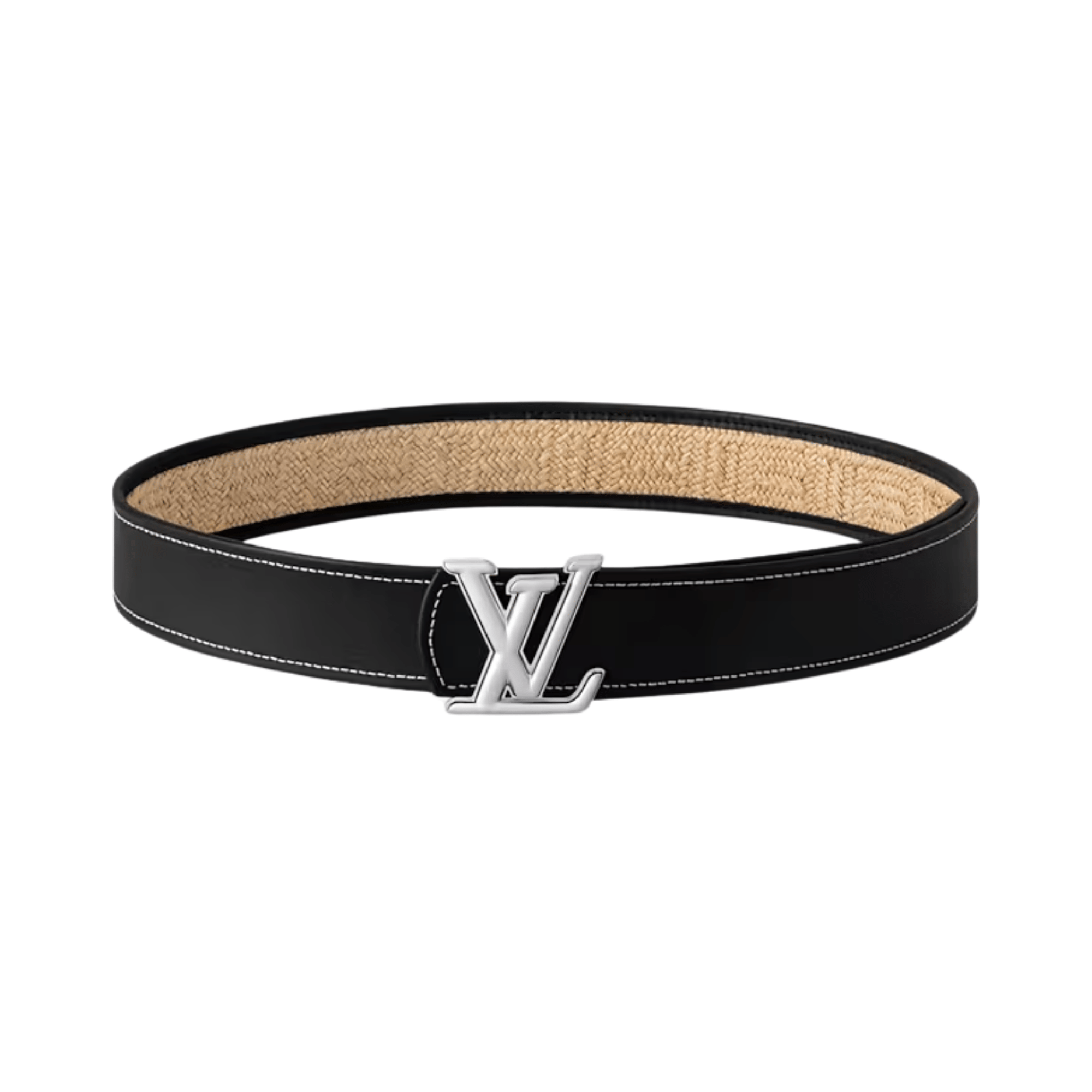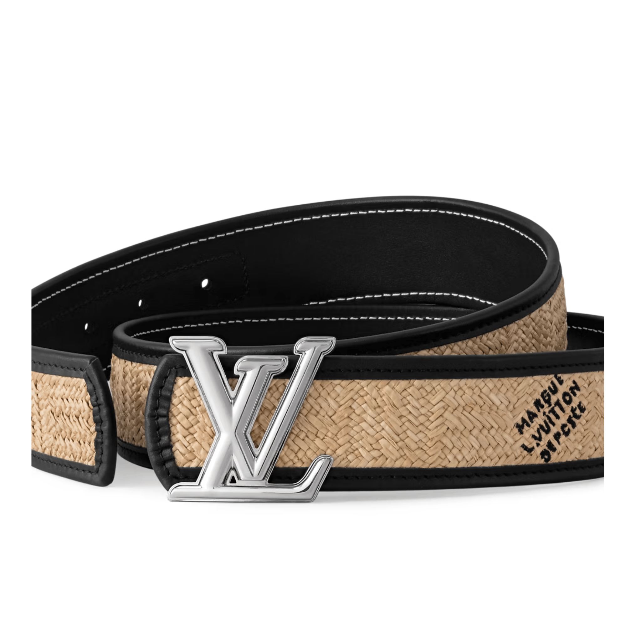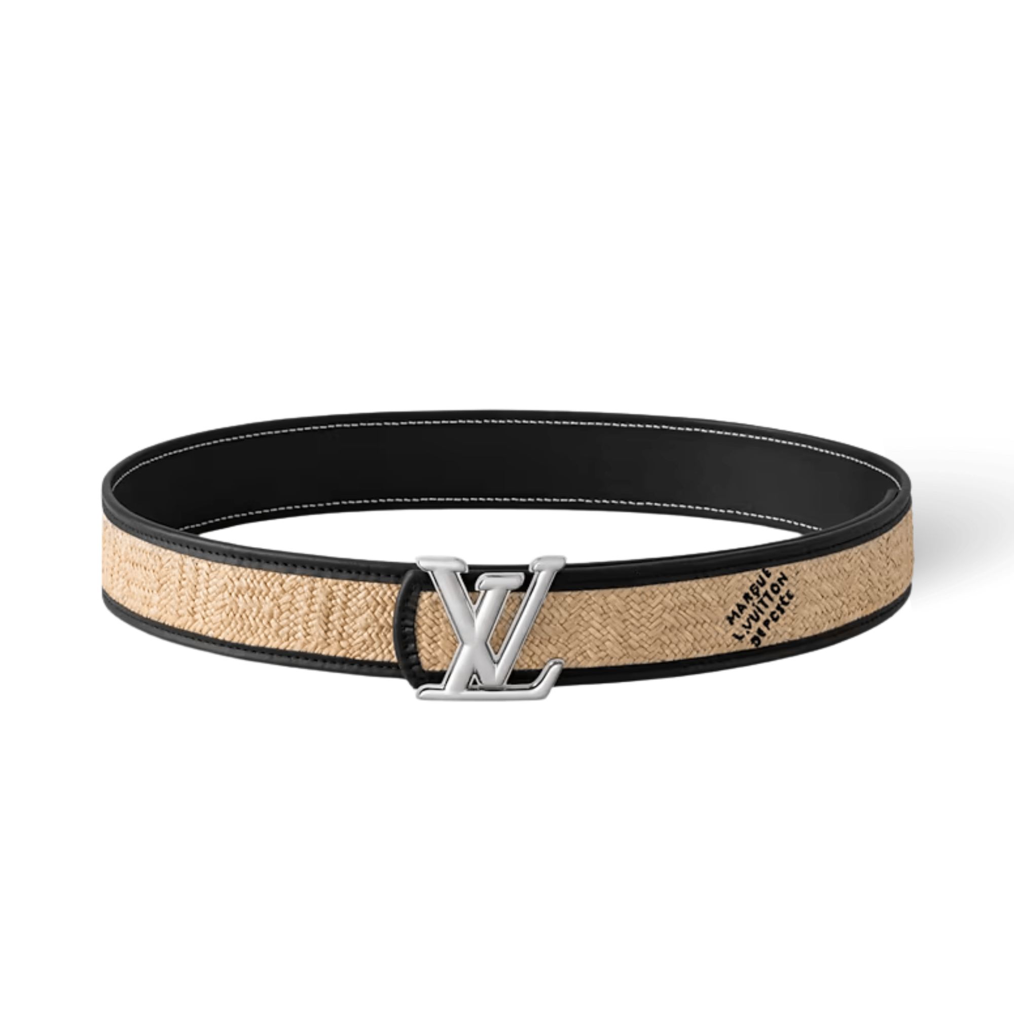 The LV Dimension Raffia 40mm Reversible Belt translates the beloved design elements of the original series into a summer-ready style. Featuring the embroidered “Marque L.Vuitton Deposée” signature, gives texture that smartly juxtaposes the smooth black leather of the reverse.