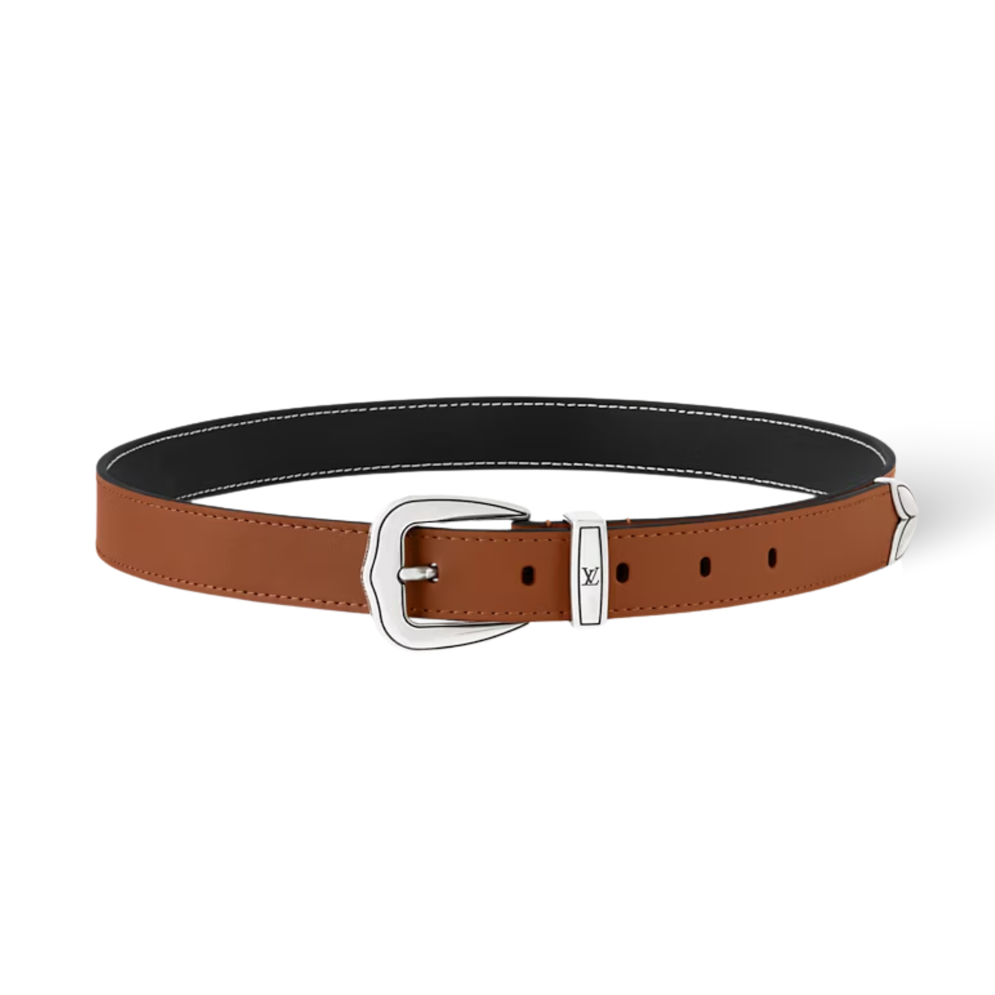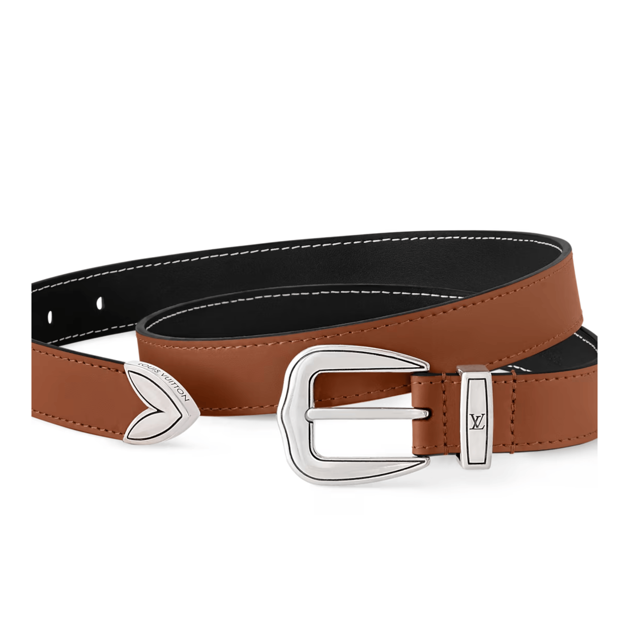 The LV Dust 25mm belt is a slender style, packed with substance and flair courtesy of Pharrell Williams’s sharp point of view. Contrasting saddle stitching along the edge and the Western-influenced buckle, complete with a similarly ornamental end tip, create a polished yet rugged appeal. A final, special touch: the loop is engraved with the House initials.