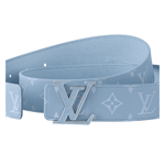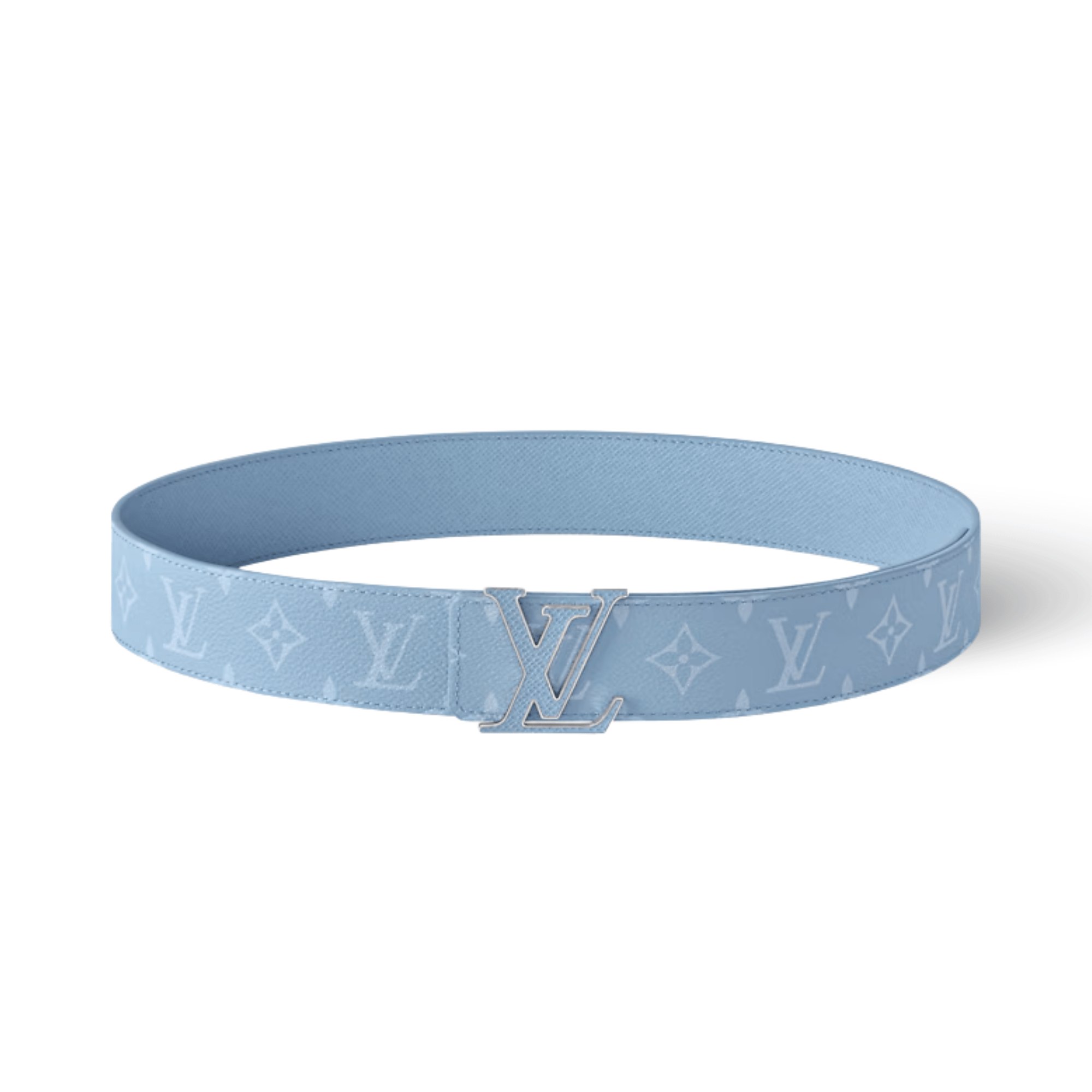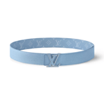 The LV Initiales 40mm Reversible Belt is done up in pastel blue is an elegant piecing together of iconic motifs. The Damier print, the Monogram in two contrasting colorways, and a new visibly embroidered treatment combine to create textural layers. The ruggedness offers a beautiful contrast to the black leather reverse.
