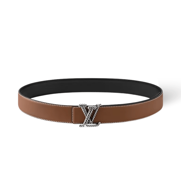 The LV Rope 35mm Reversible belt stands out for its unexpected yet utterly versatile buckle. Designed to look like two continuous pieces of rope, the initials immediately radiate nautical influence. The textured hardware and saddle stitching beautifully contrast the smooth leather strap, brown on one side, black on the reverse.