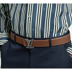 The LV Rope 35mm Reversible belt stands out for its unexpected yet utterly versatile buckle. Designed to look like two continuous pieces of rope, the initials immediately radiate nautical influence. The textured hardware and saddle stitching beautifully contrast the smooth leather strap, brown on one side, black on the reverse.