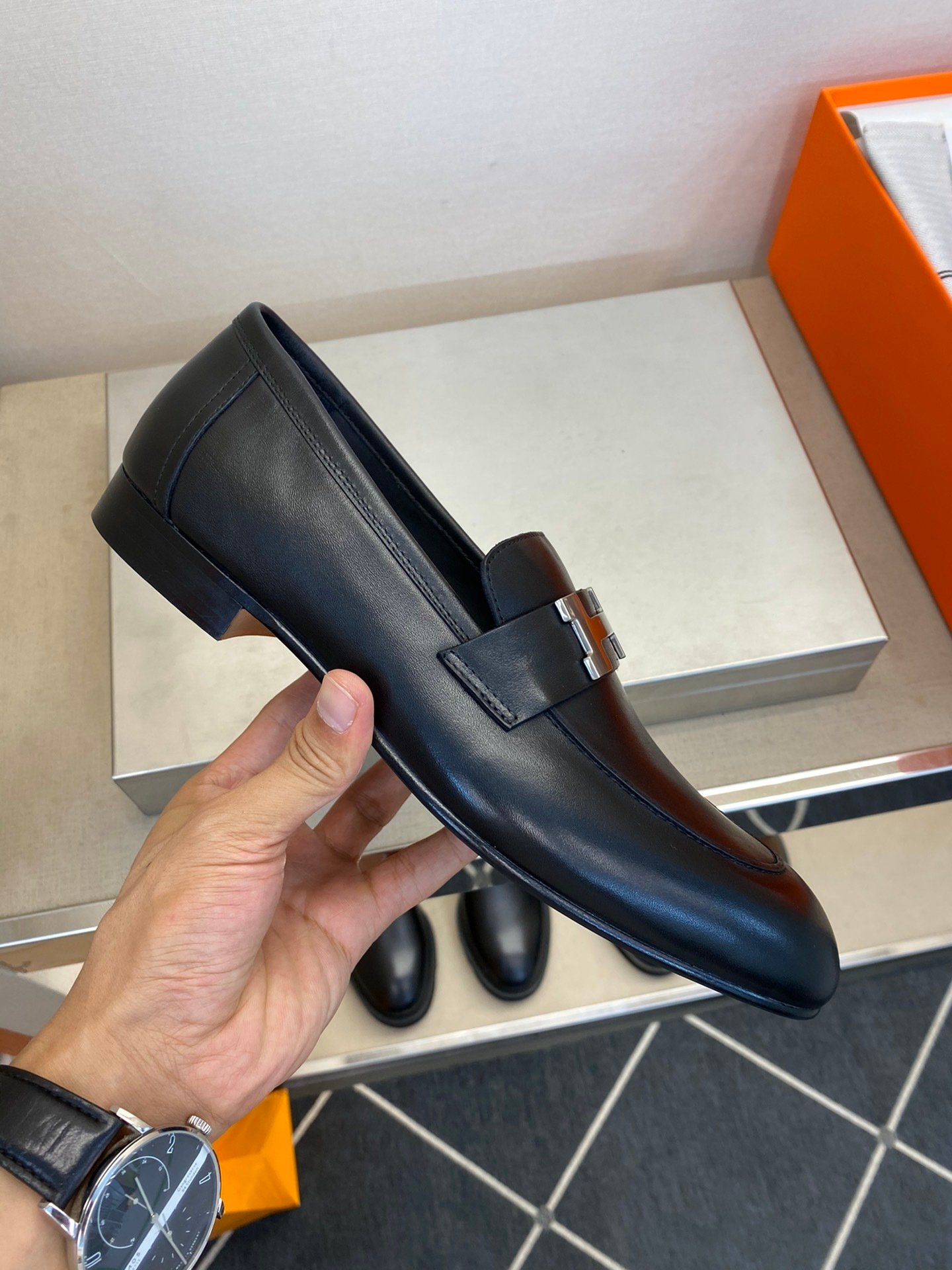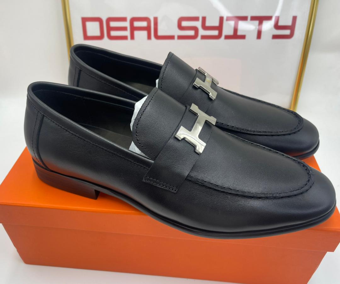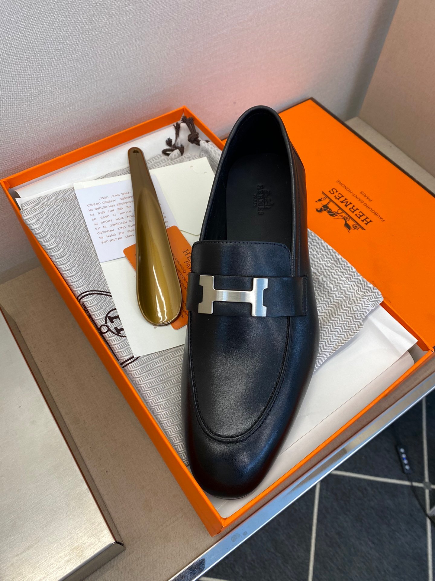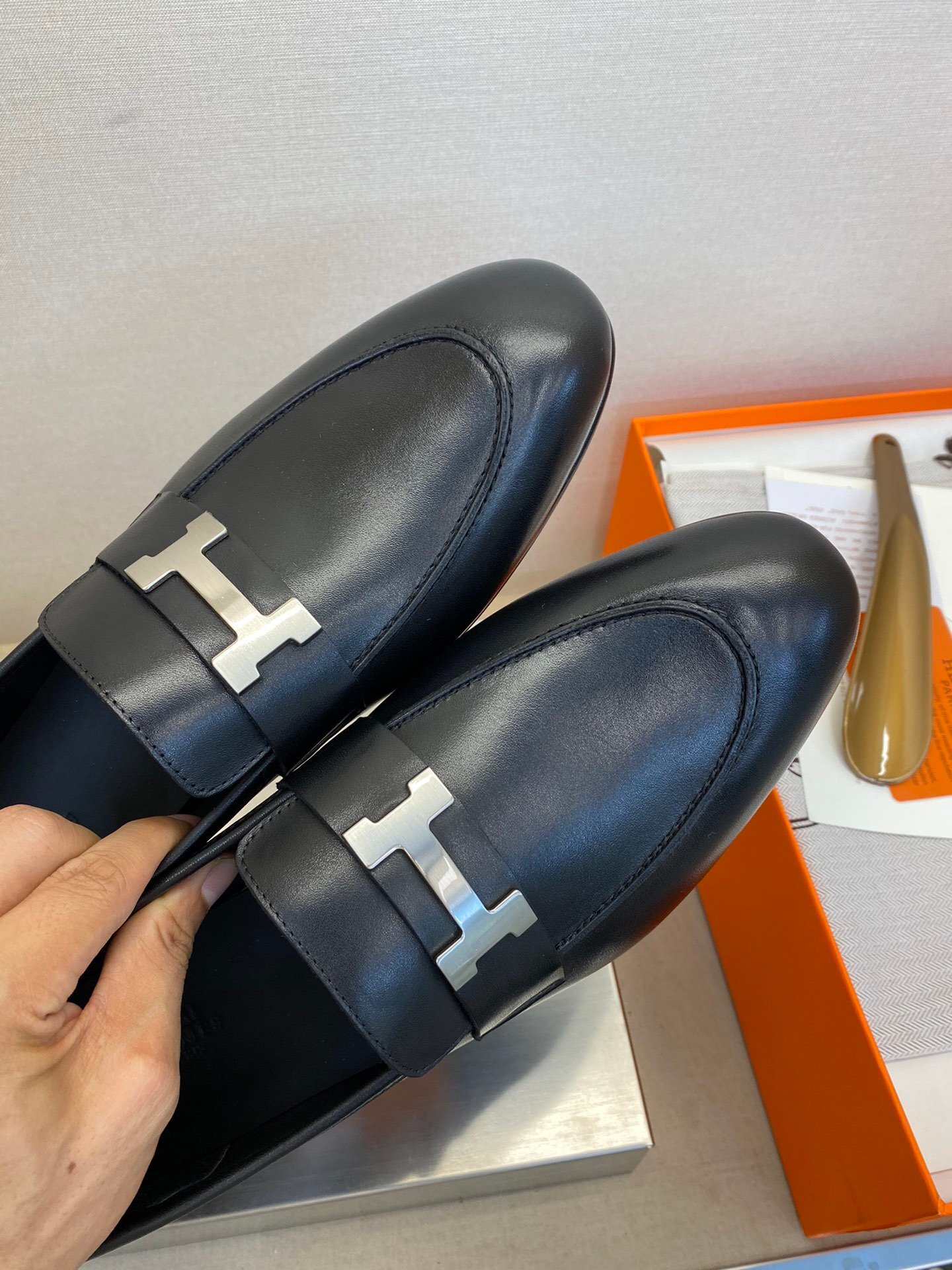 Hermes H-Buckle Black Smooth Leather Loafers- Shoes for Men