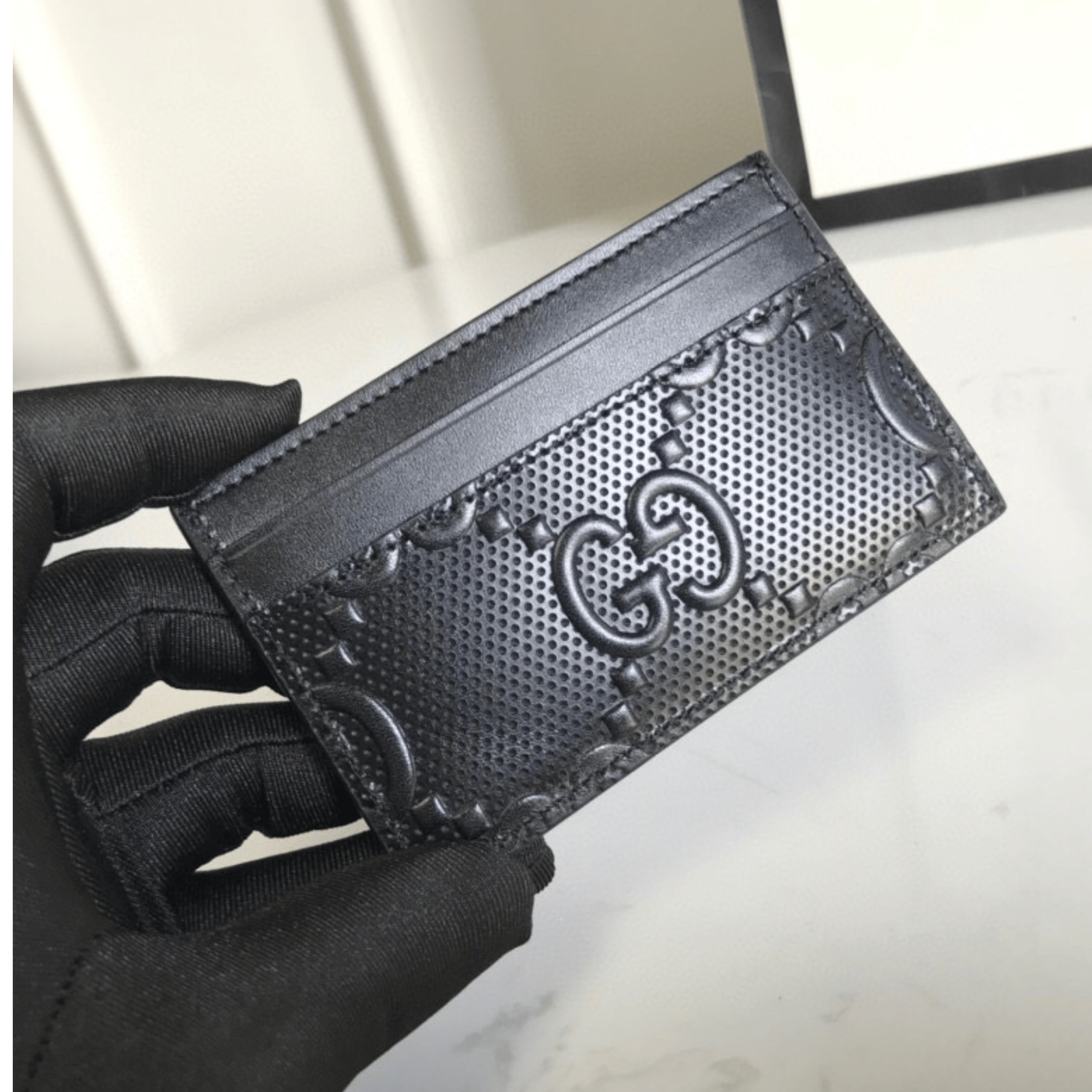 The card case is introduced in a new interpretation of the GG motif presented within the Pre-Fall 2020 collection. Noted for its softness and slightly shiny finish, the GG leather plays on texture, embossing the House emblem onto a black perforated leather base.