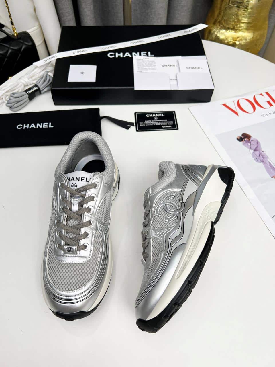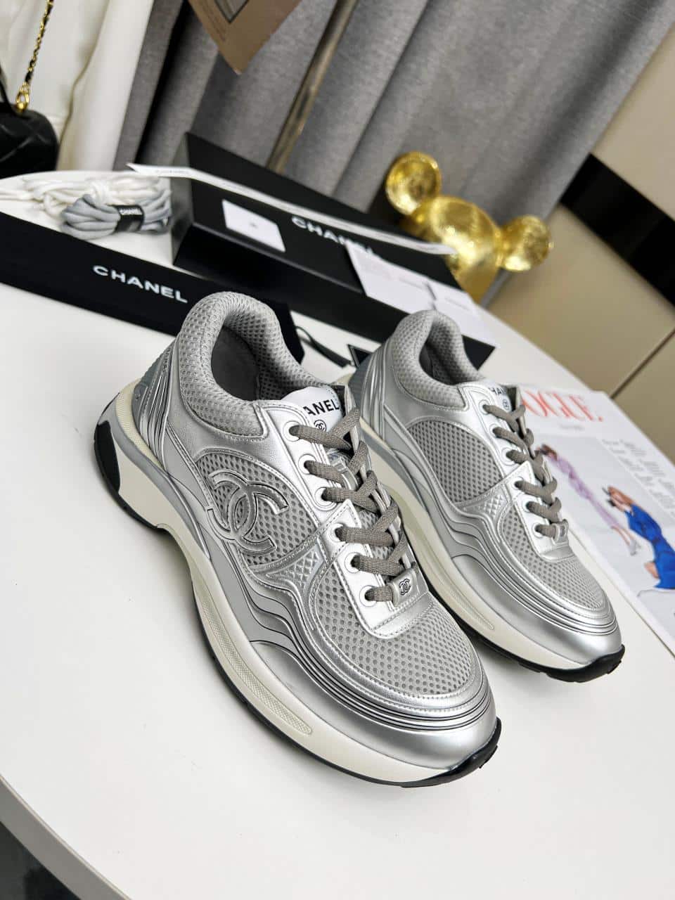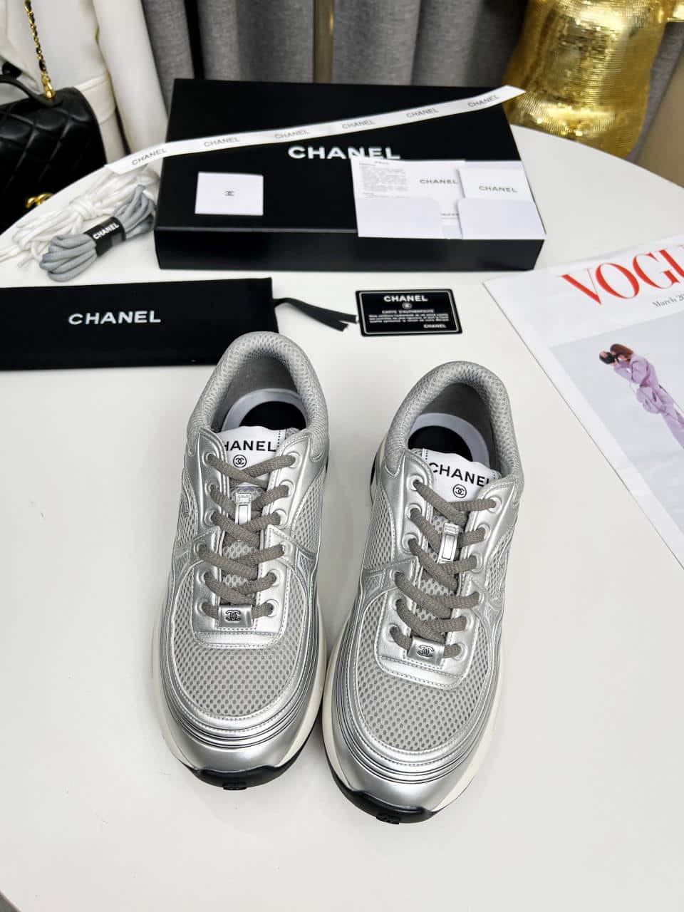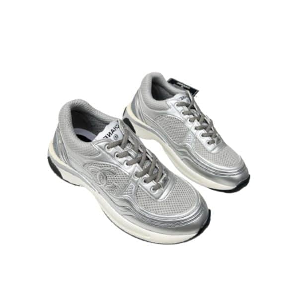 Chanel 23C Silver Metallic Cc Logo Lace Up Flat Runner Trainer Sneaker Gray