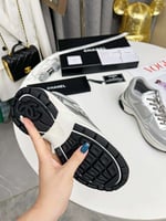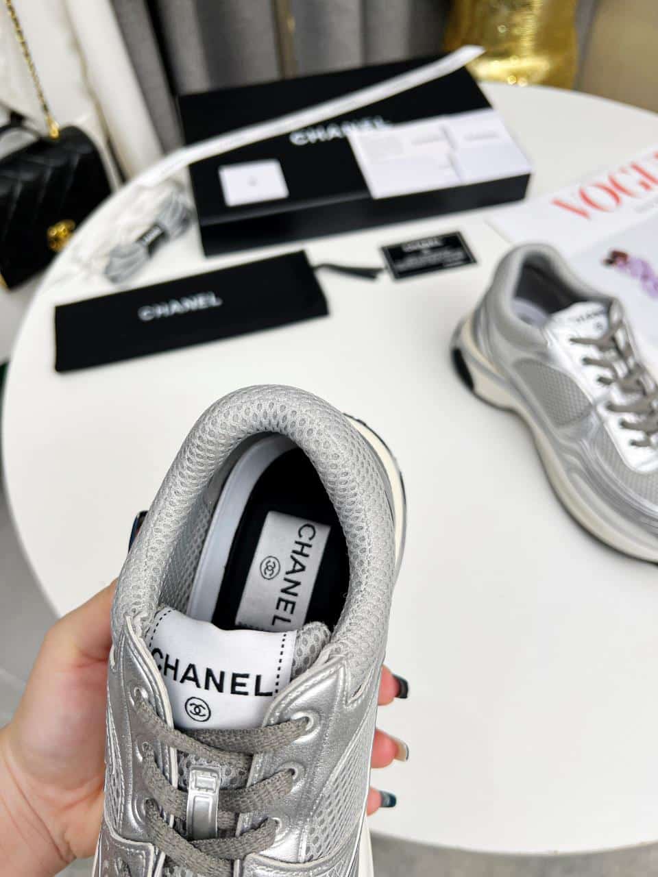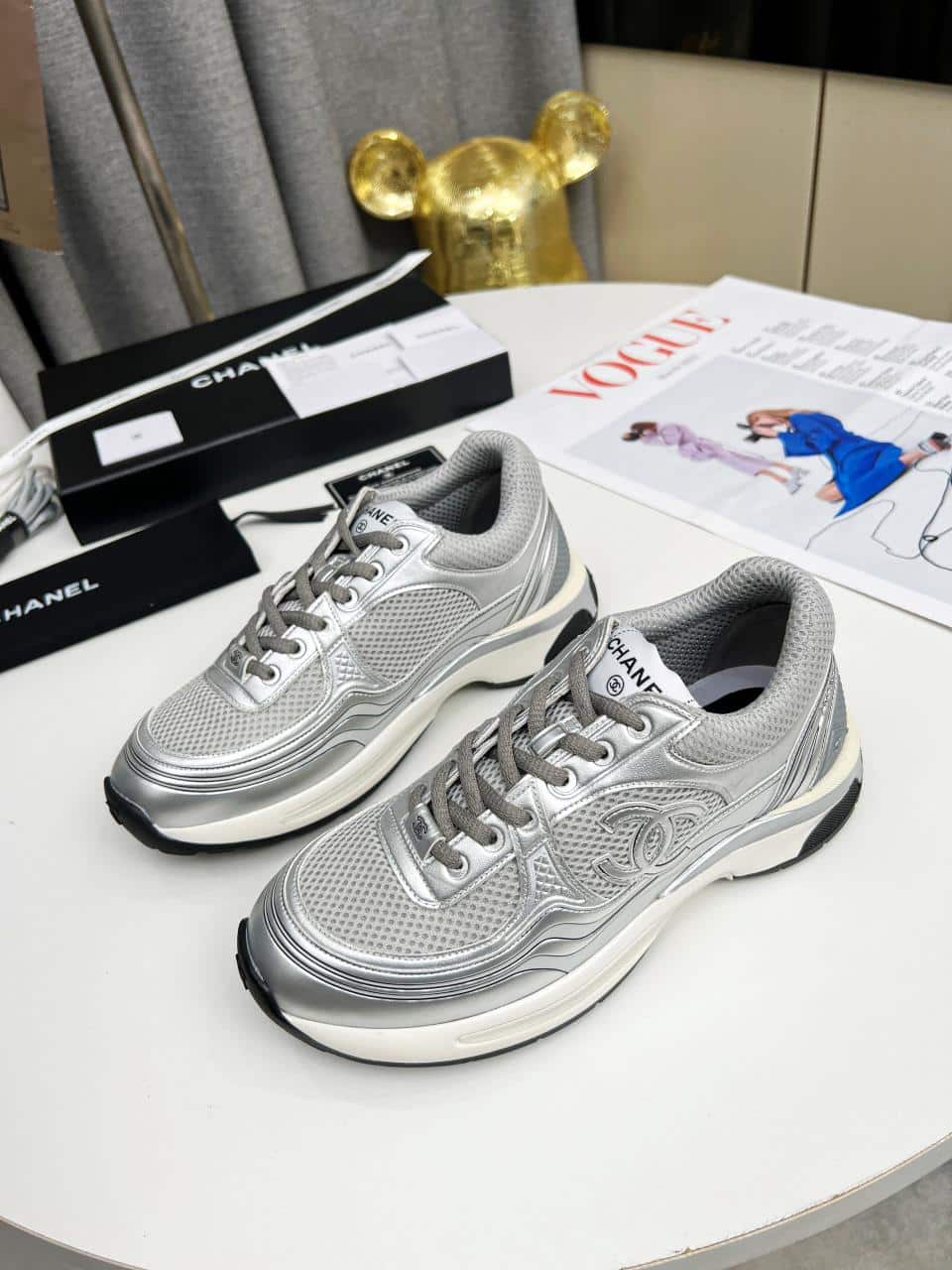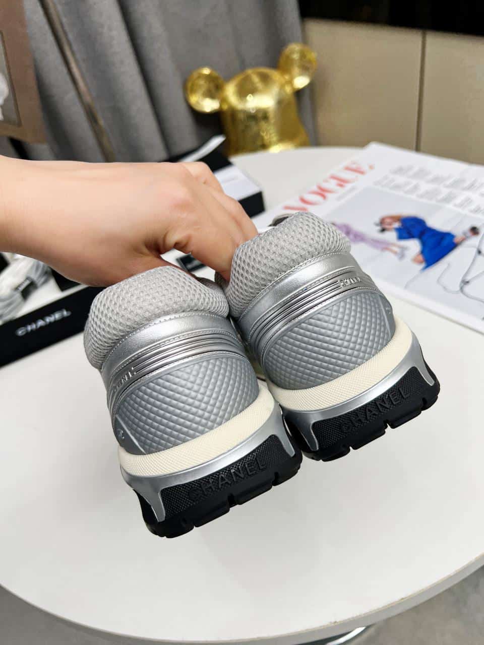 Chanel 23C Silver Metallic Cc Logo Lace Up Flat Runner Trainer Sneaker Gray