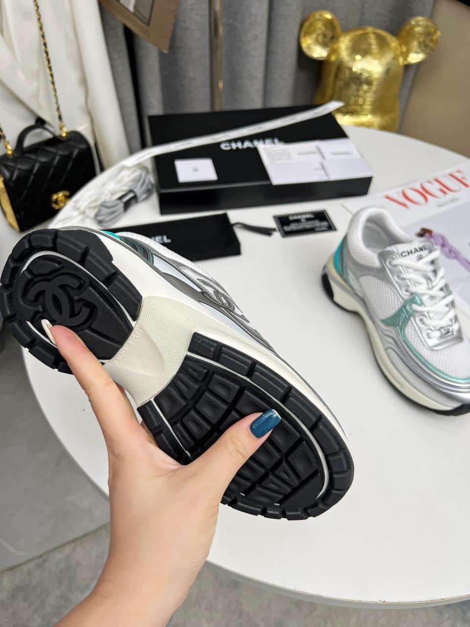 Chanel 23C Silver Metallic Cc Logo Lace Up Flat Runner Trainer Sneaker White Turquoise