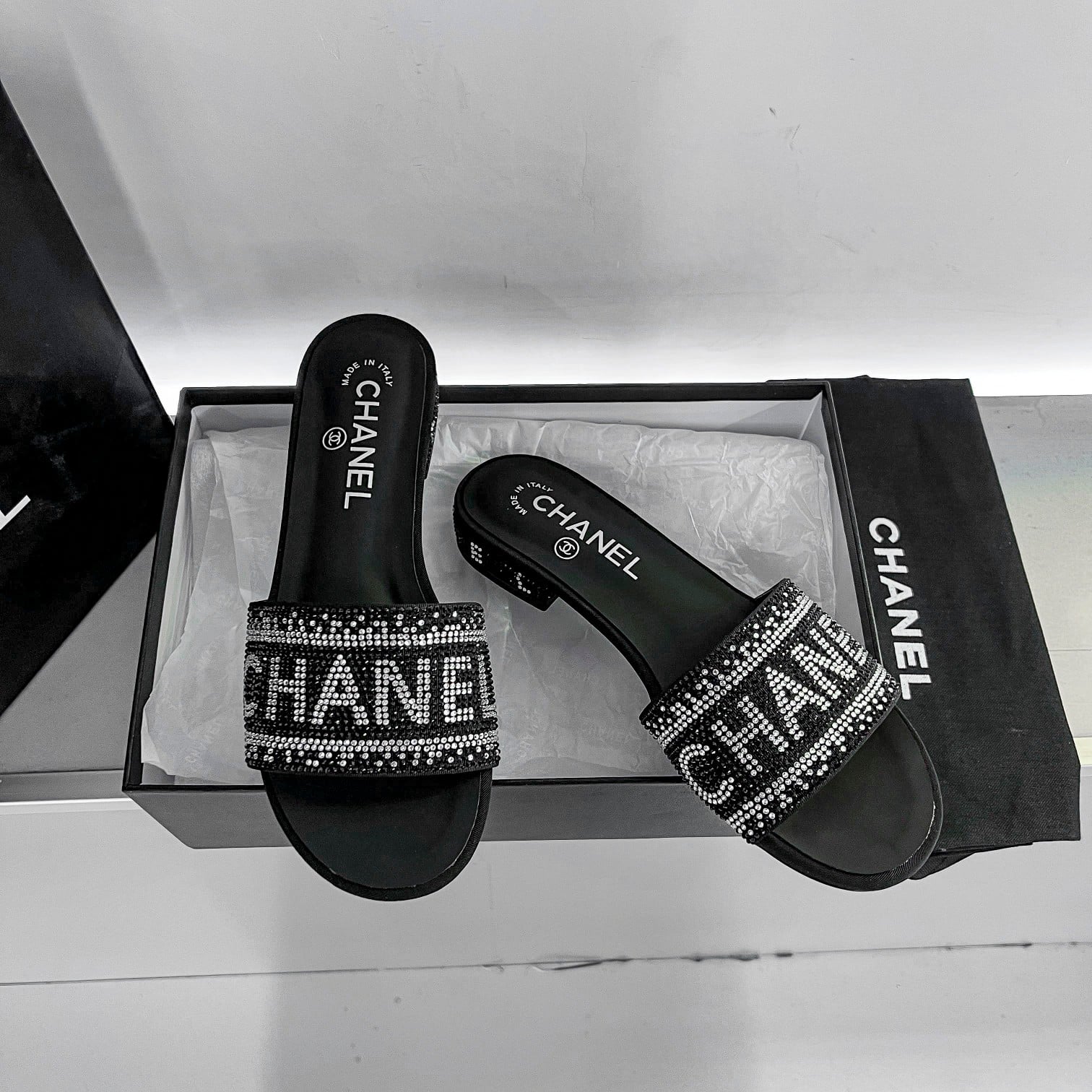 Chanel 24P Beaded Diamond Slippers Black