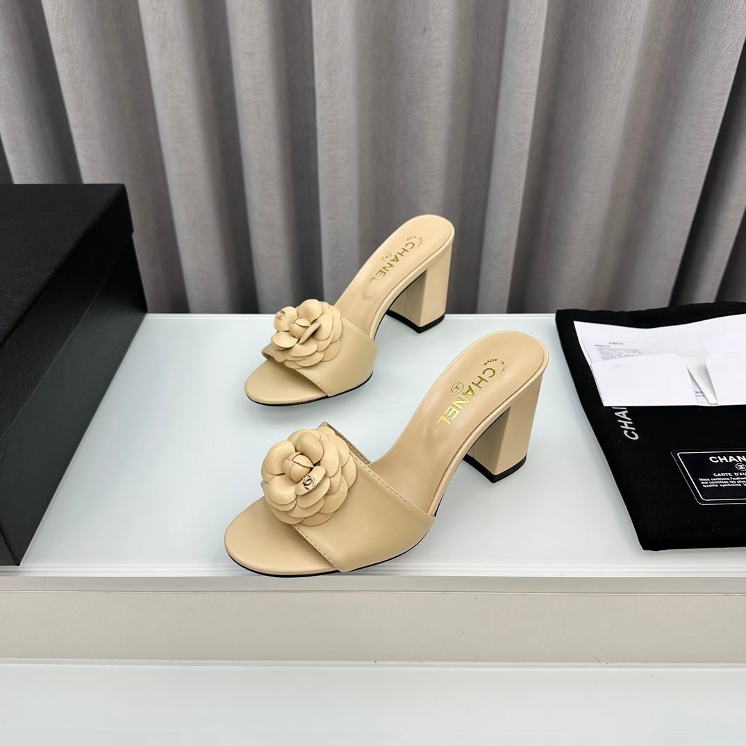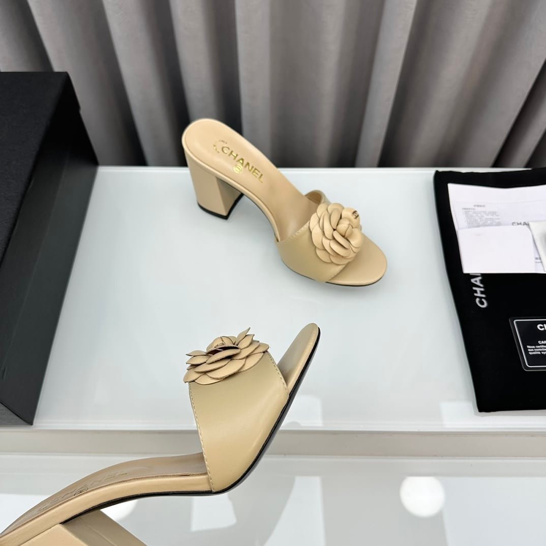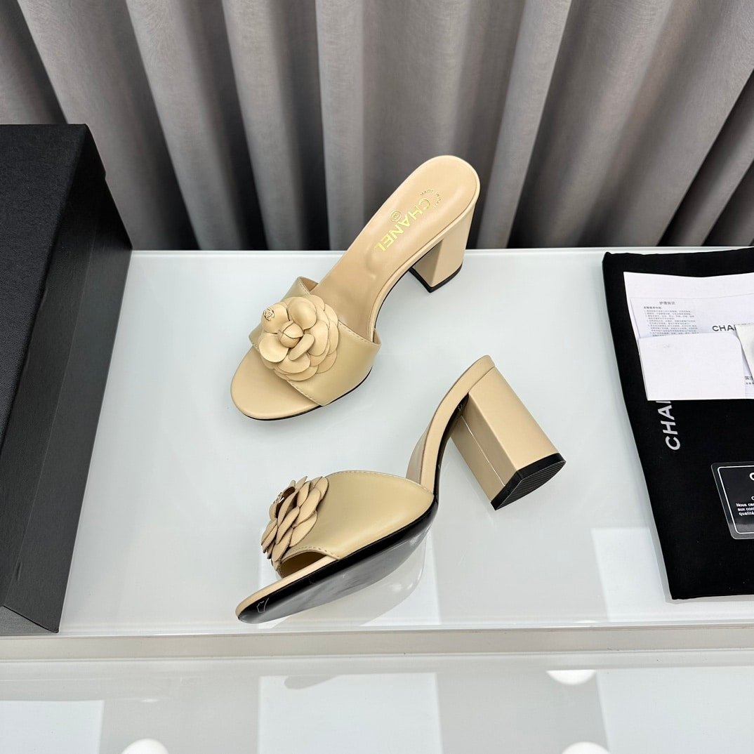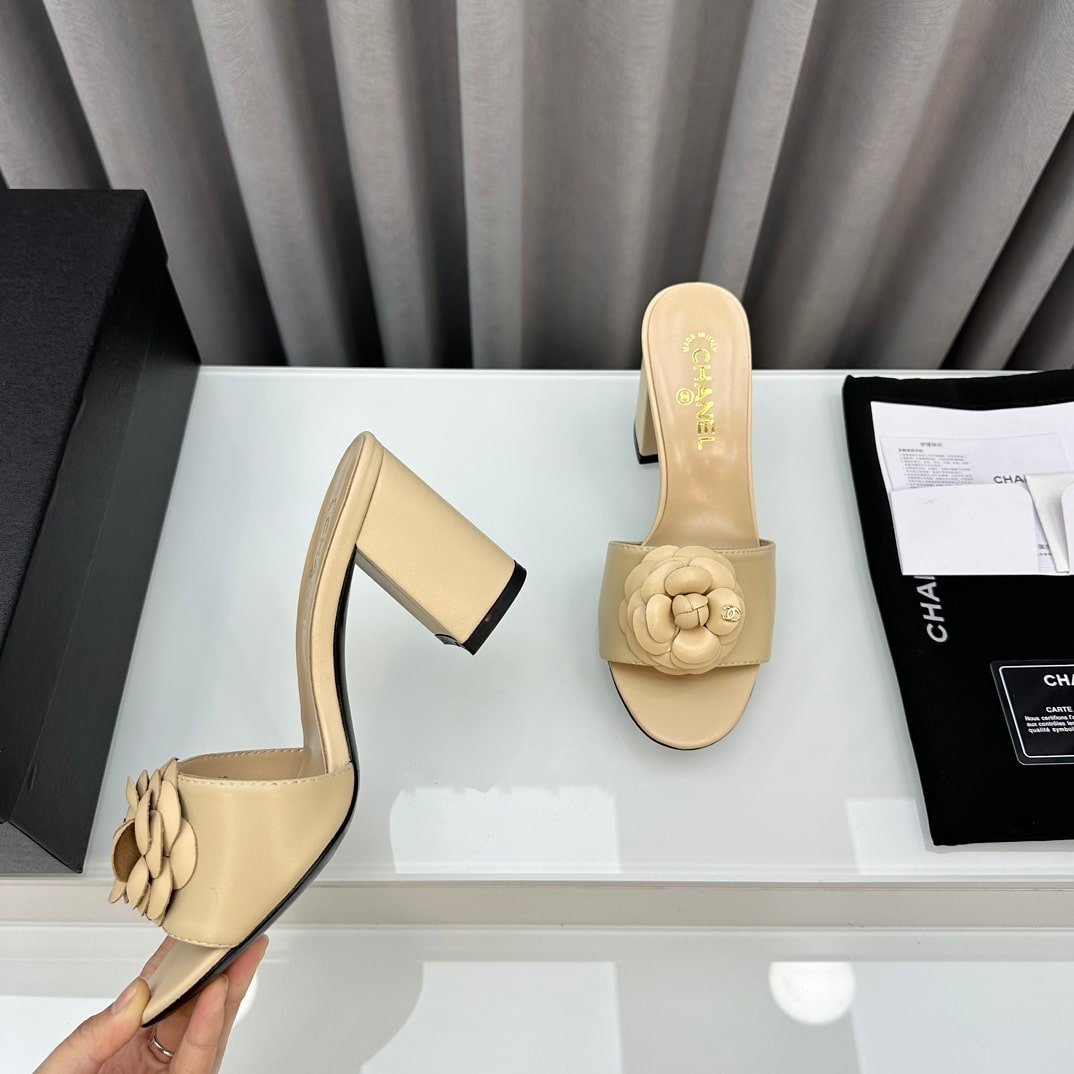 Chanel Camellia Medium Heel Slippers Beige