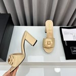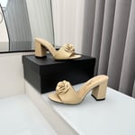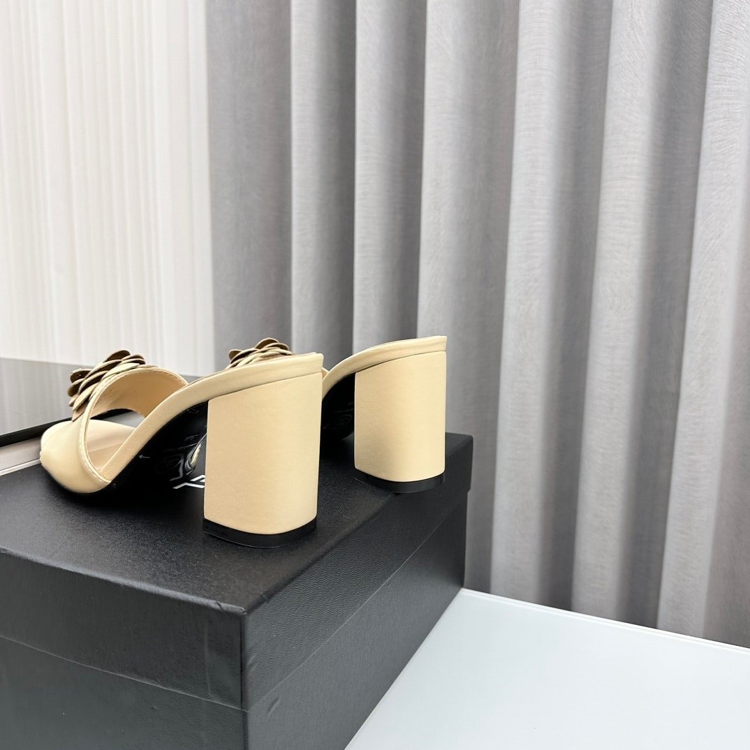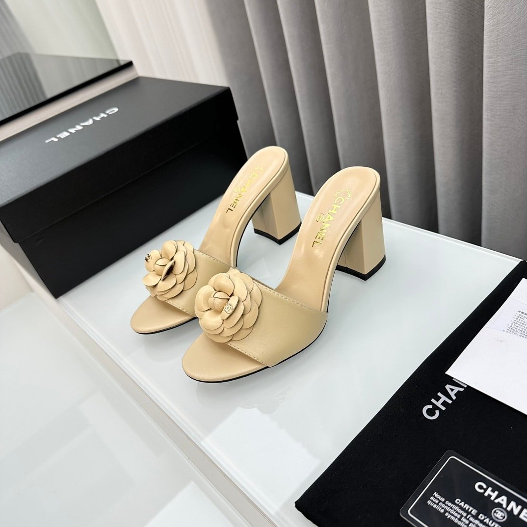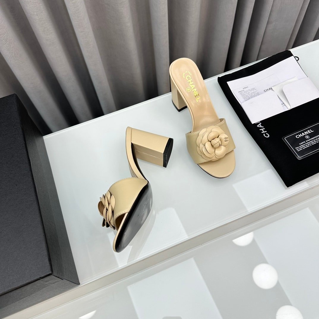 Chanel Camellia Medium Heel Slippers Beige