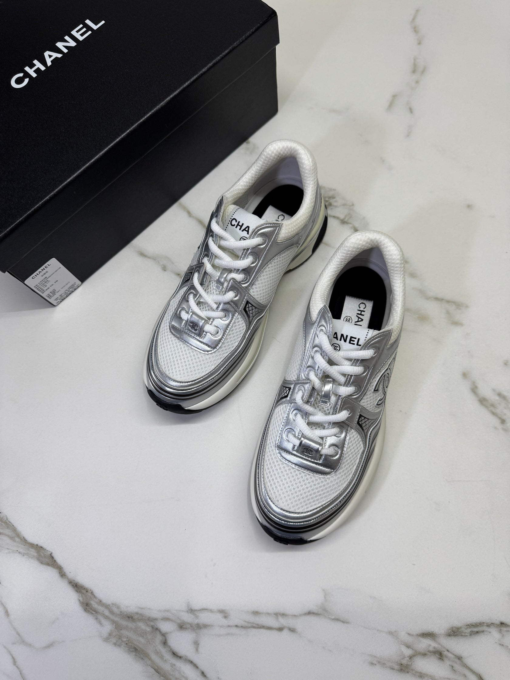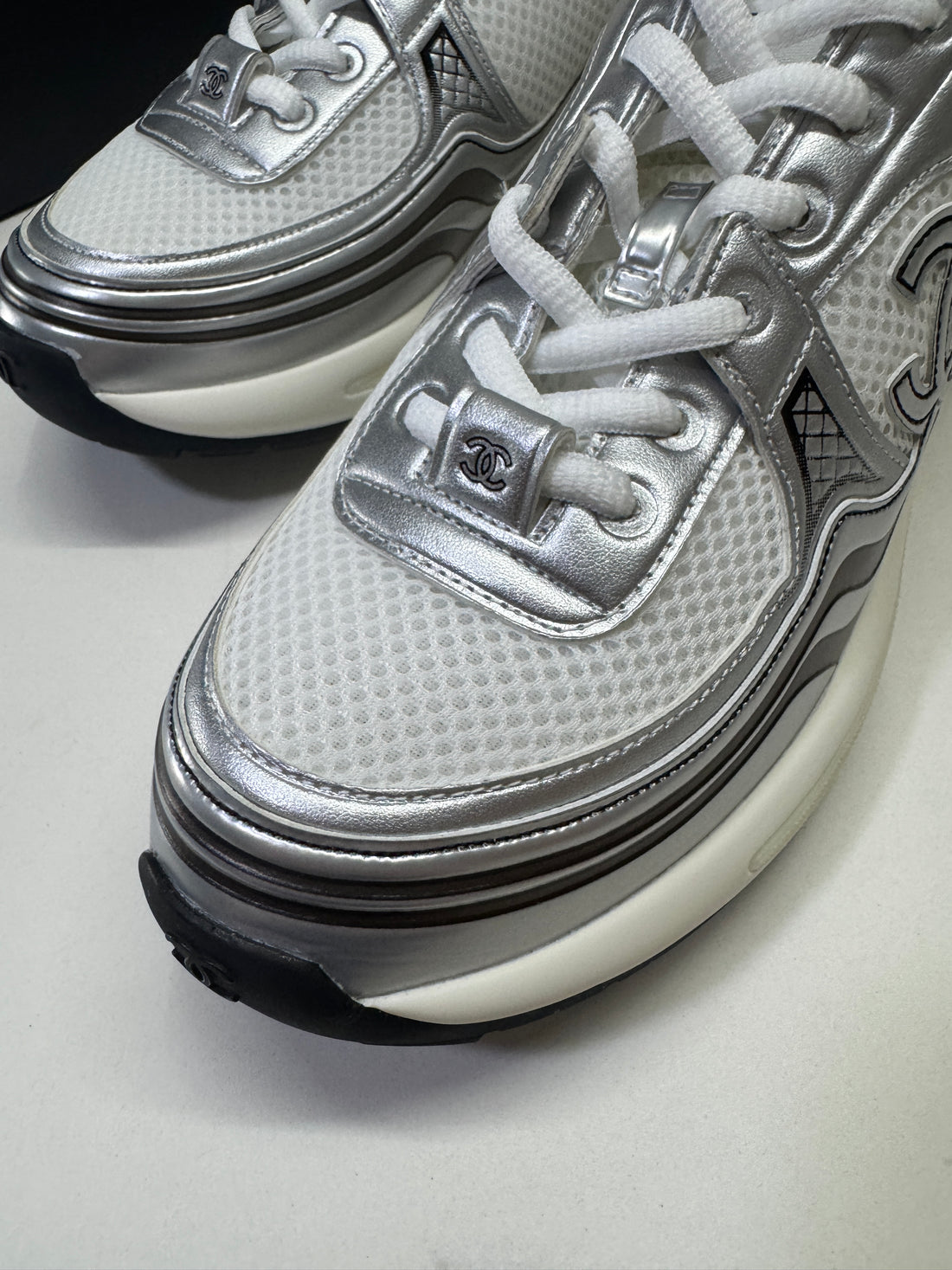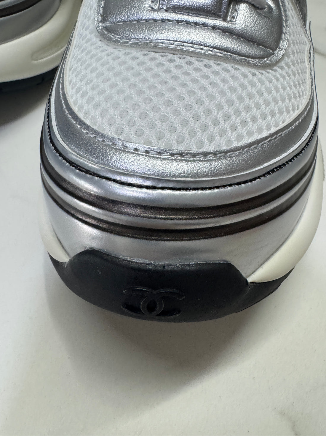 Chanel CC Logo Metallic Mesh Sneakers White/Silver