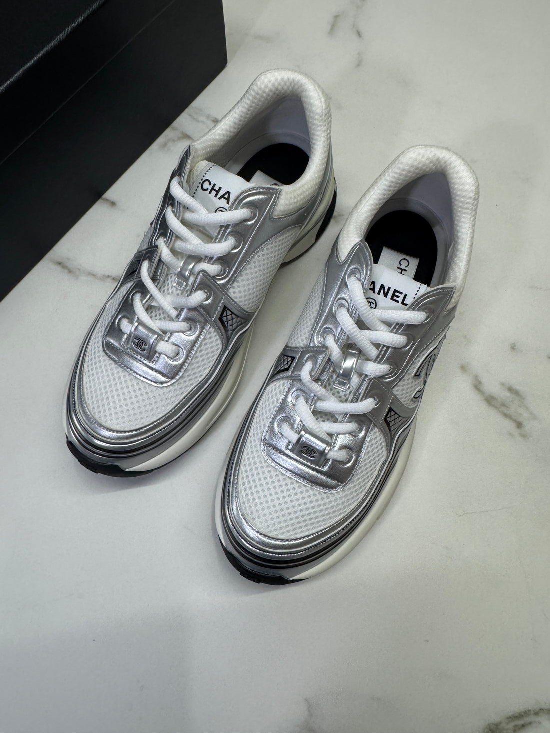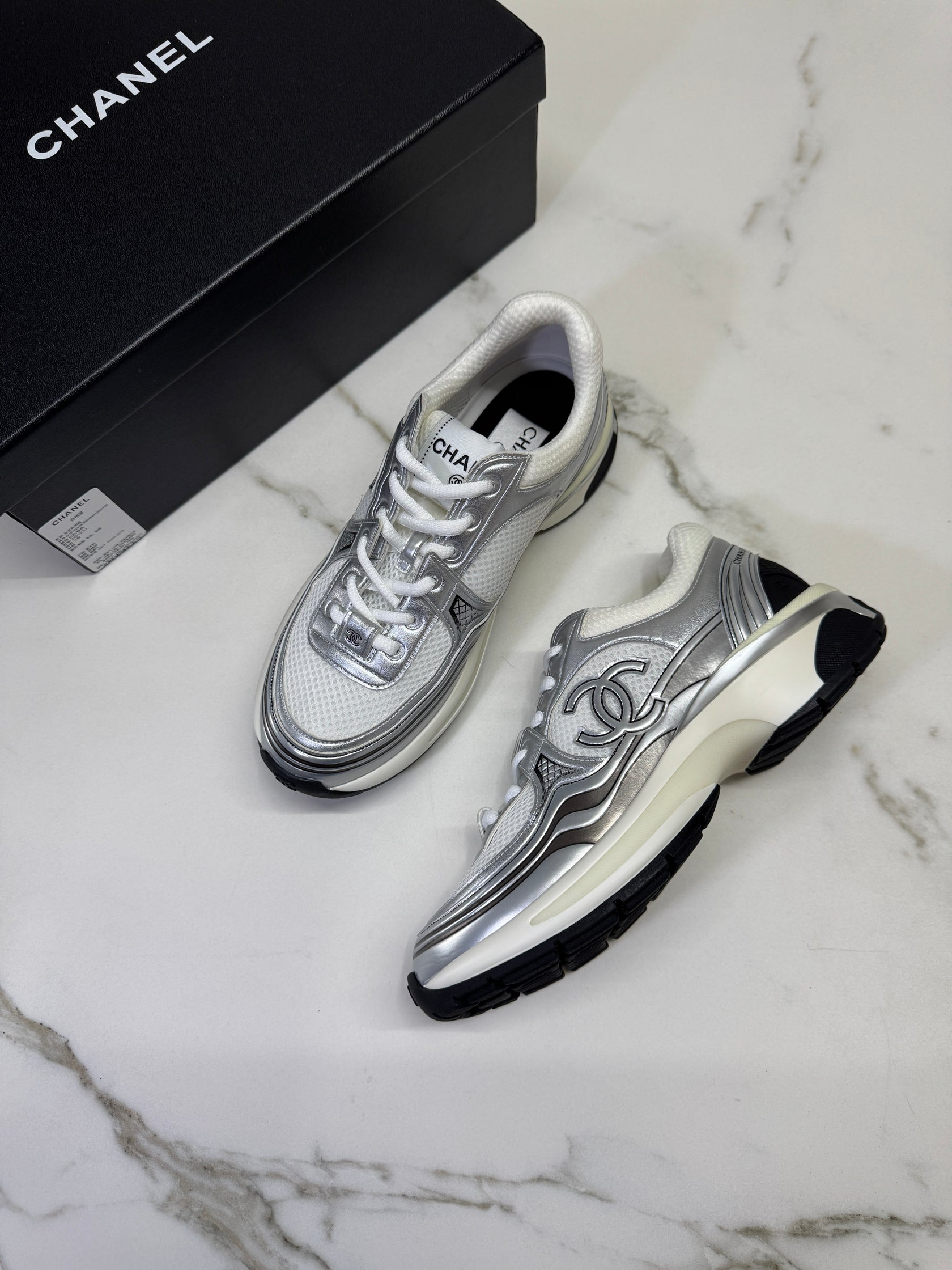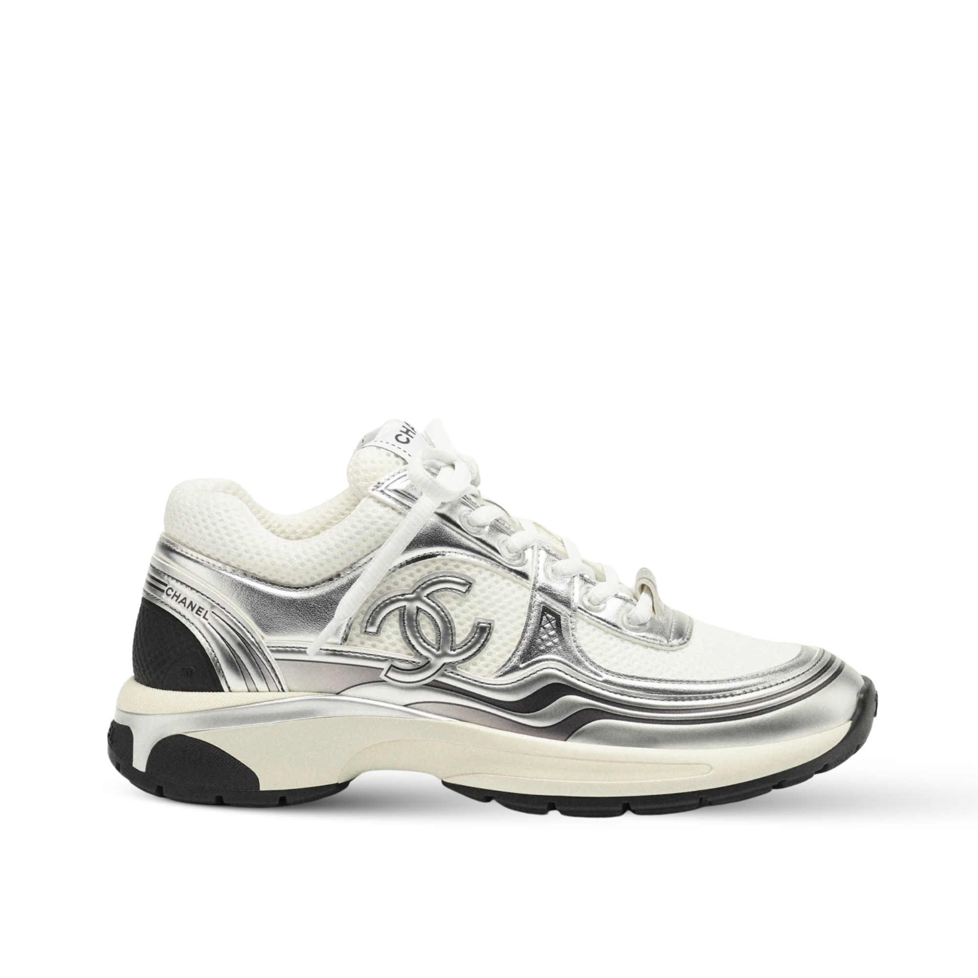 Chanel CC Logo Metallic Mesh Sneakers White/Silver