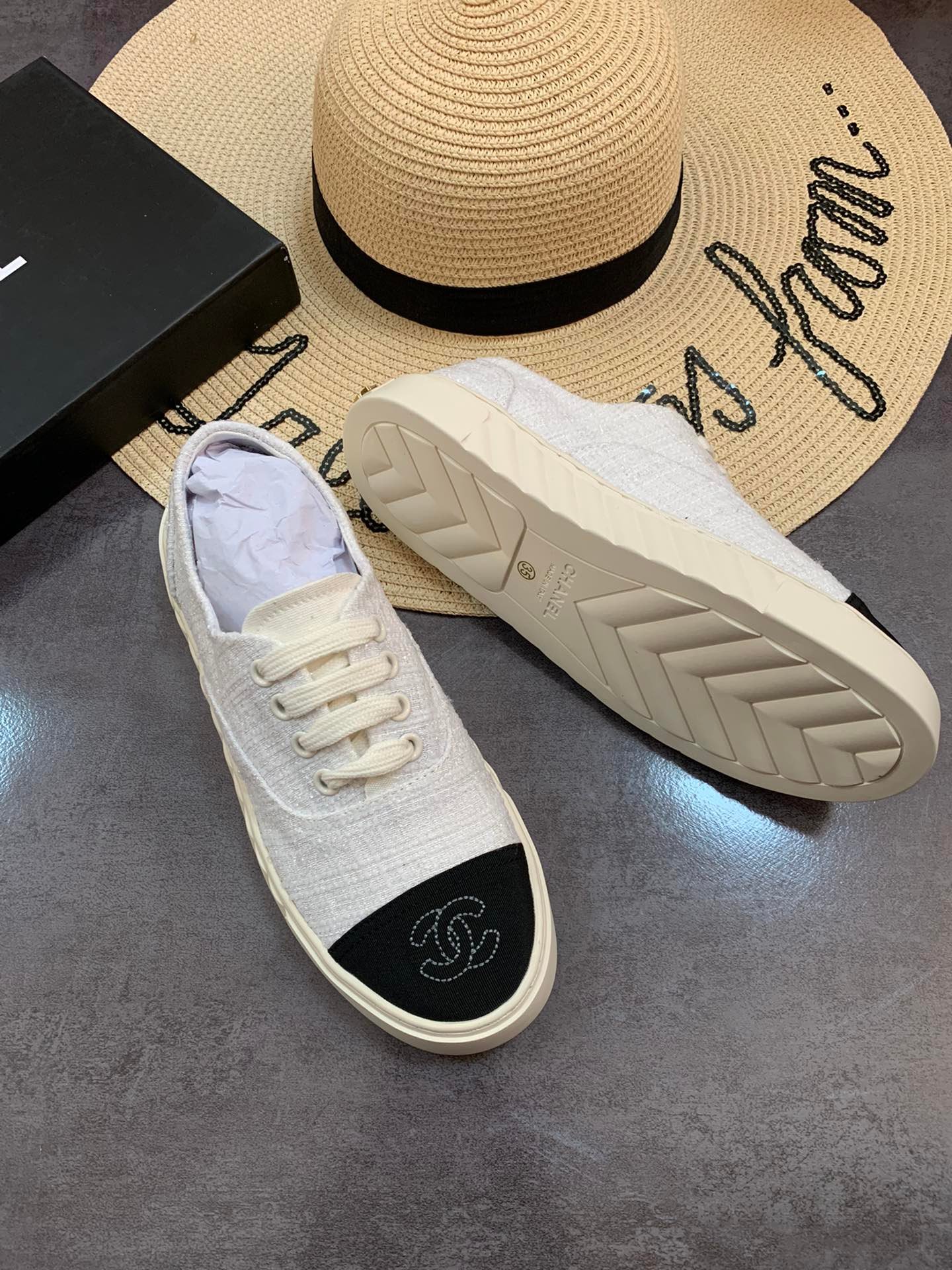 Chanel White Cc Cap Toe Slipon Sneaker Black