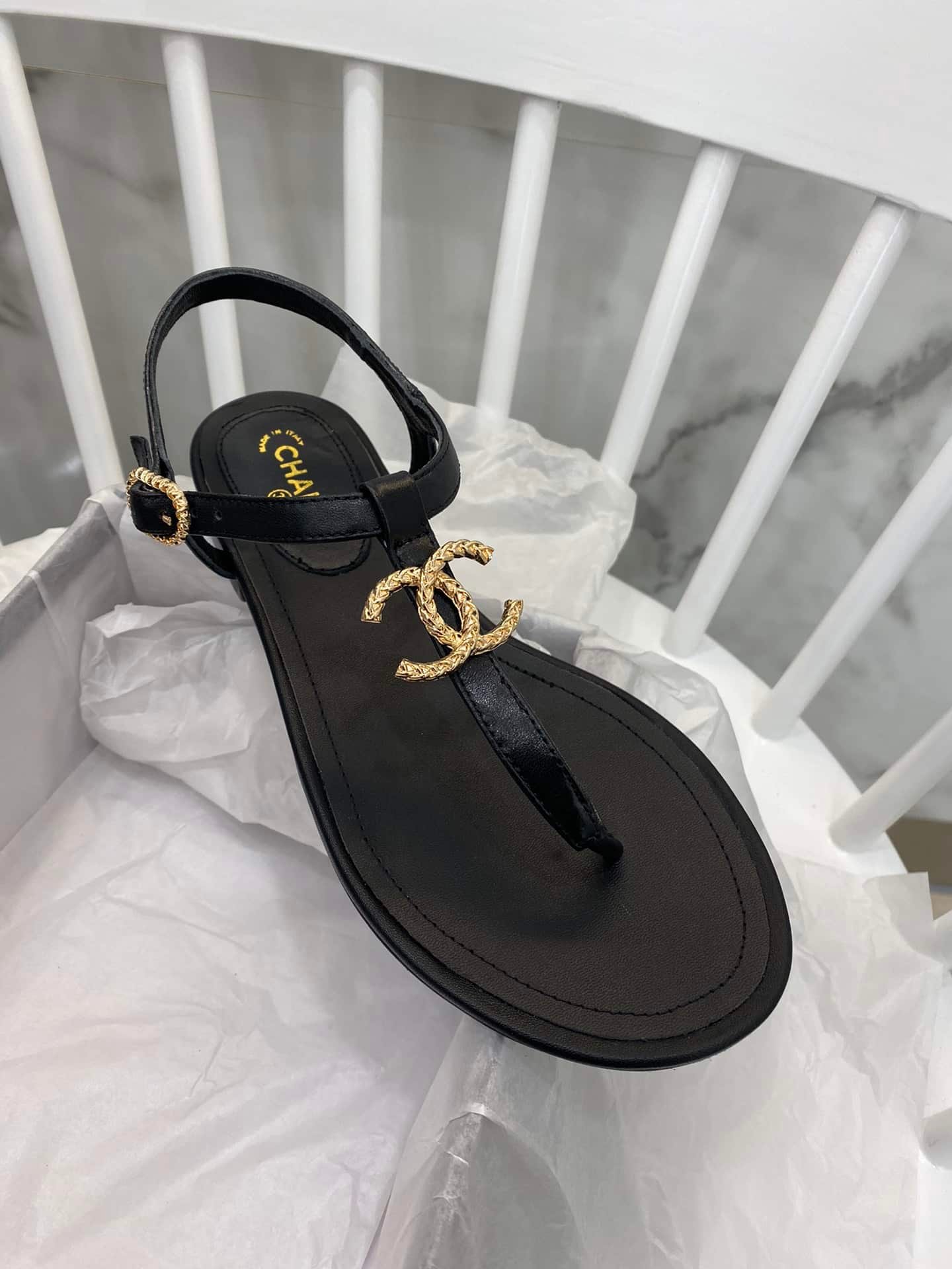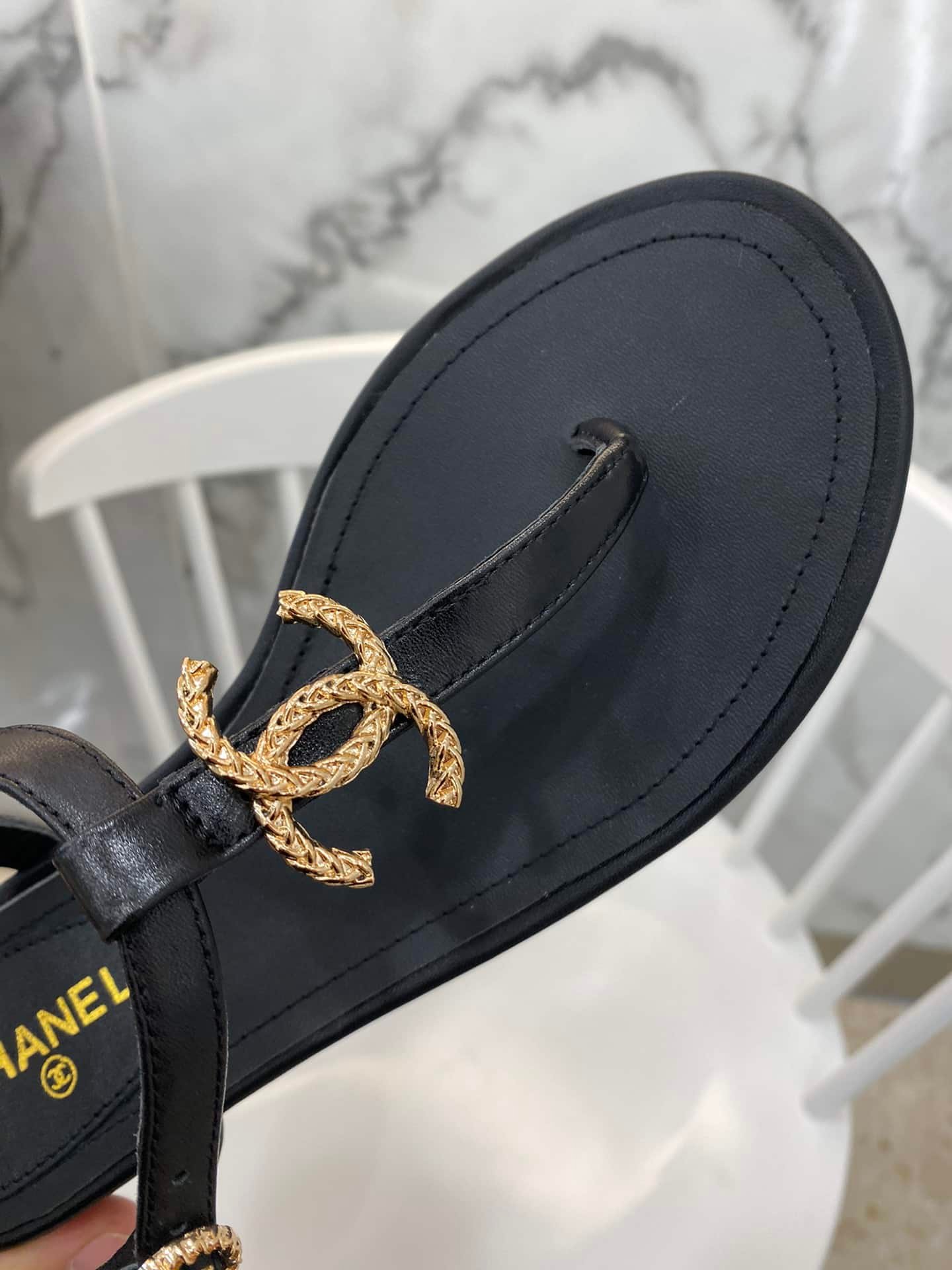 Chanel Gold Cc Logo Thong Sandals Black