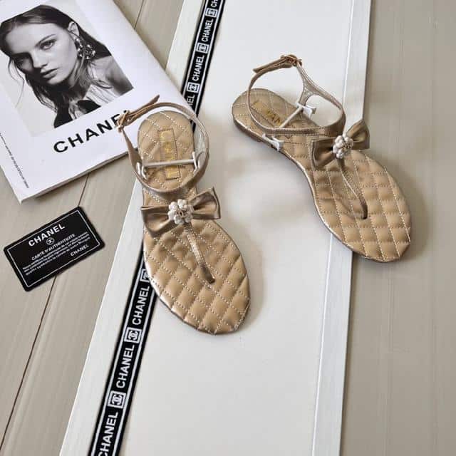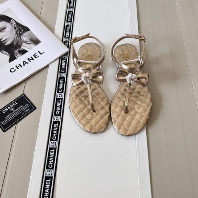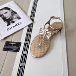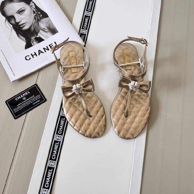 Chanel Gold Quilted Leather With White Camellia Cc Logo Bow Thong Sandals