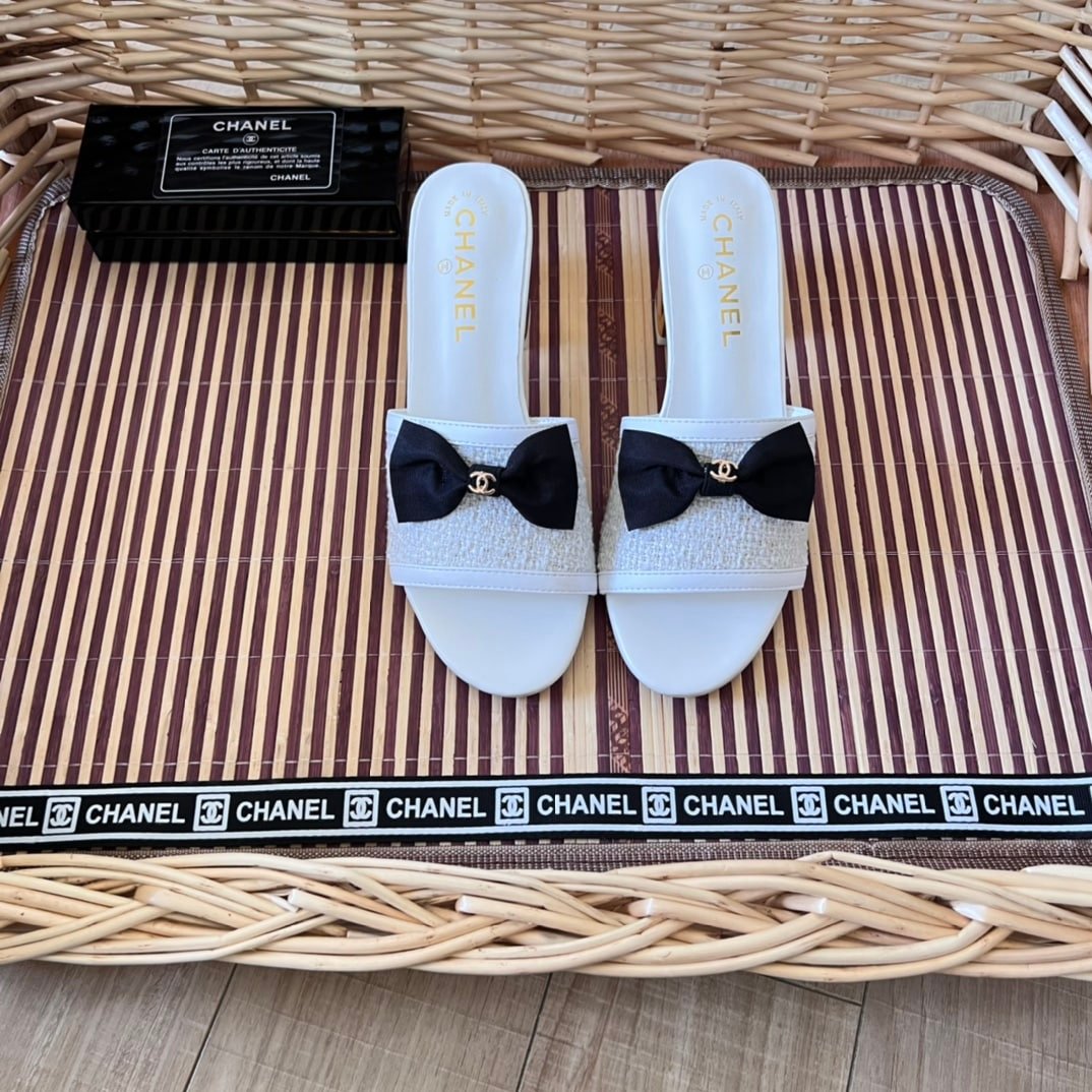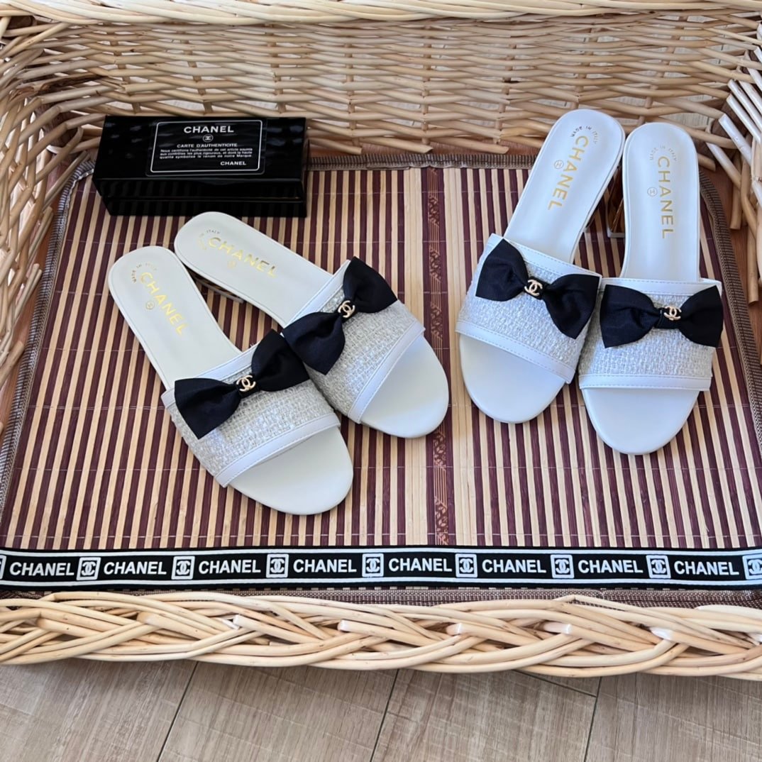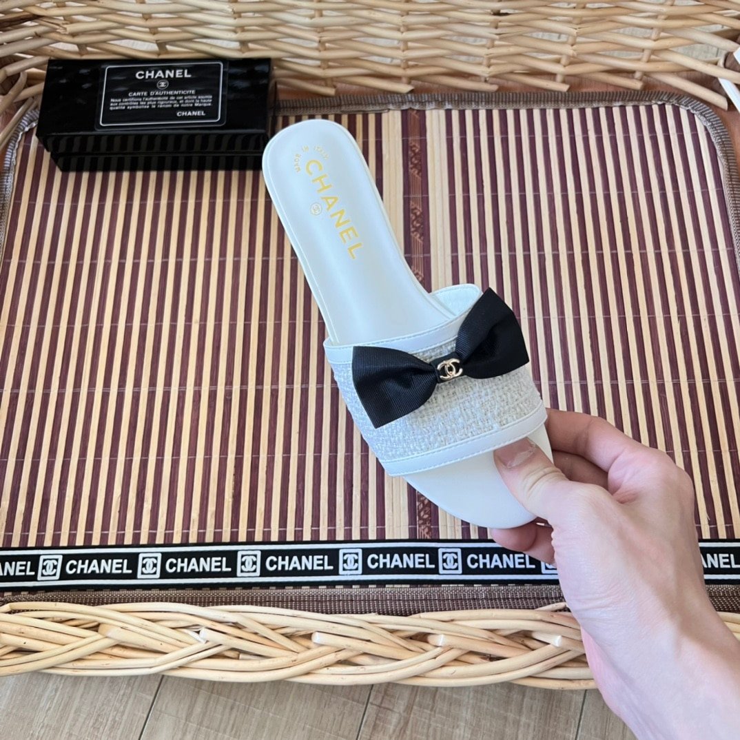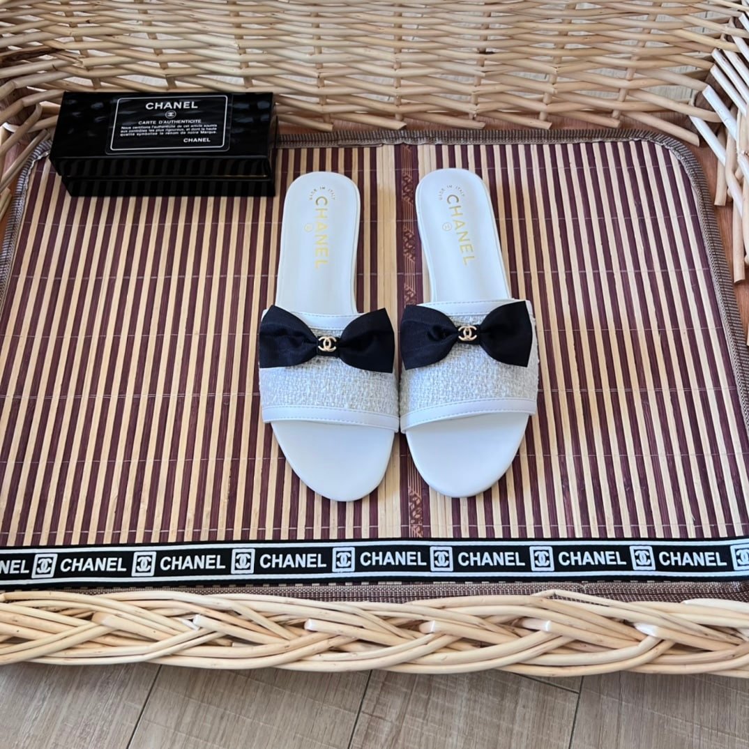Chanel Grosgrain Ribbon Bow Flat Sandal Tweed White