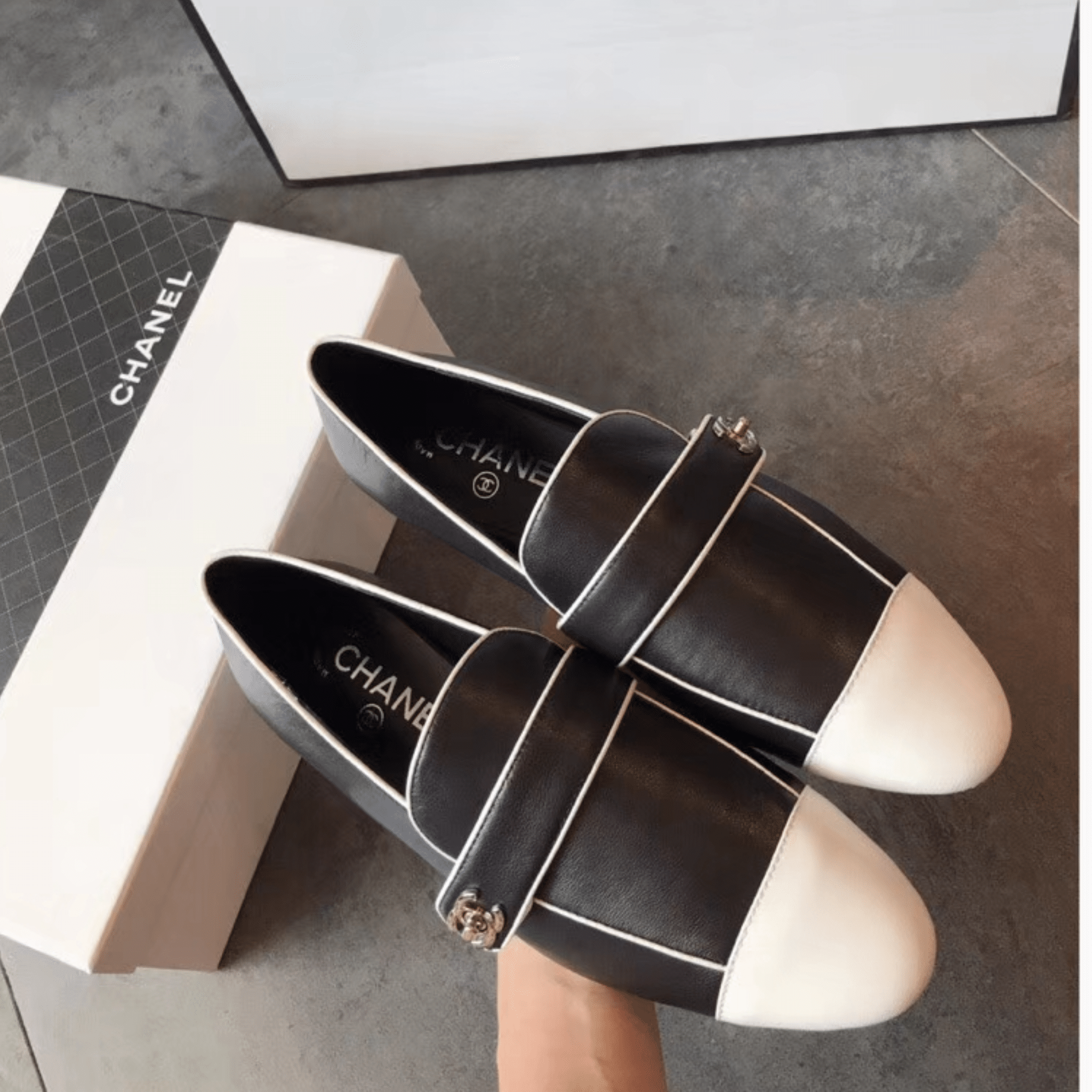 Chanel Leather Cc Cap Toe Slip On Loafers Black