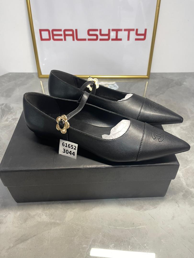 Chanel Pointed Toe Doll Shoes With Gold Flower In Black