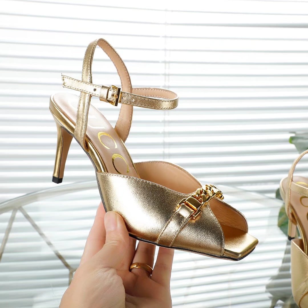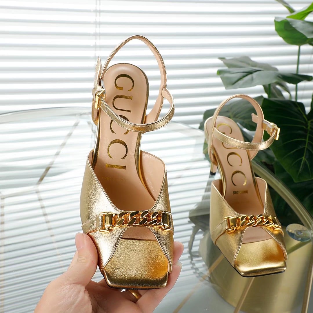 Home Shop Shoes Gucci Shoes Gucci Metal Chain Stiletto Heels Flip Flop Fish Mouth Sandals Gold