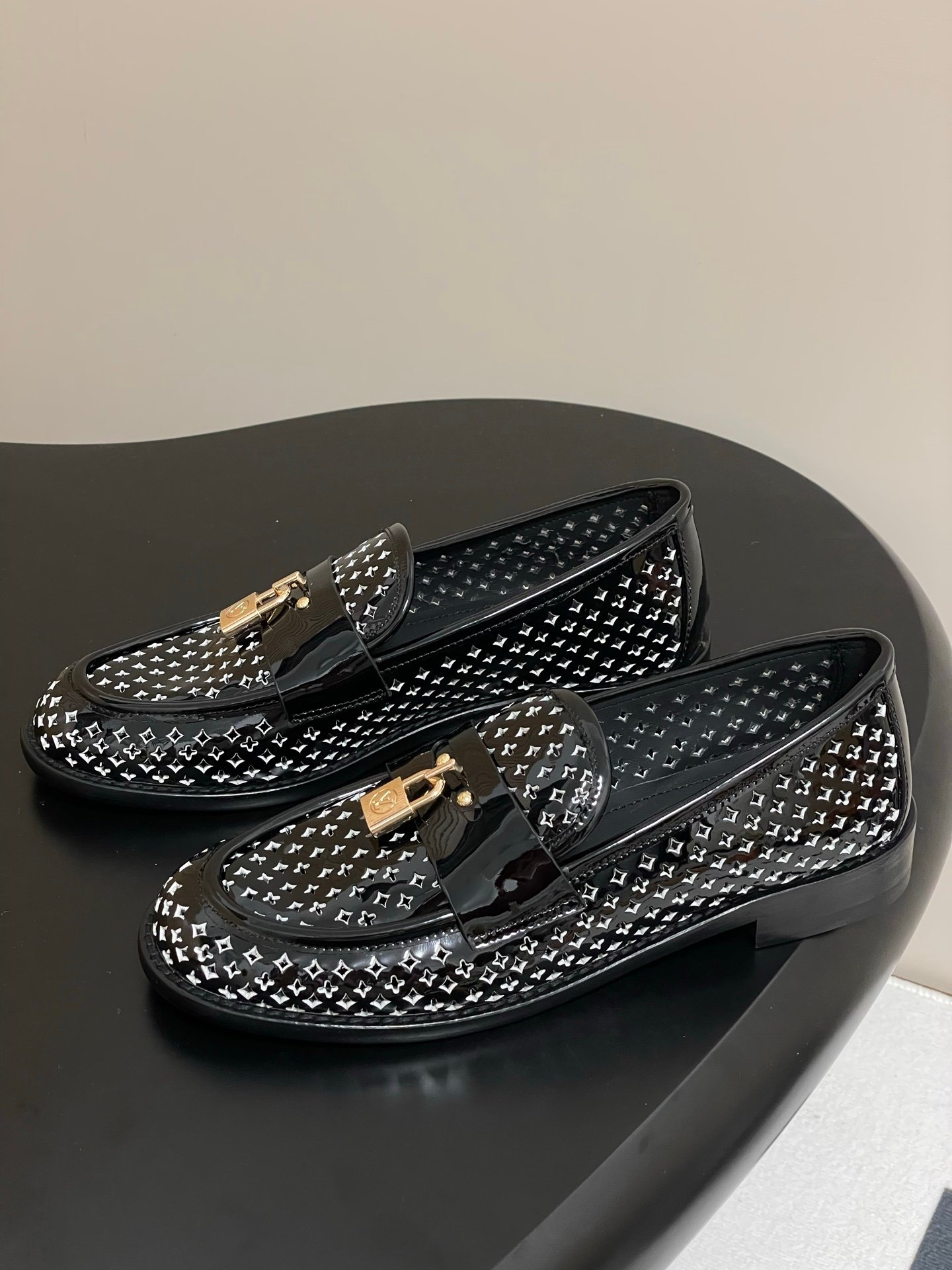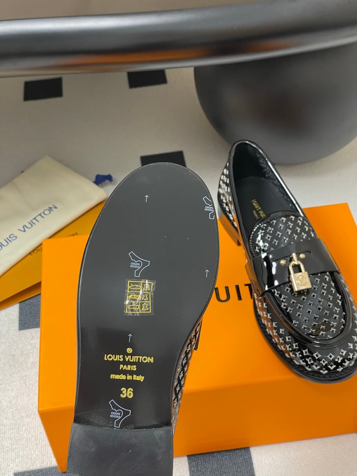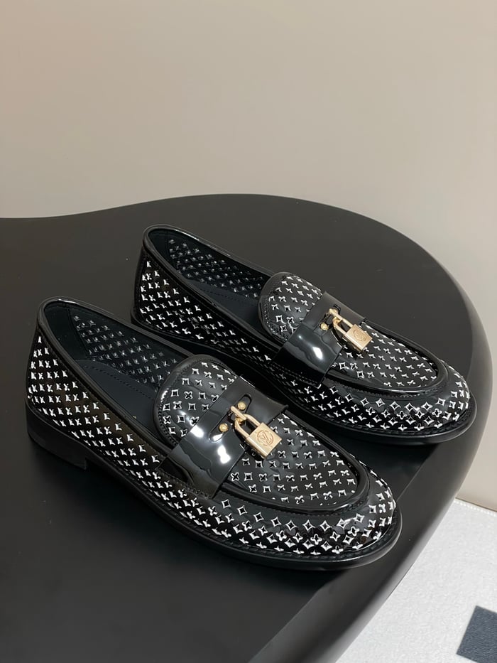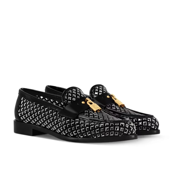 Home Shop Shoes Louis Vuitton Shoes Louis Vuitton Chess Flat Loafer Black Monogram Embroidered with Gold Padlock 1AGXRV