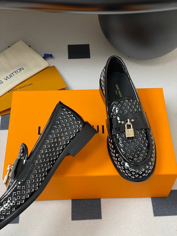 Statement Louis Vuitton Lock It Loafer in black embroidered monogram. Features gold-tone padlock detail, calf leather trim, and sleek slip-on silhouette. A bold fusion of classic and contemporary LV style.