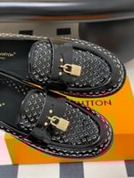 Statement Louis Vuitton Lock It Loafer in black embroidered monogram. Features gold-tone padlock detail, calf leather trim, and sleek slip-on silhouette. A bold fusion of classic and contemporary LV style.