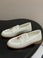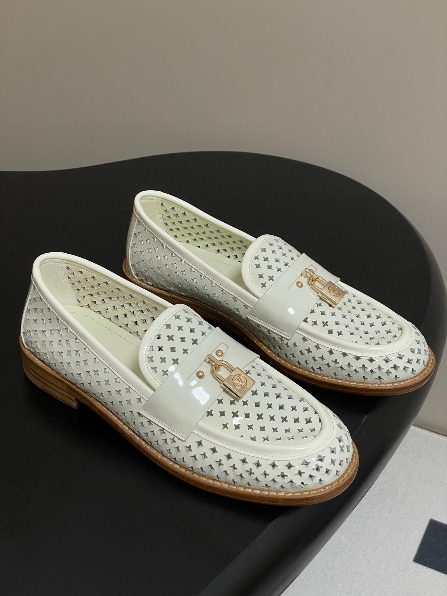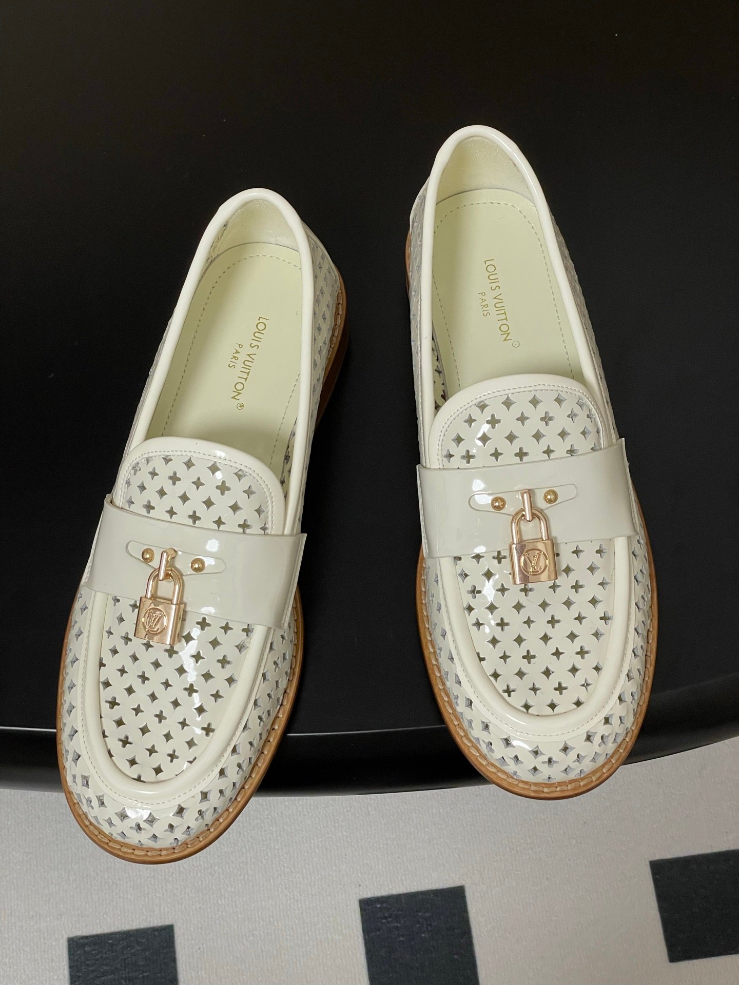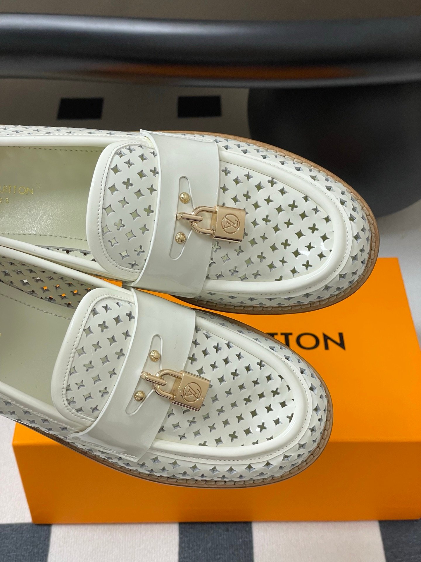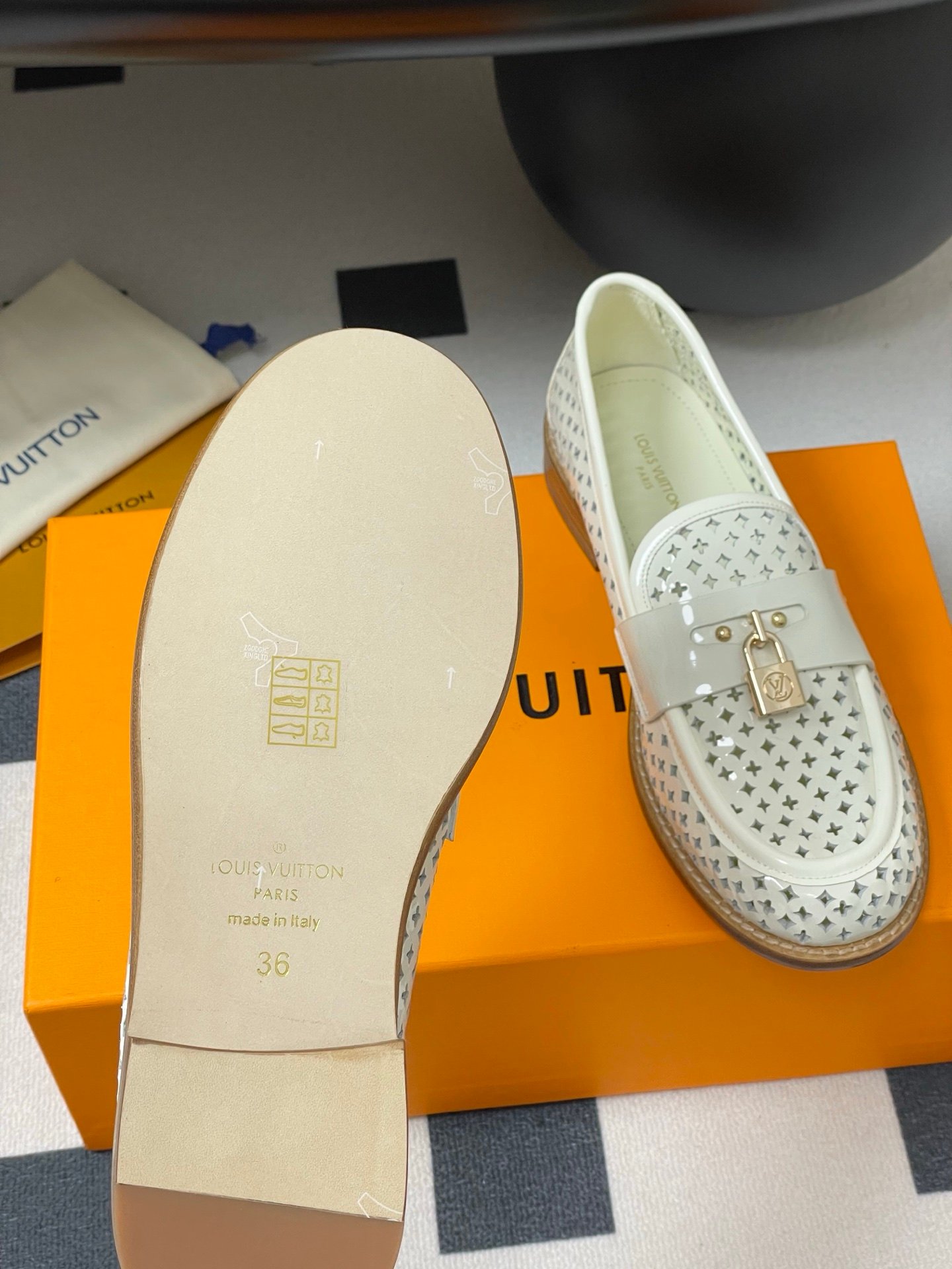 Louis Vuitton Chess Flat Loafer White Monogram Embroidered with Gold Padlock 1AGXRV