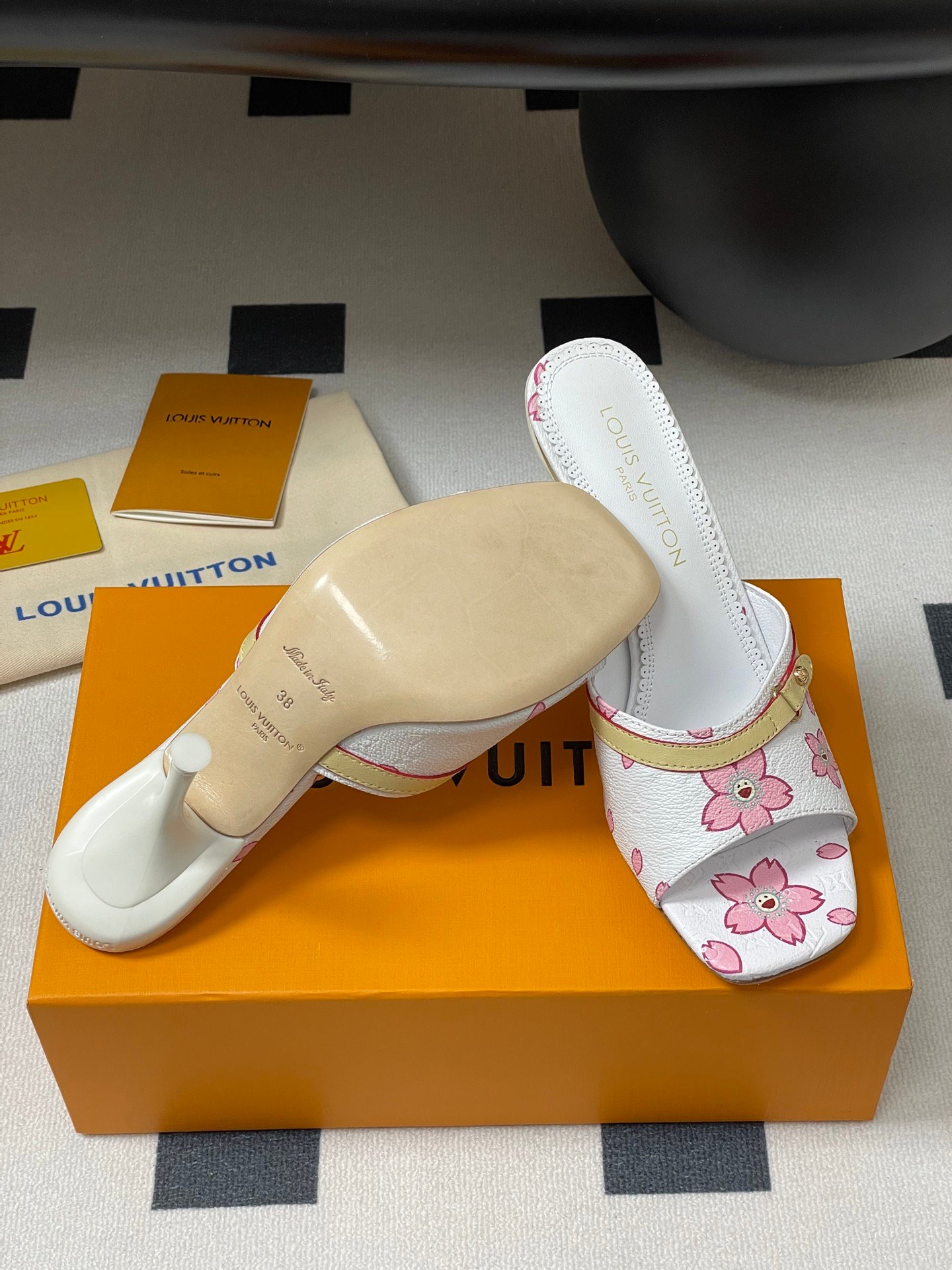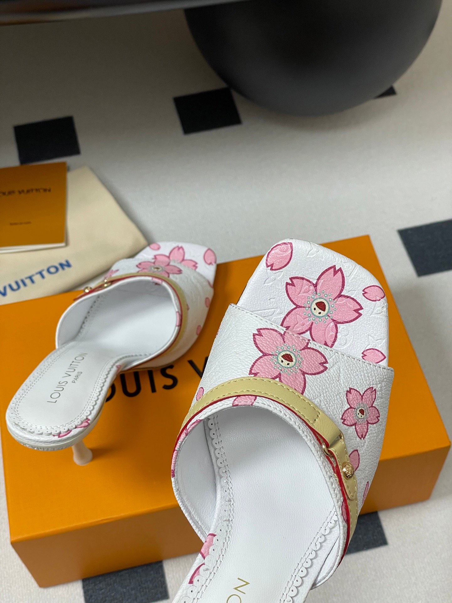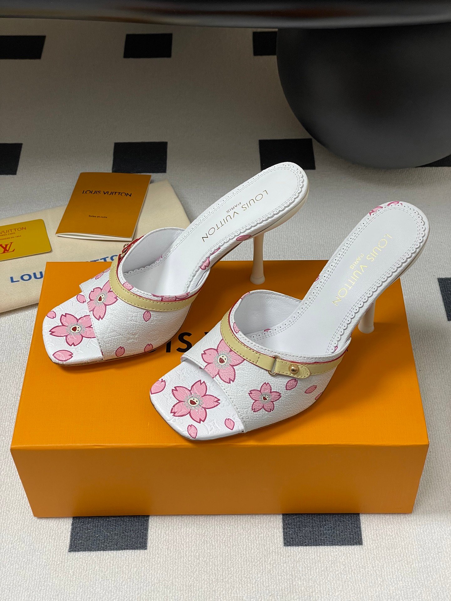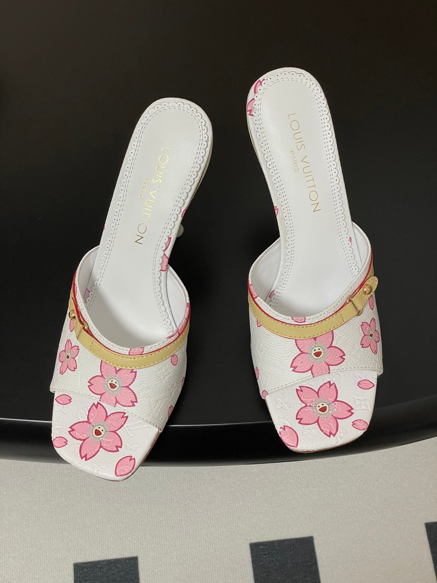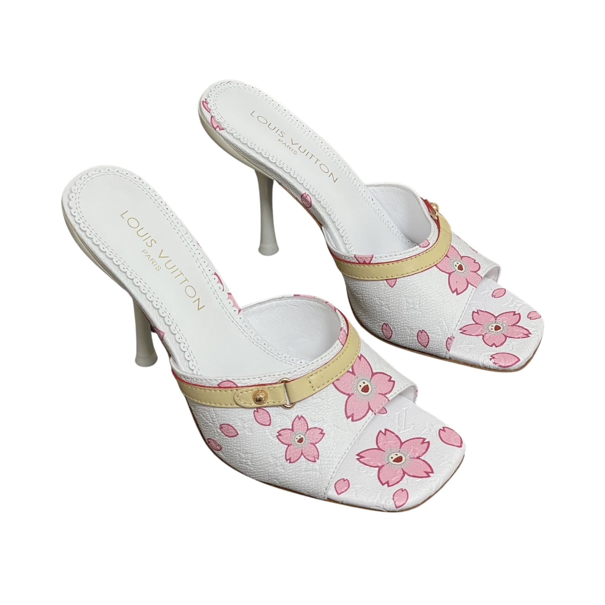 Iconic Louis Vuitton x Murakami Cherry Blossom Mule in white monogram canvas. Features pink sakura floral print, yellow leather strap, and open toe design. Rare Y2K collectible.
