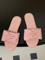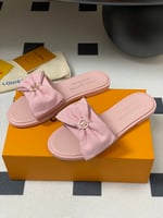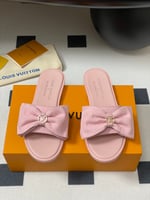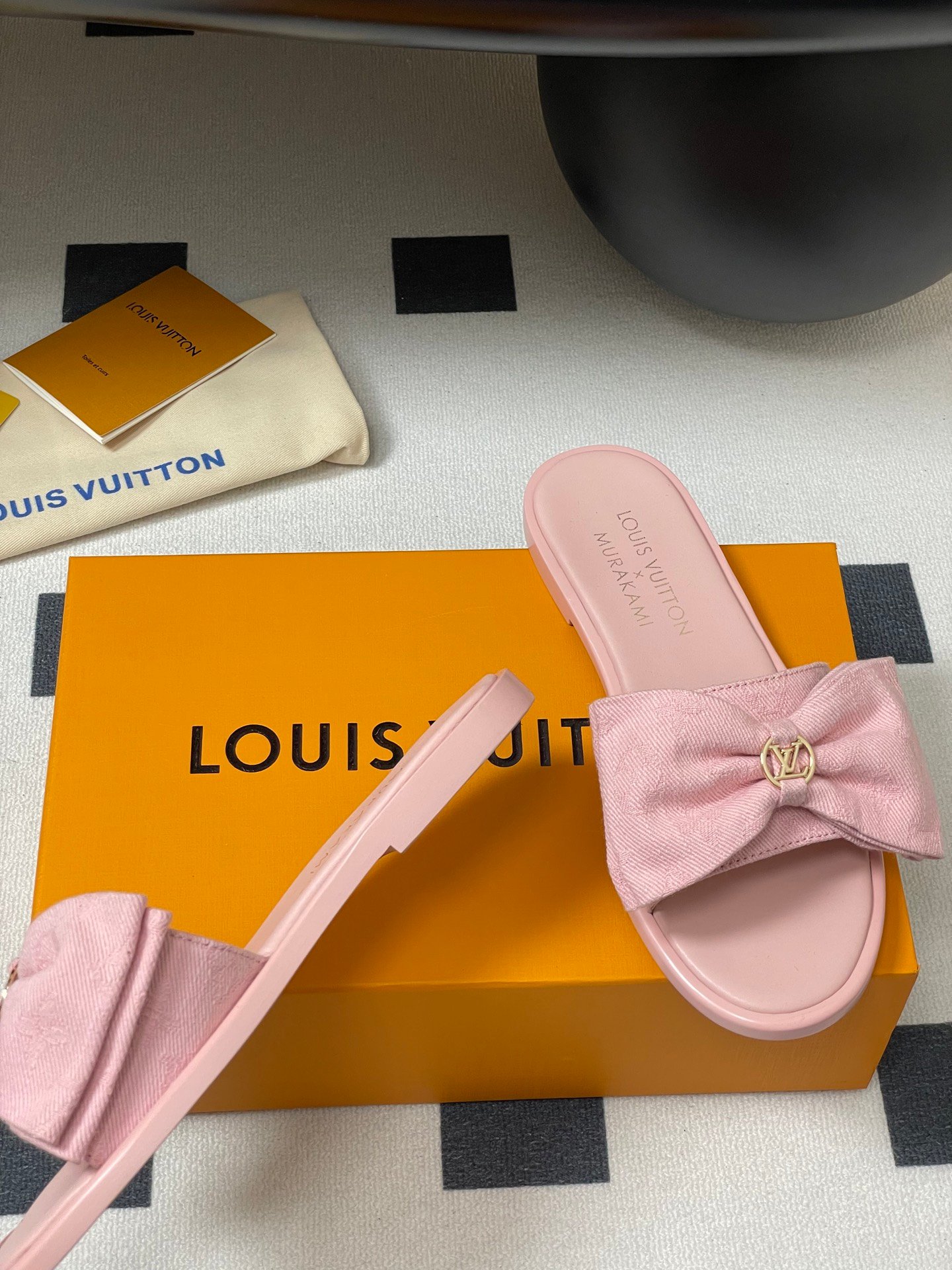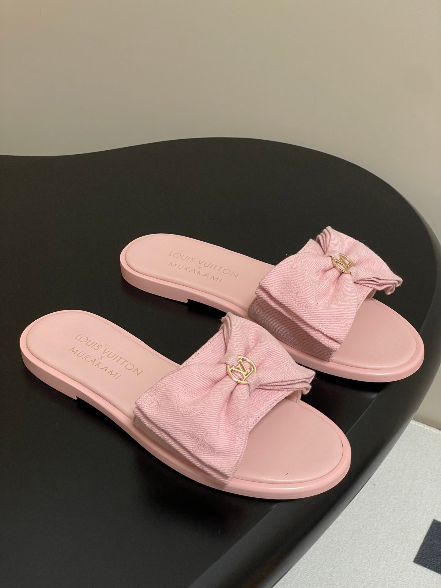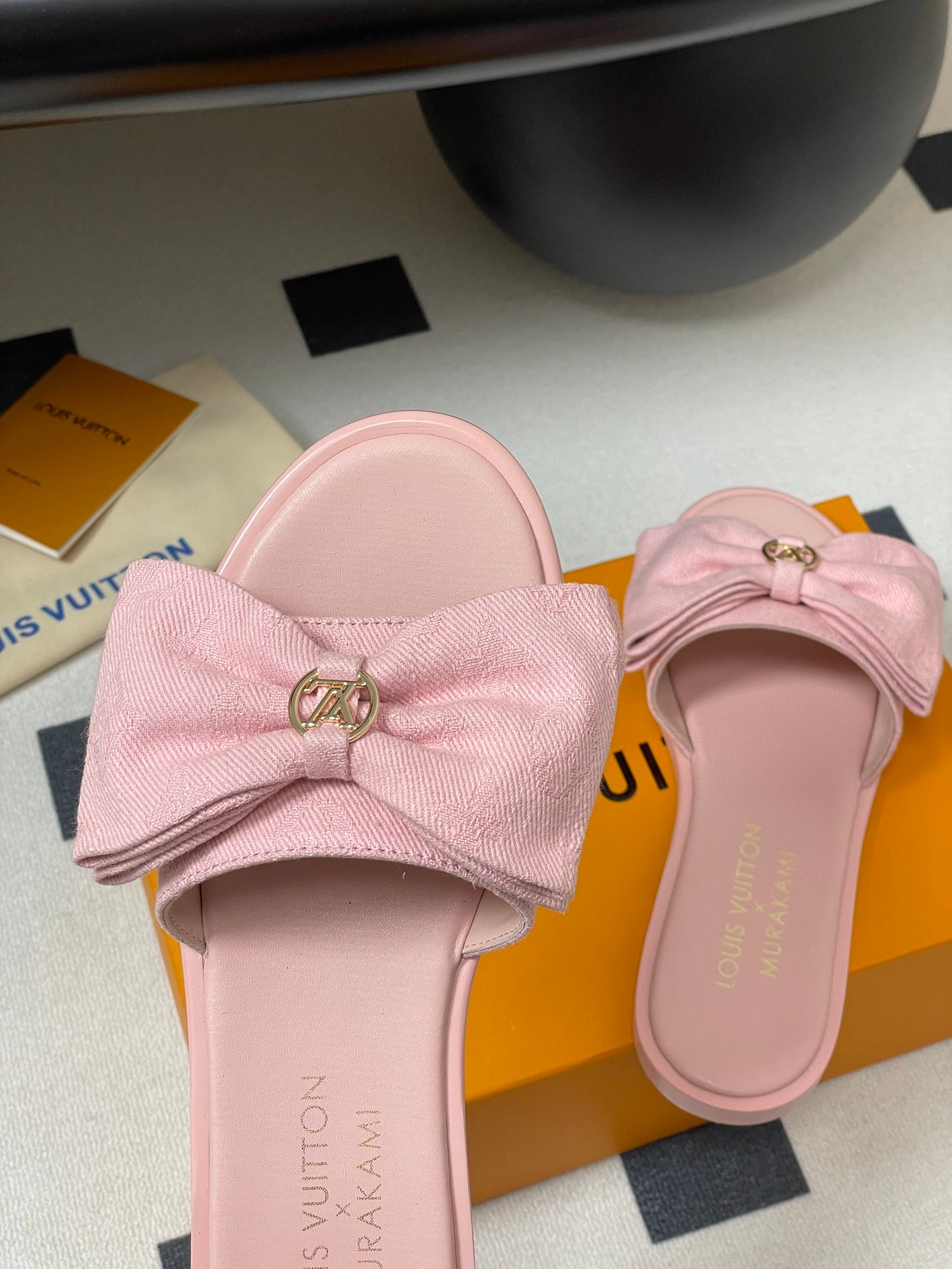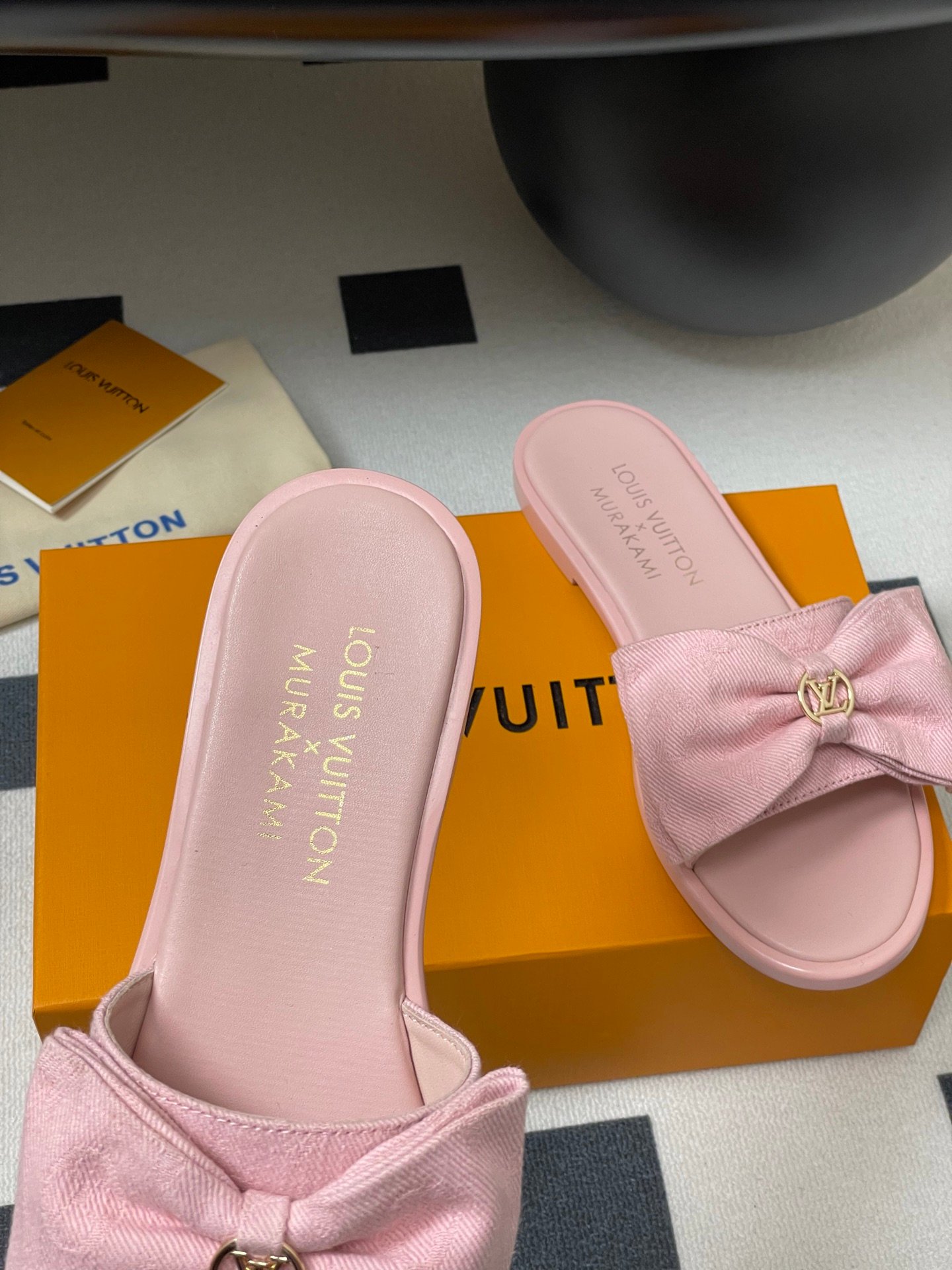 Rare Louis Vuitton x Murakami slide sandals featuring black multicolor monogram canvas and oversized bow with gold LV logo charm. A standout piece from the iconic Y2K collaboration.