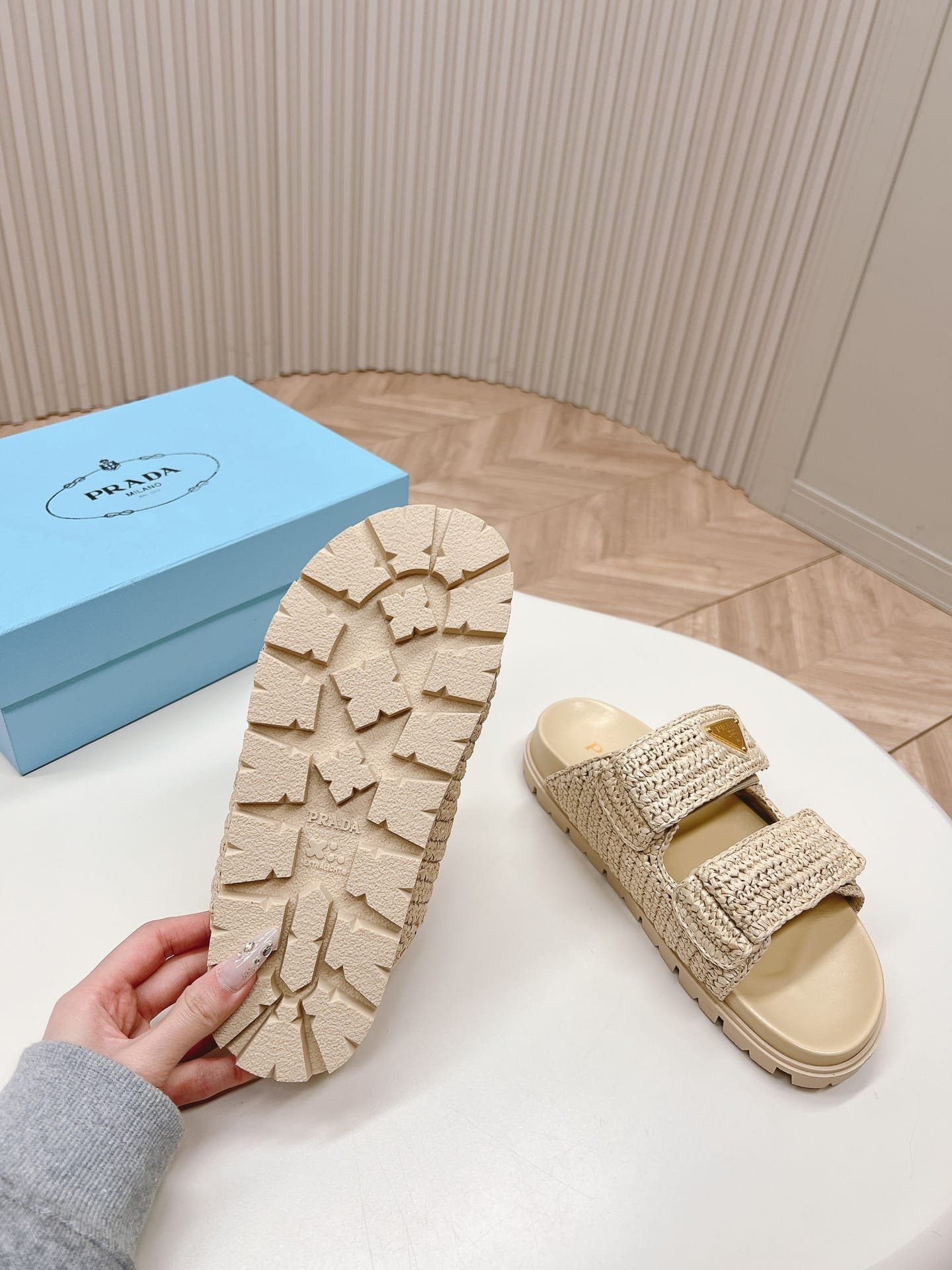 Prada Fussbett Raffia Dual Buckle Slide Sandals Beige