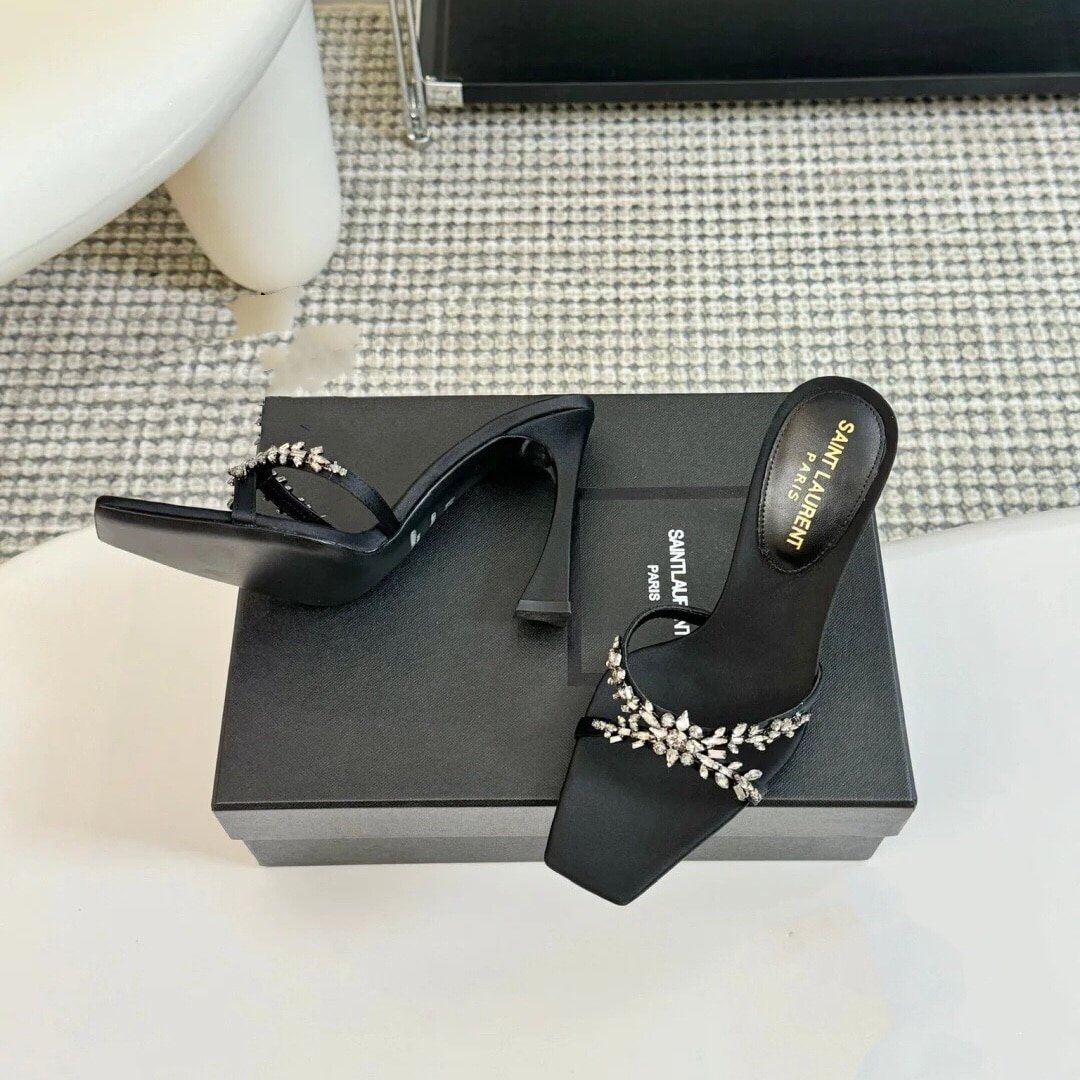 Saint Laurent Liz Mules In Satin And Rhinestones Black