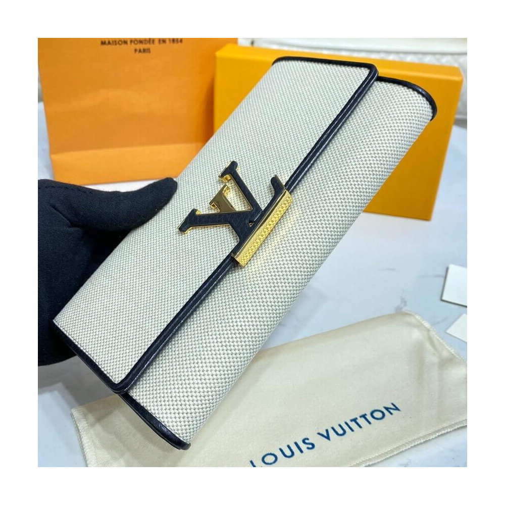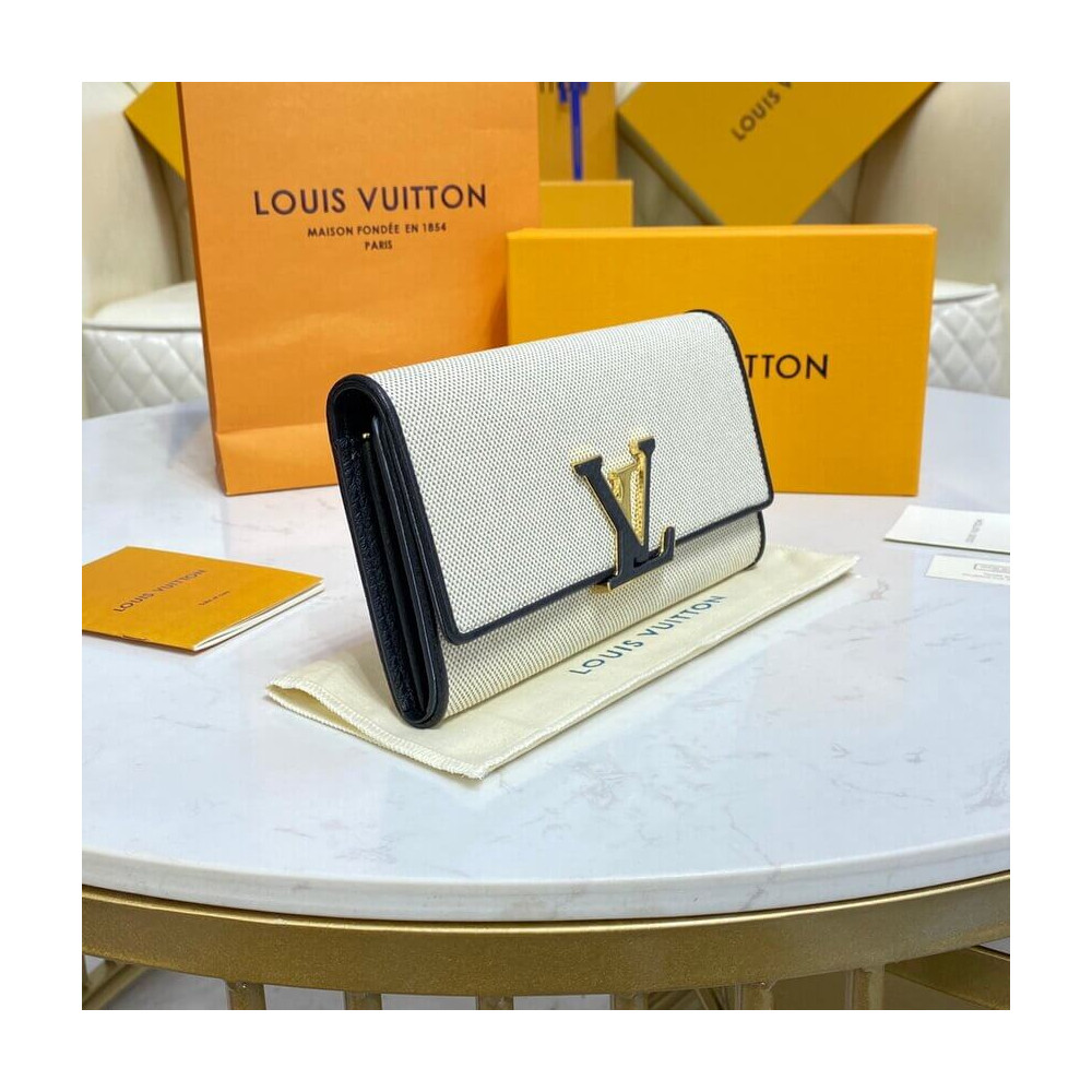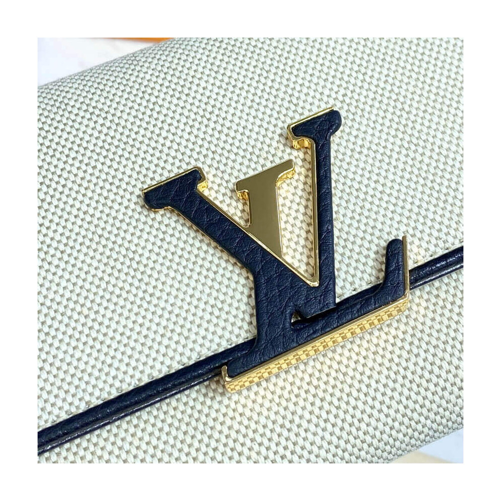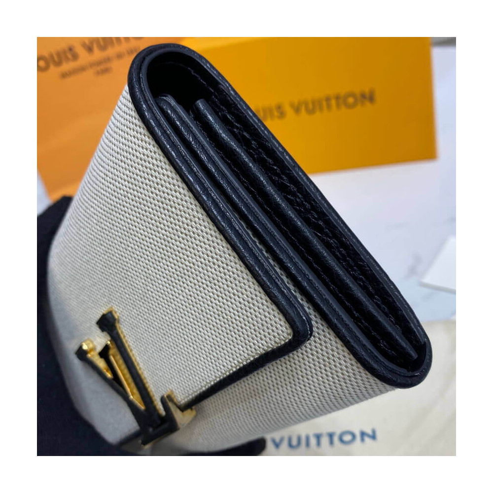 This refined interpretation of the Capucines wallet combines natural canvas with black leather trim. The LV Initials closure, which is the signature of the Capucines line, is partially covered in leather. This classic flap wallet opens to reveal a variety of pockets, compartments and card slots.
