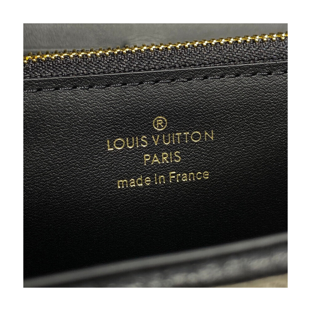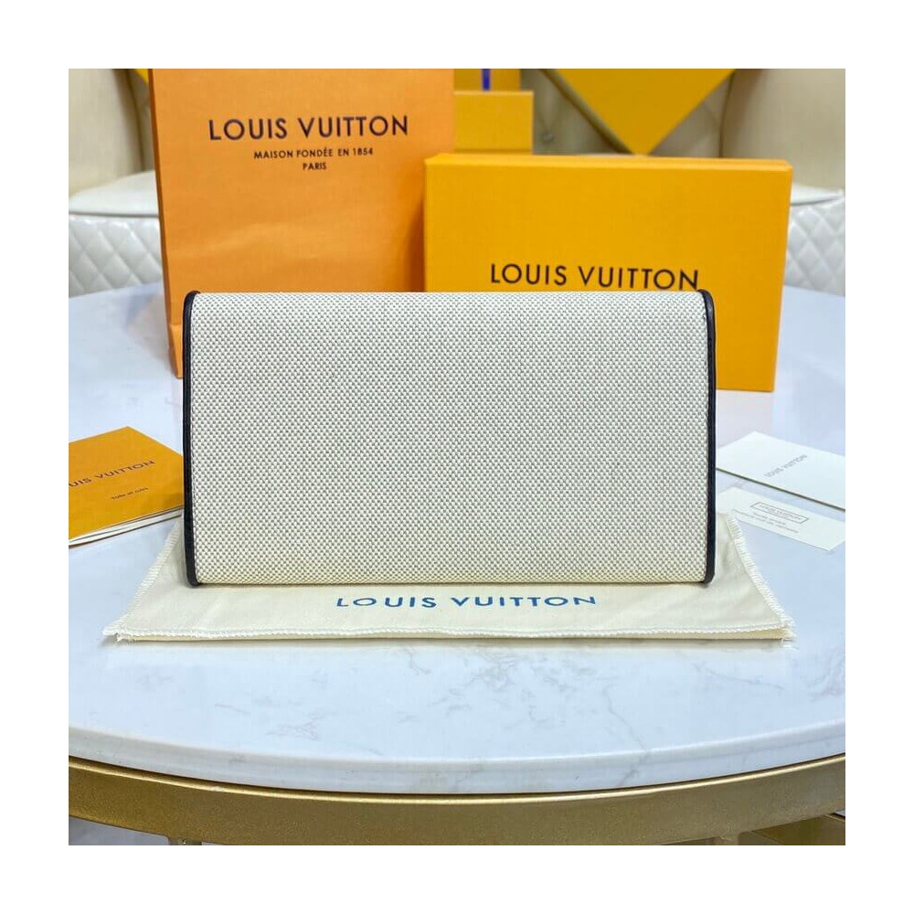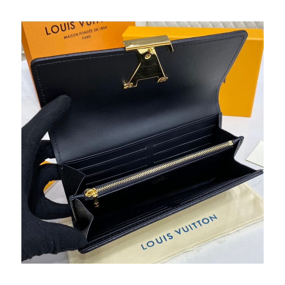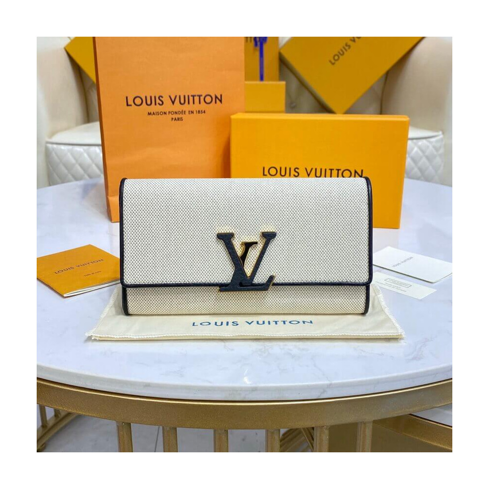 This refined interpretation of the Capucines wallet combines natural canvas with black leather trim. The LV Initials closure, which is the signature of the Capucines line, is partially covered in leather. This classic flap wallet opens to reveal a variety of pockets, compartments and card slots.